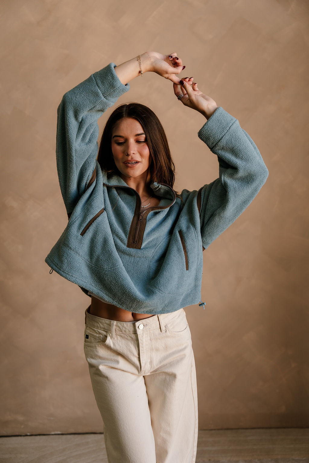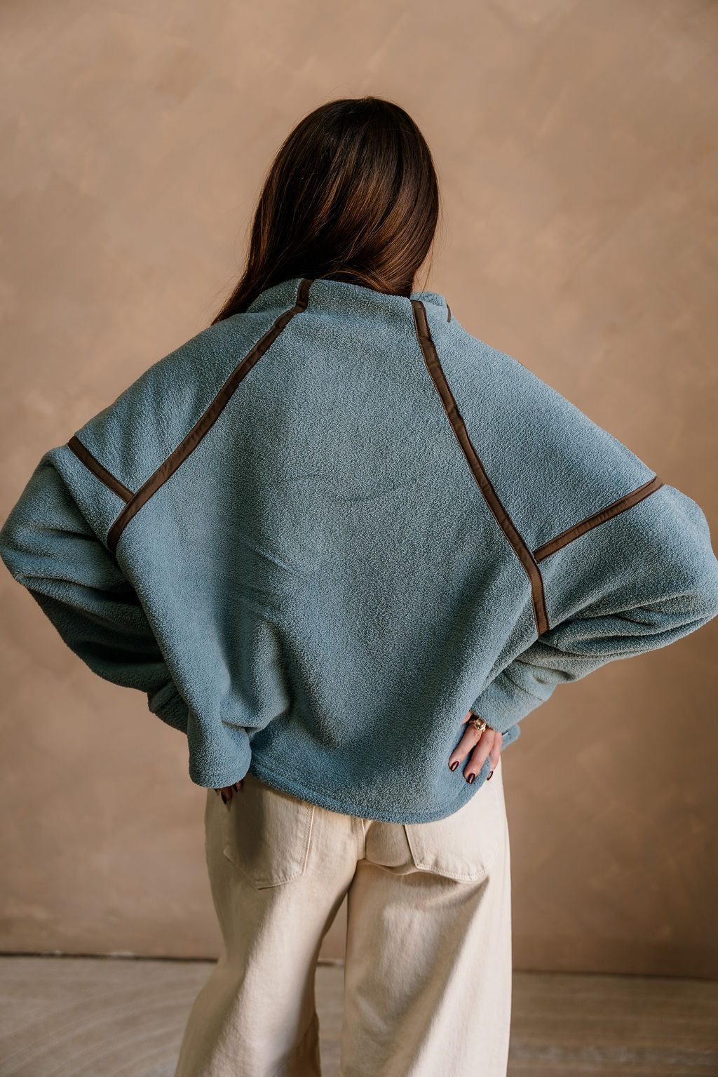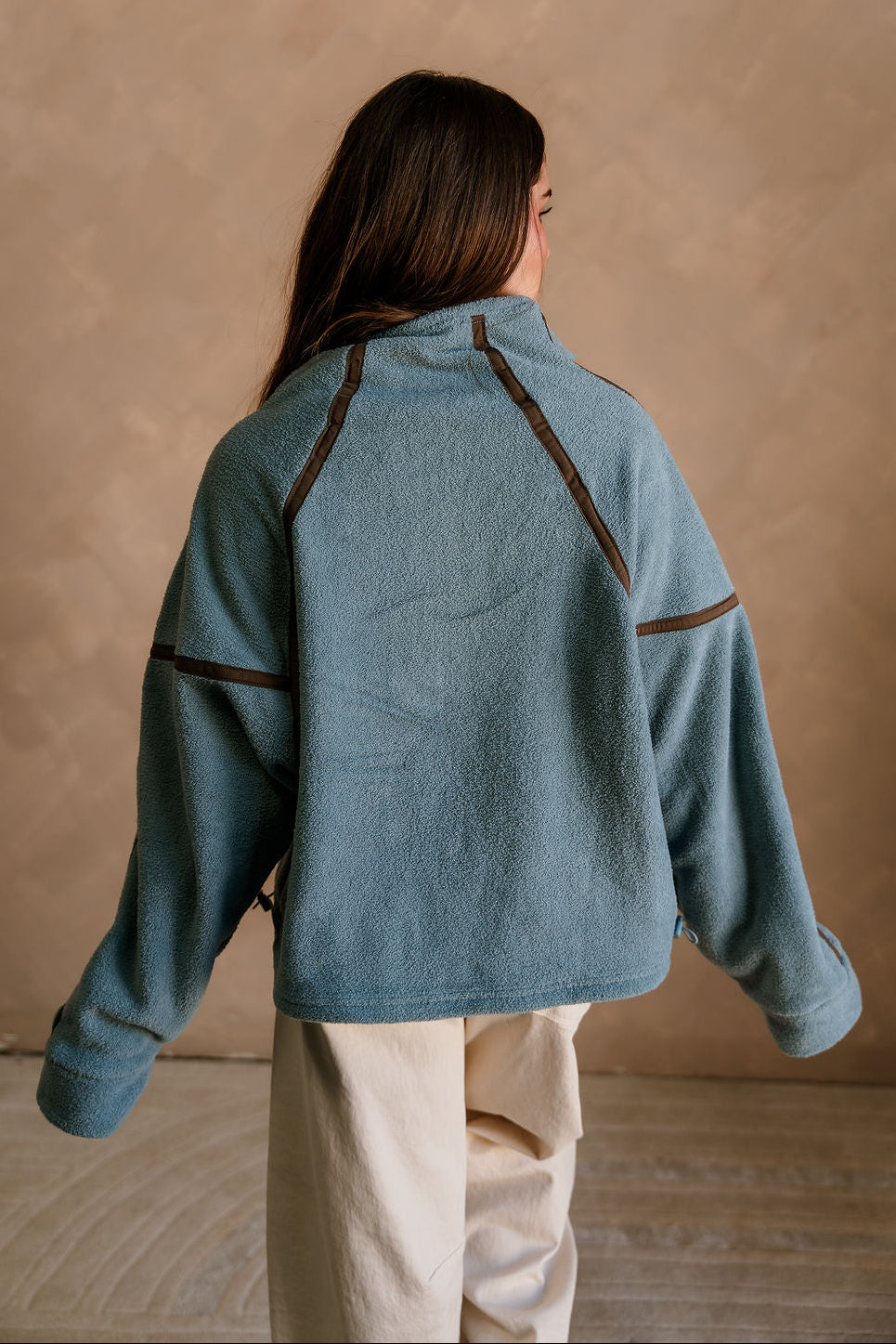 The Gia Blue & Brown Quarter Zip Pullover delivers warm, cozy comfort with a stylish color contrast. Crafted from soft slate blue fleece fabric, this pullover feels plush and lightweight while offering plenty of warmth. Brown trim details and a coordinating brown quarter zip-up add a rich, earthy accent that elevates the look. The high neckline, dropped shoulders, and long sleeves create that relaxed, easygoing fit perfect for everyday wear.