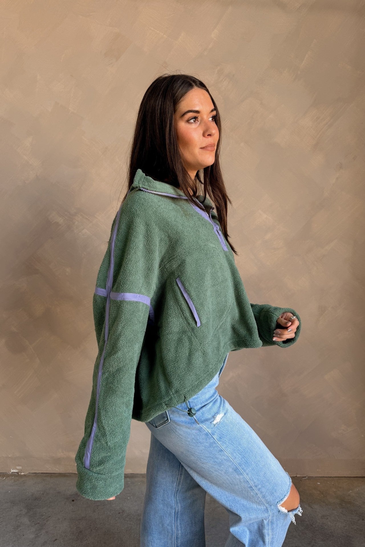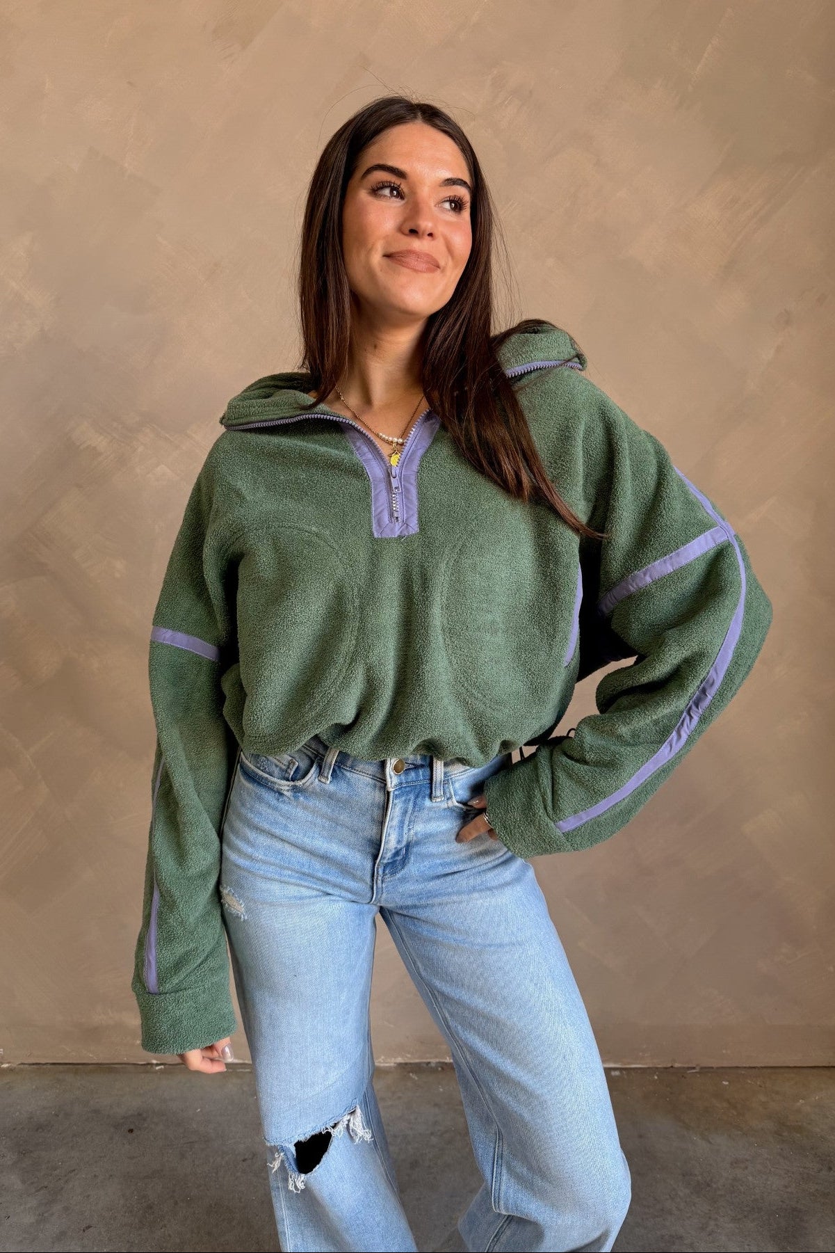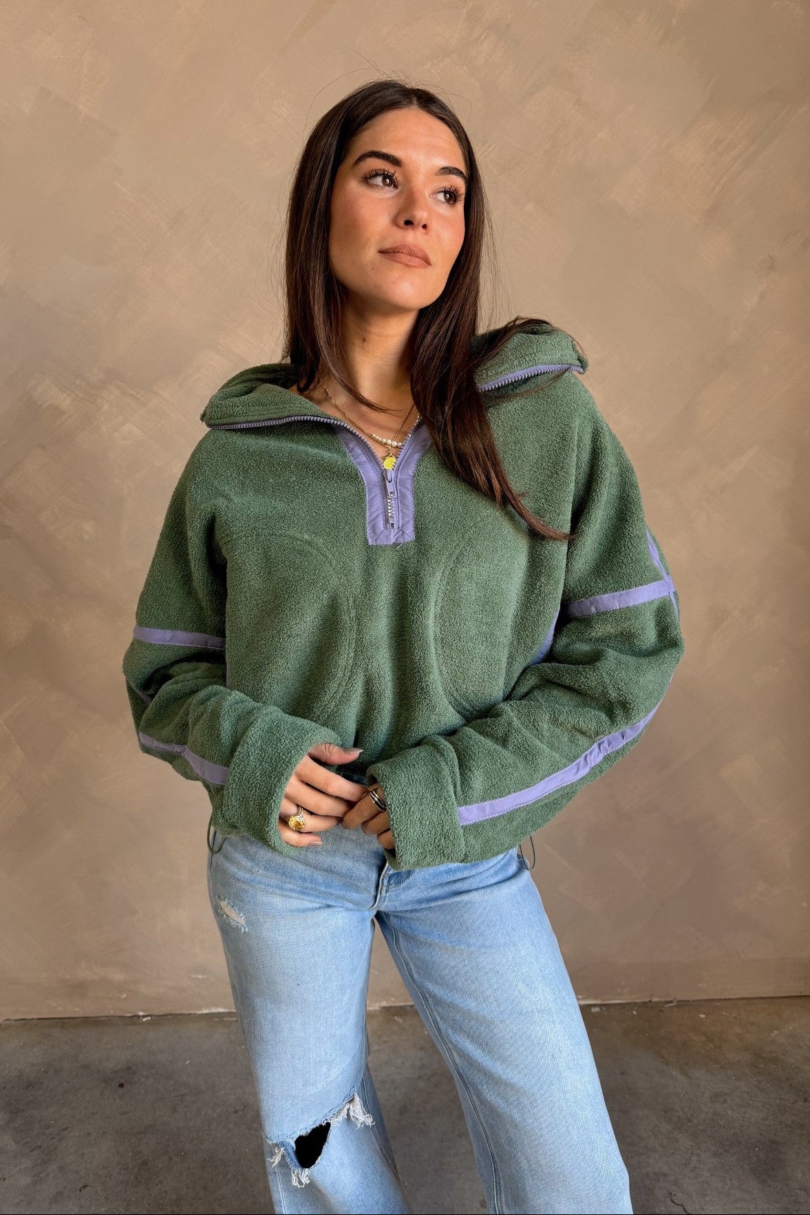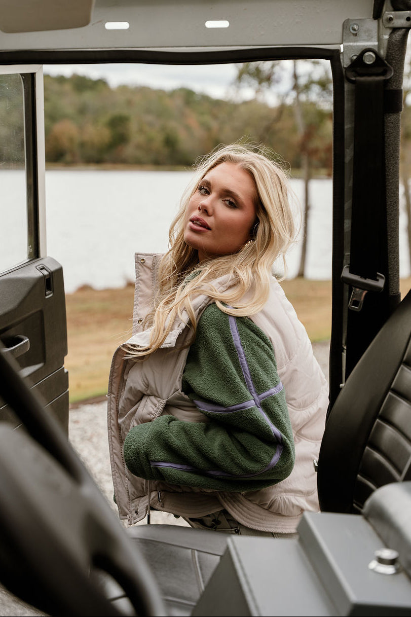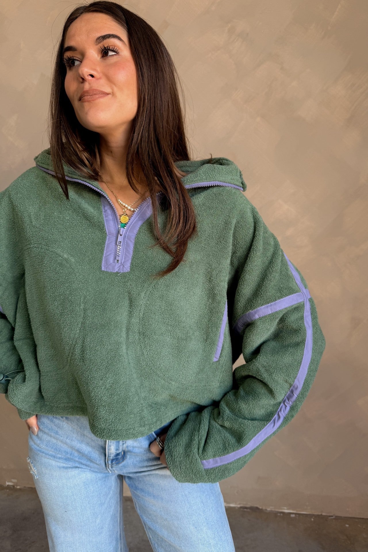 Fresh color meets cozy functionality in the Gia Green & Lavender Quarter Zip Pullover. Designed with a soft textured green fleece fabric that feels soft yet substantial, this pullover brings an elevated, sporty vibe to your everyday style. A contrasting lavender trim adds a playful touch of color, while the quarter zip and high neckline offer customizable comfort — zip up for warmth or wear open for a relaxed, casual look.