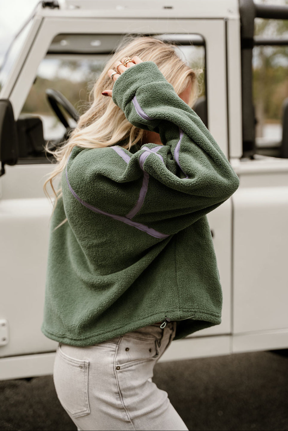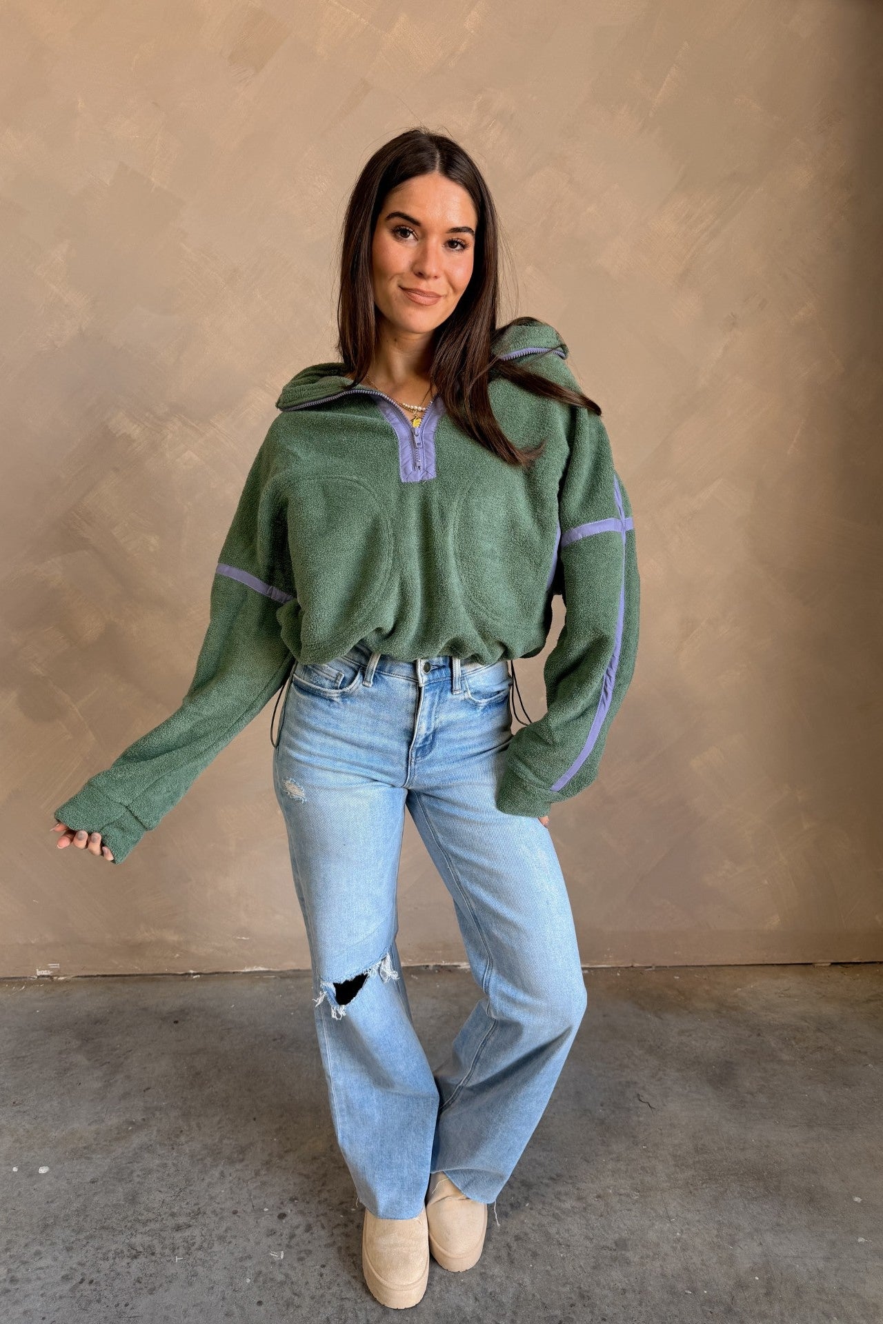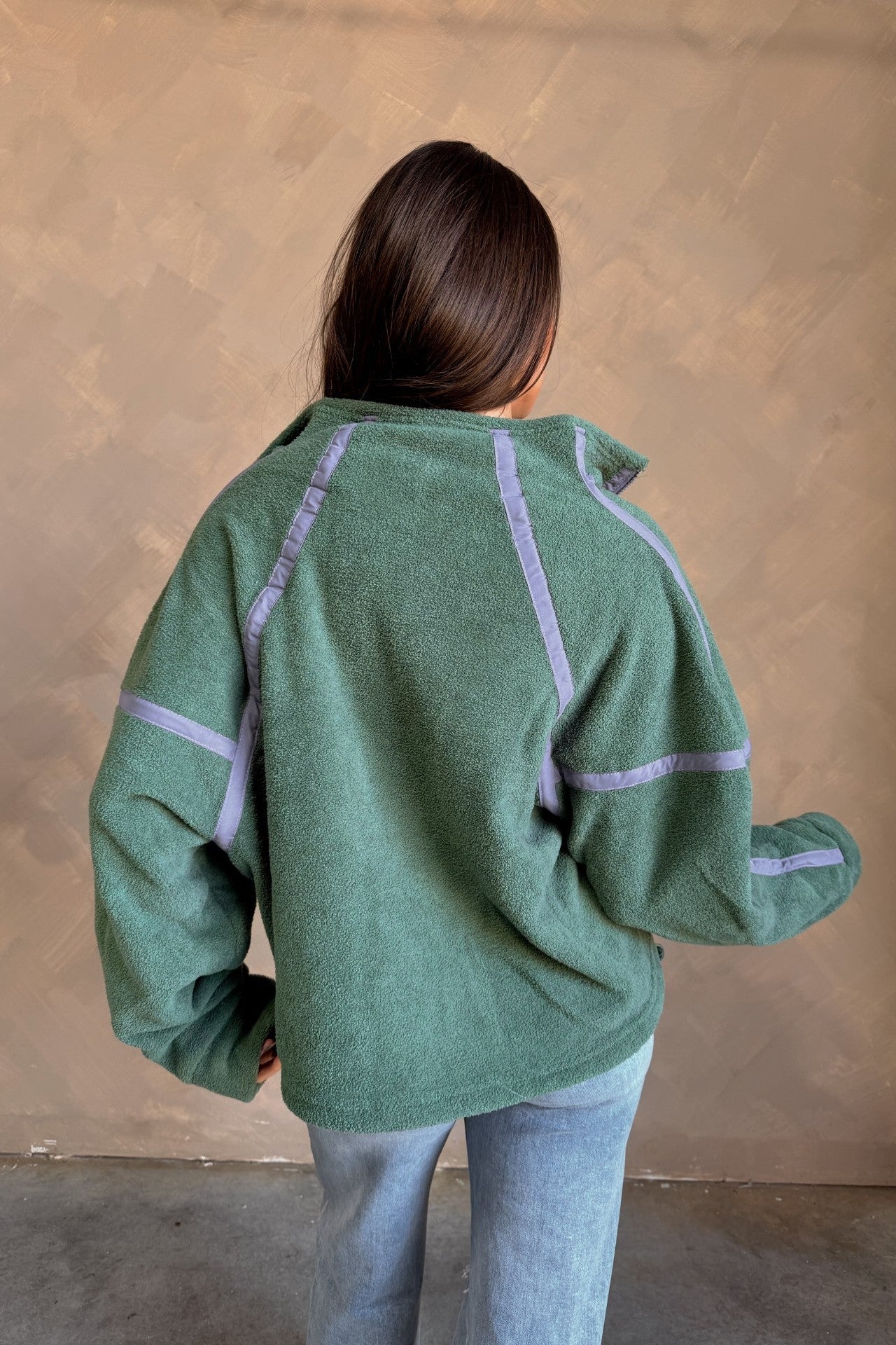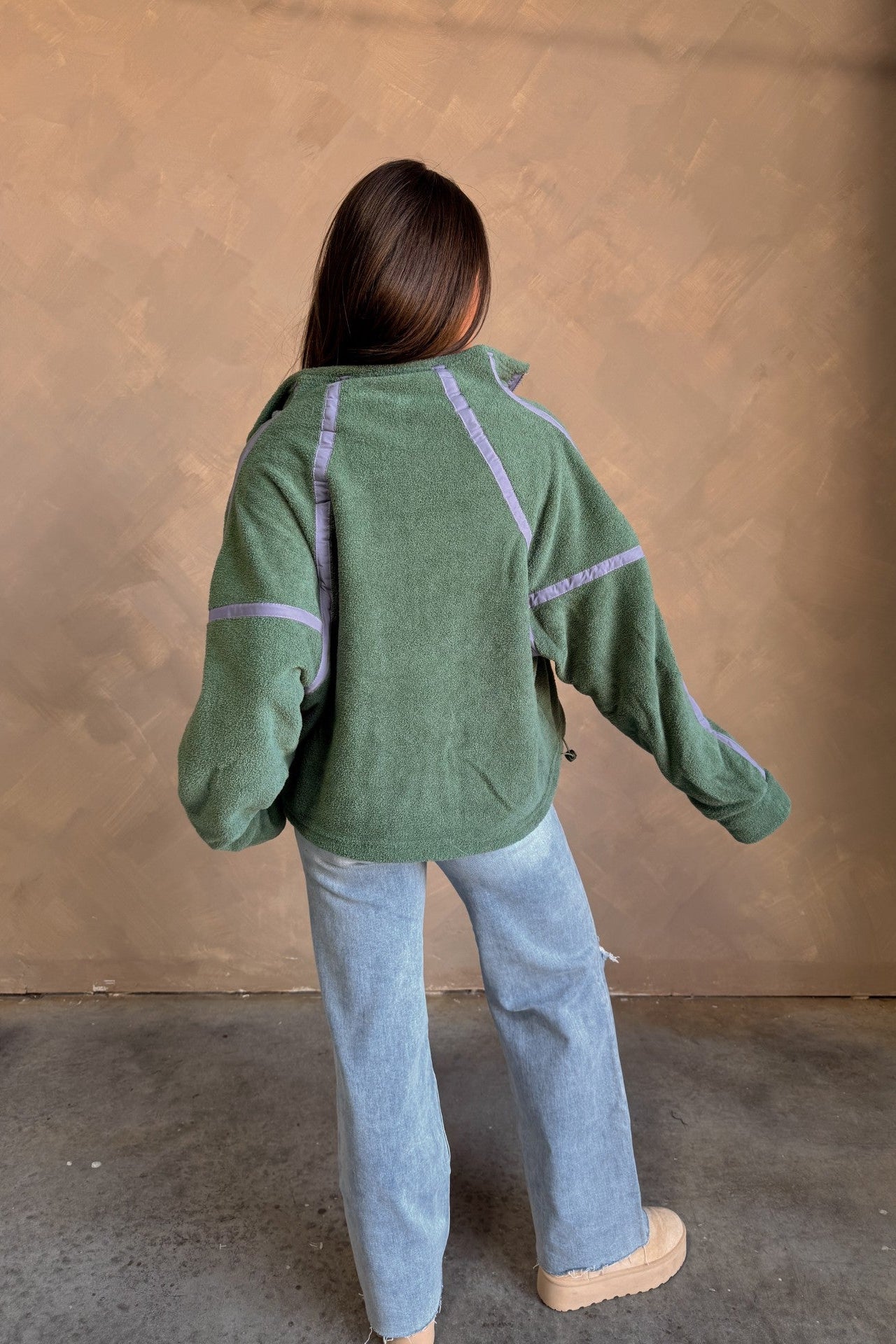 Fresh color meets cozy functionality in the Gia Green & Lavender Quarter Zip Pullover. Designed with a soft textured green fleece fabric that feels soft yet substantial, this pullover brings an elevated, sporty vibe to your everyday style. A contrasting lavender trim adds a playful touch of color, while the quarter zip and high neckline offer customizable comfort — zip up for warmth or wear open for a relaxed, casual look.