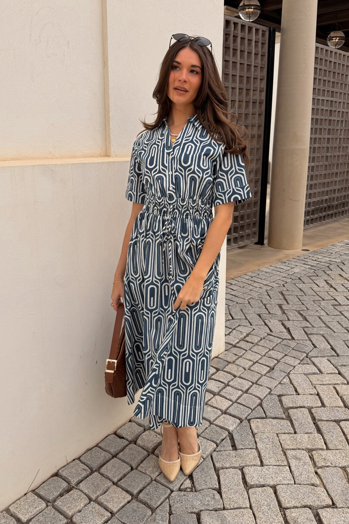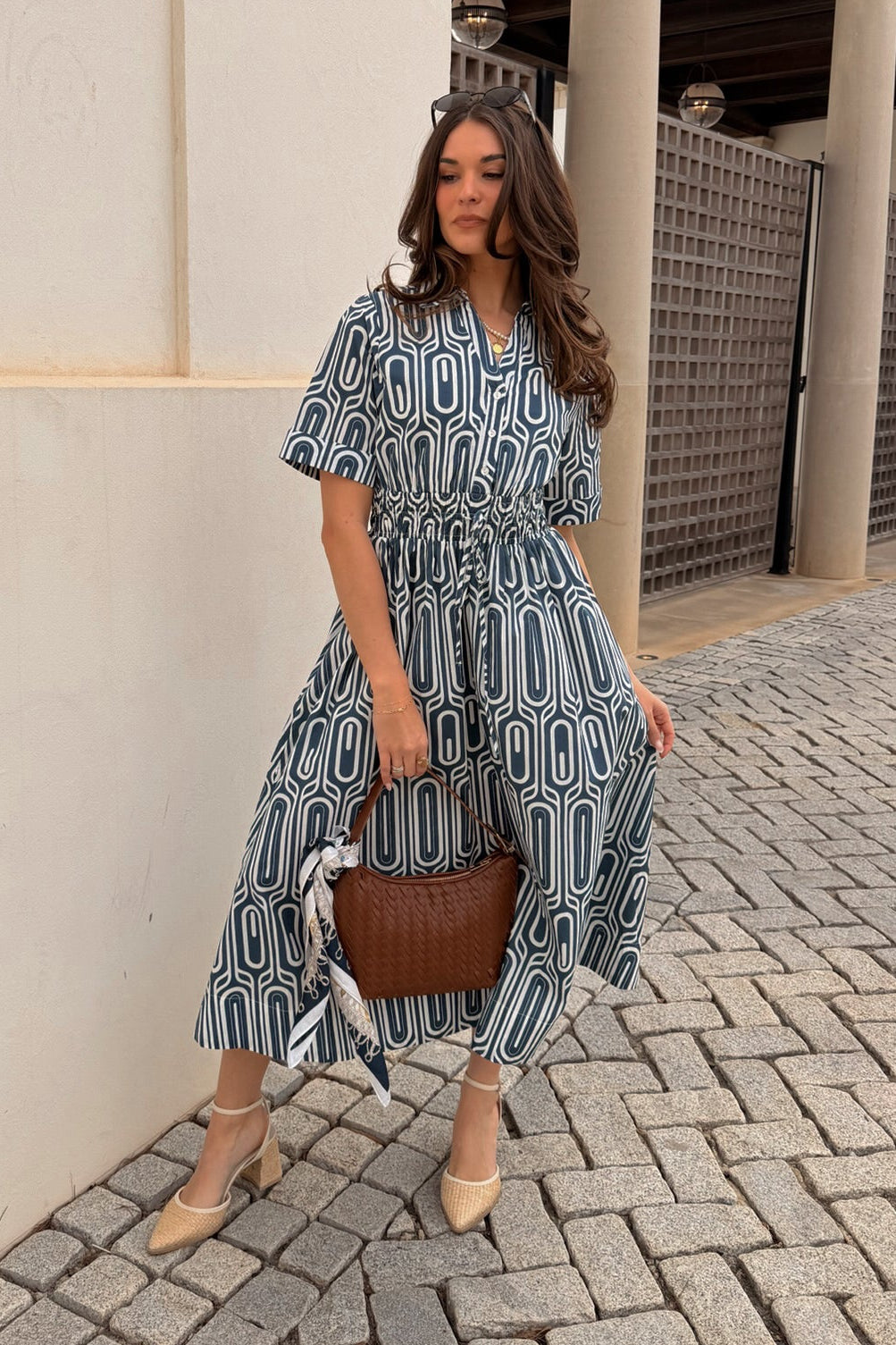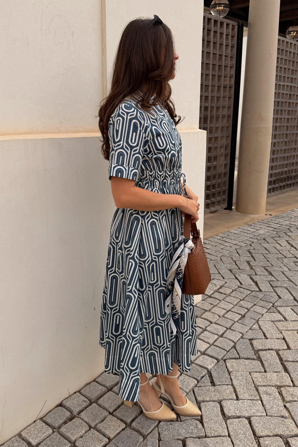 Effortlessly stylish and easy to wear, the Gina Navy & White Printed Midi Dress is a go-to piece for everyday polish. Designed in lightweight navy and white fabric with a chic geometric pattern, this dress offers a timeless look with a comfortable, flattering fit. The midi length adds versatility, making it perfect for workdays, brunch dates, or casual evenings out.