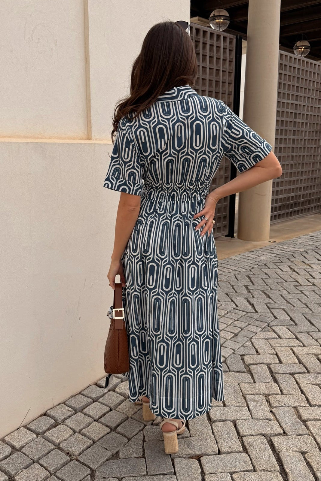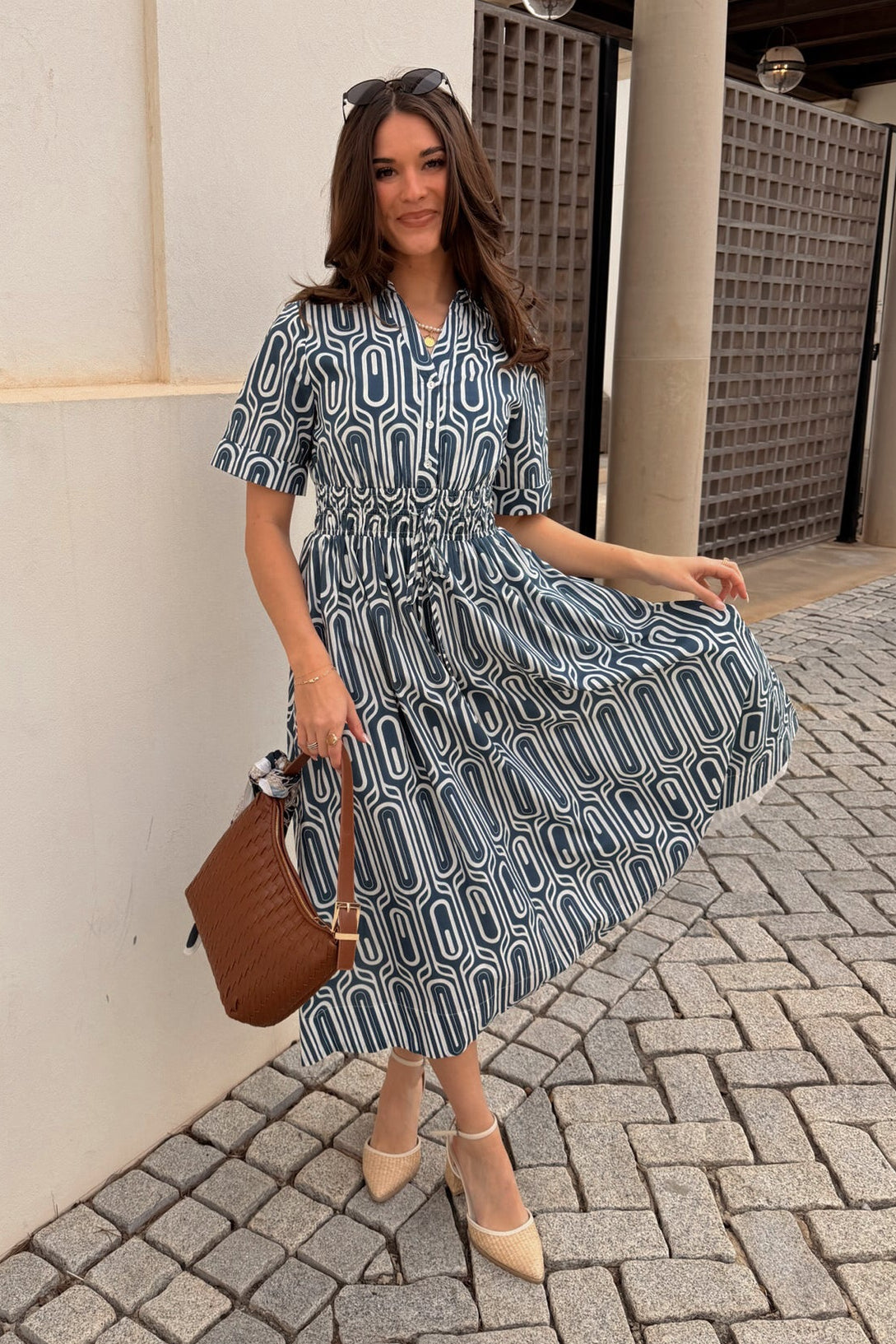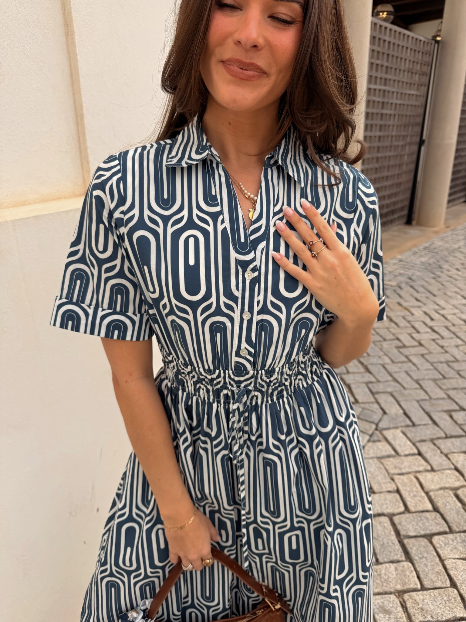 Effortlessly stylish and easy to wear, the Gina Navy & White Printed Midi Dress is a go-to piece for everyday polish. Designed in lightweight navy and white fabric with a chic geometric pattern, this dress offers a timeless look with a comfortable, flattering fit. The midi length adds versatility, making it perfect for workdays, brunch dates, or casual evenings out.