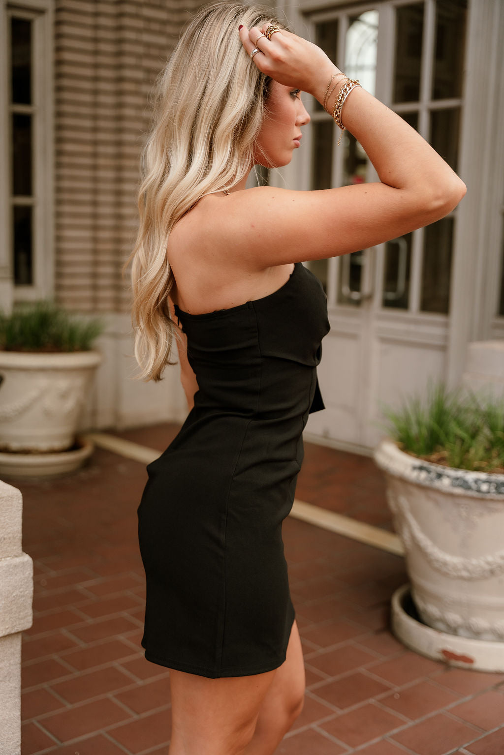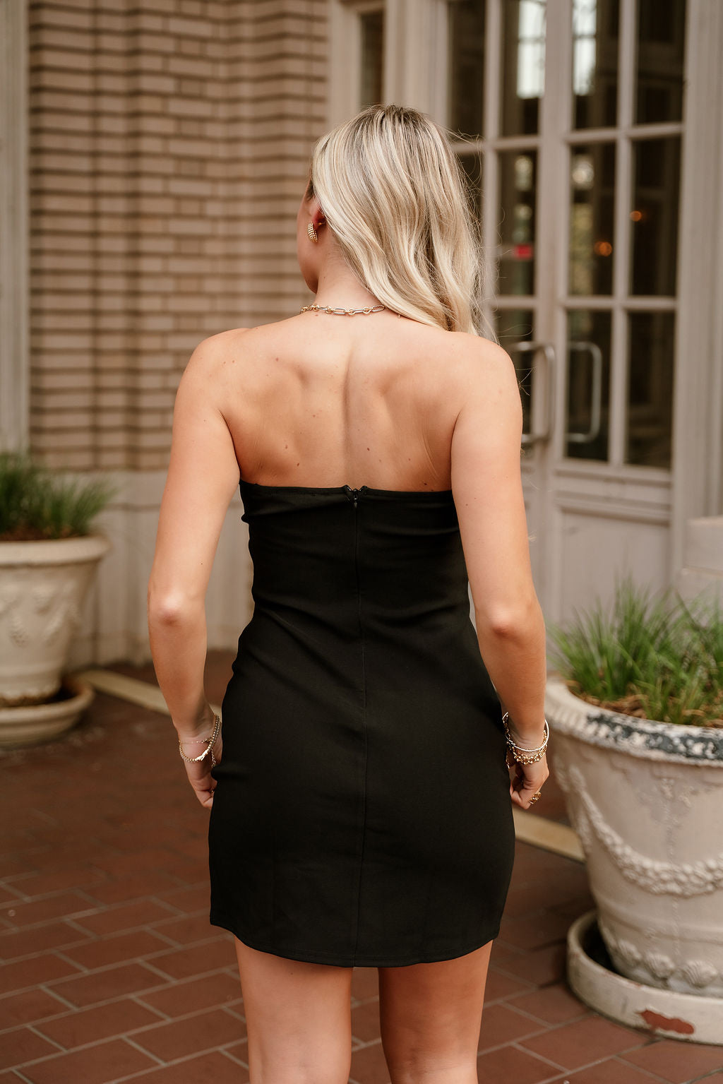 Perfect for nights out, special events, or any moment you want to shine, the Giselle Black Strapless Mini Dress flatters with its mini length and secure back zipper closure for a seamless fit. Its chic design and standout accents make it an effortless statement piece - pair it with your favorite heels and gold accessories for a fully polished, head-turning ensemble.