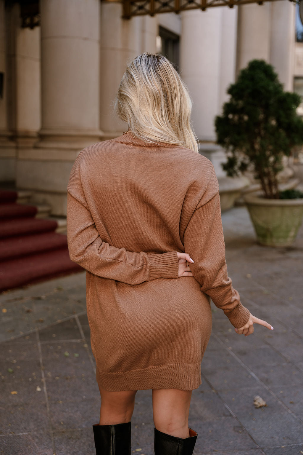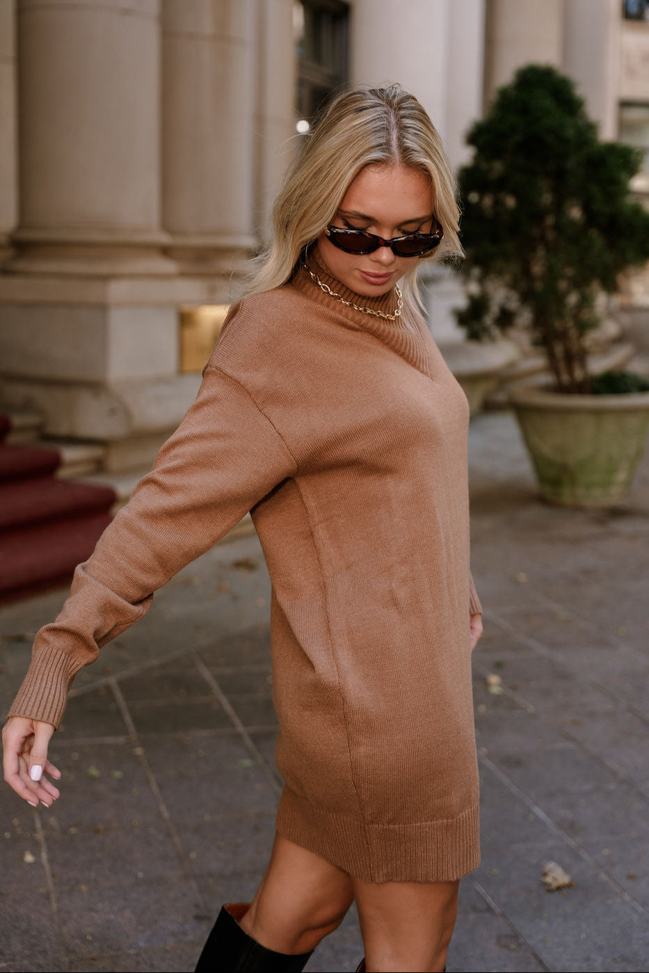 The Harlow Light Brown Sweater Dress is the perfect blend of cozy and sophisticated. Crafted from soft light brown knit fabric, it features a chic high cross-over neckline that adds a modern touch to its classic silhouette. The ribbed hem provides subtle texture and structure, while the long sleeves and mini length create a flattering, balanced look. Effortlessly stylish, the Harlow dress transitions seamlessly from day to night with just a change of accessories.
