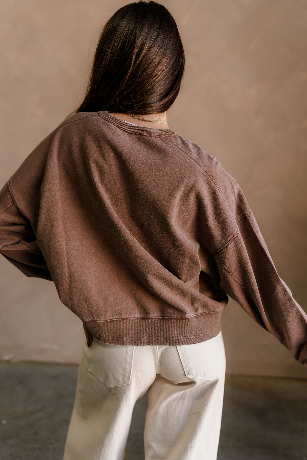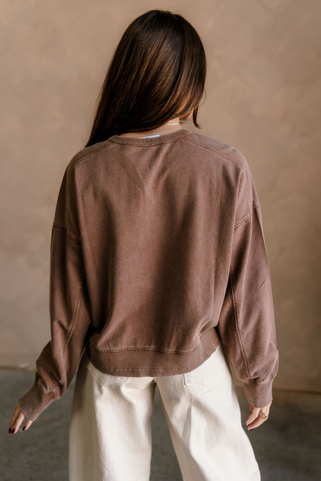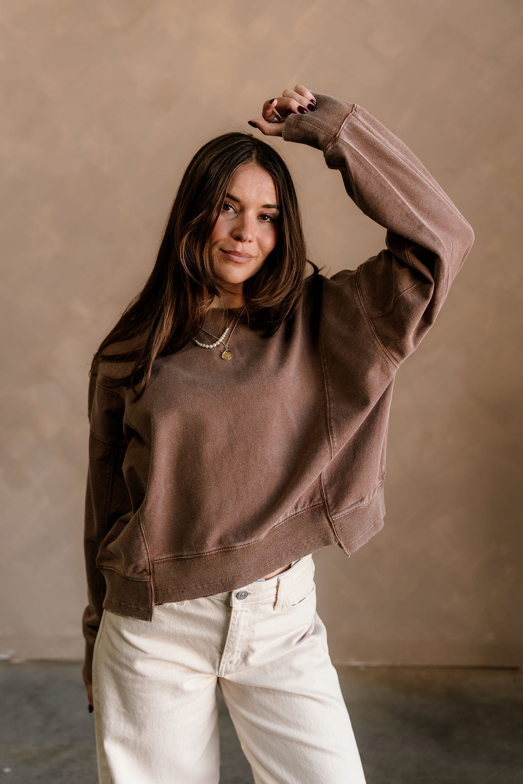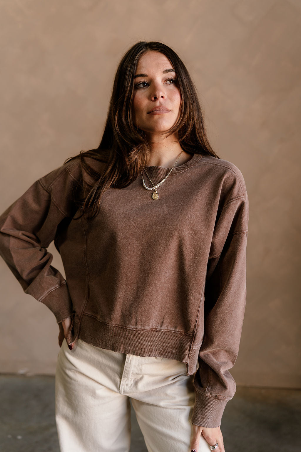 The Harper Washed Brown Long Sleeve Sweatshirt is crafted from soft washed brown cotton fabric, giving it that perfectly broken-in feel you’ll love from the first wear. Designed with a relaxed silhouette, it features dropped shoulders and long sleeves that add an effortless, laid-back drape. The round neckline keeps the look clean and classic, making it a versatile staple for your everyday wardrobe.