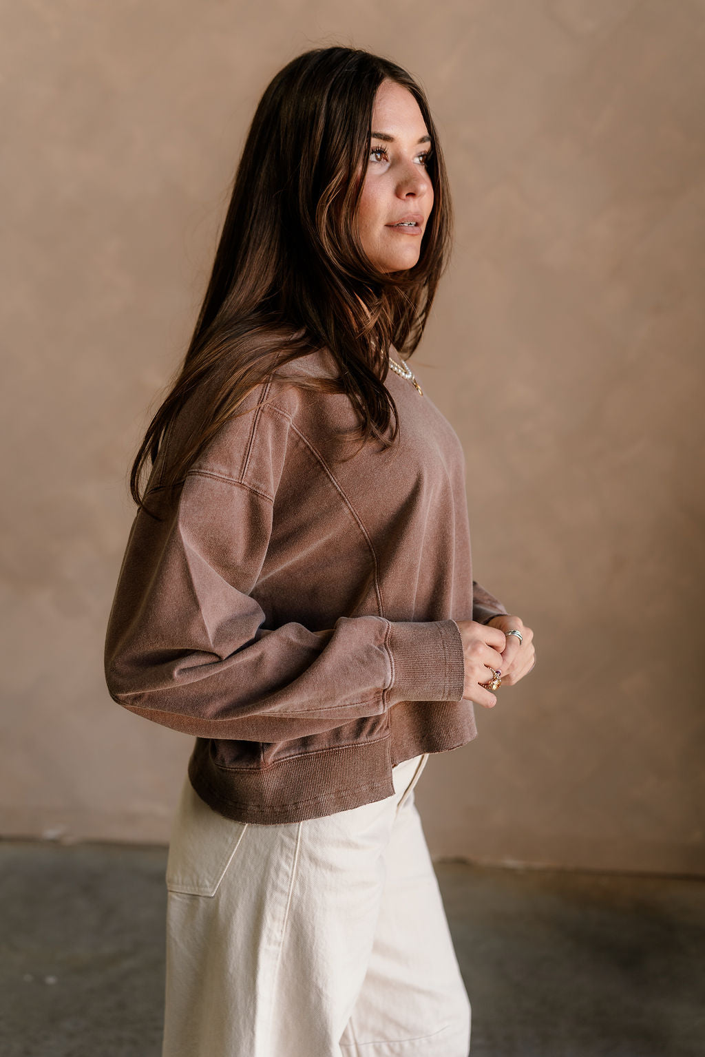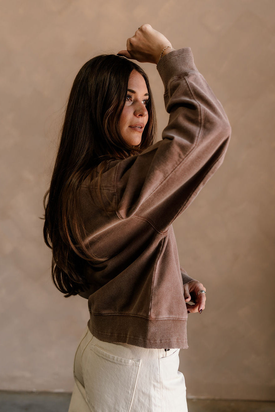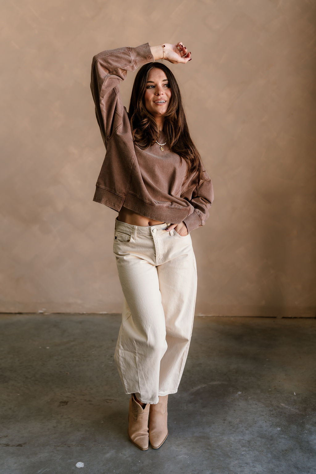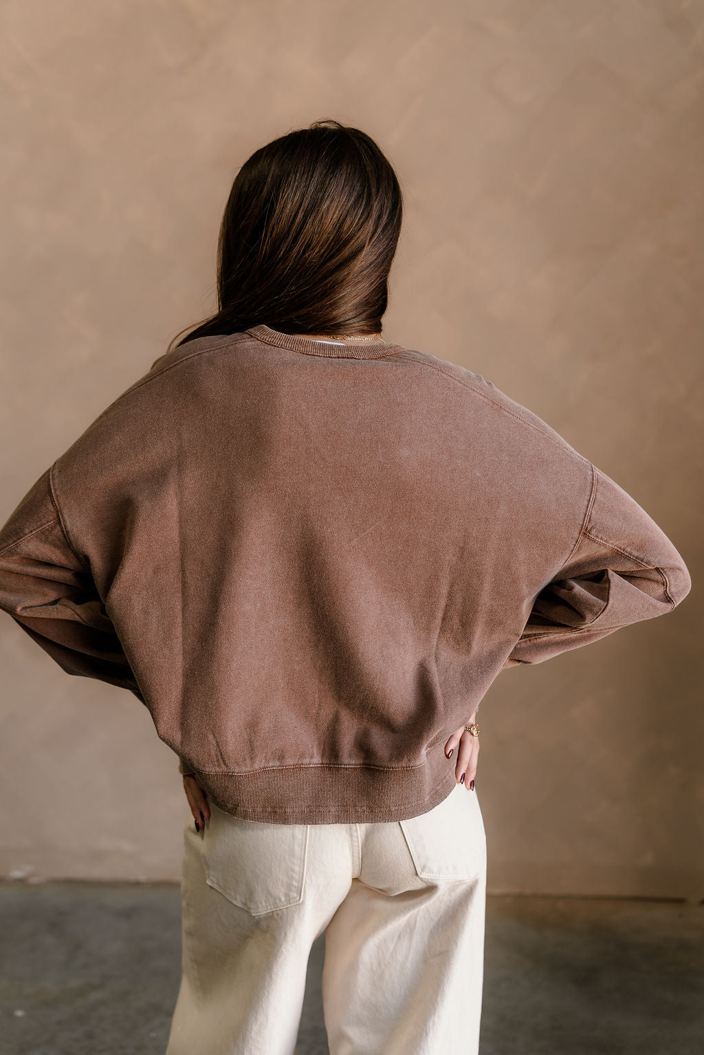 The Harper Washed Brown Long Sleeve Sweatshirt is crafted from soft washed brown cotton fabric, giving it that perfectly broken-in feel you’ll love from the first wear. Designed with a relaxed silhouette, it features dropped shoulders and long sleeves that add an effortless, laid-back drape. The round neckline keeps the look clean and classic, making it a versatile staple for your everyday wardrobe.