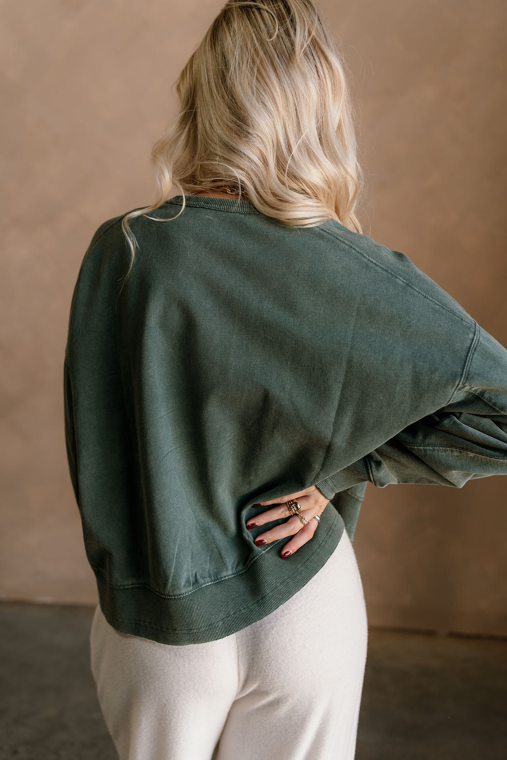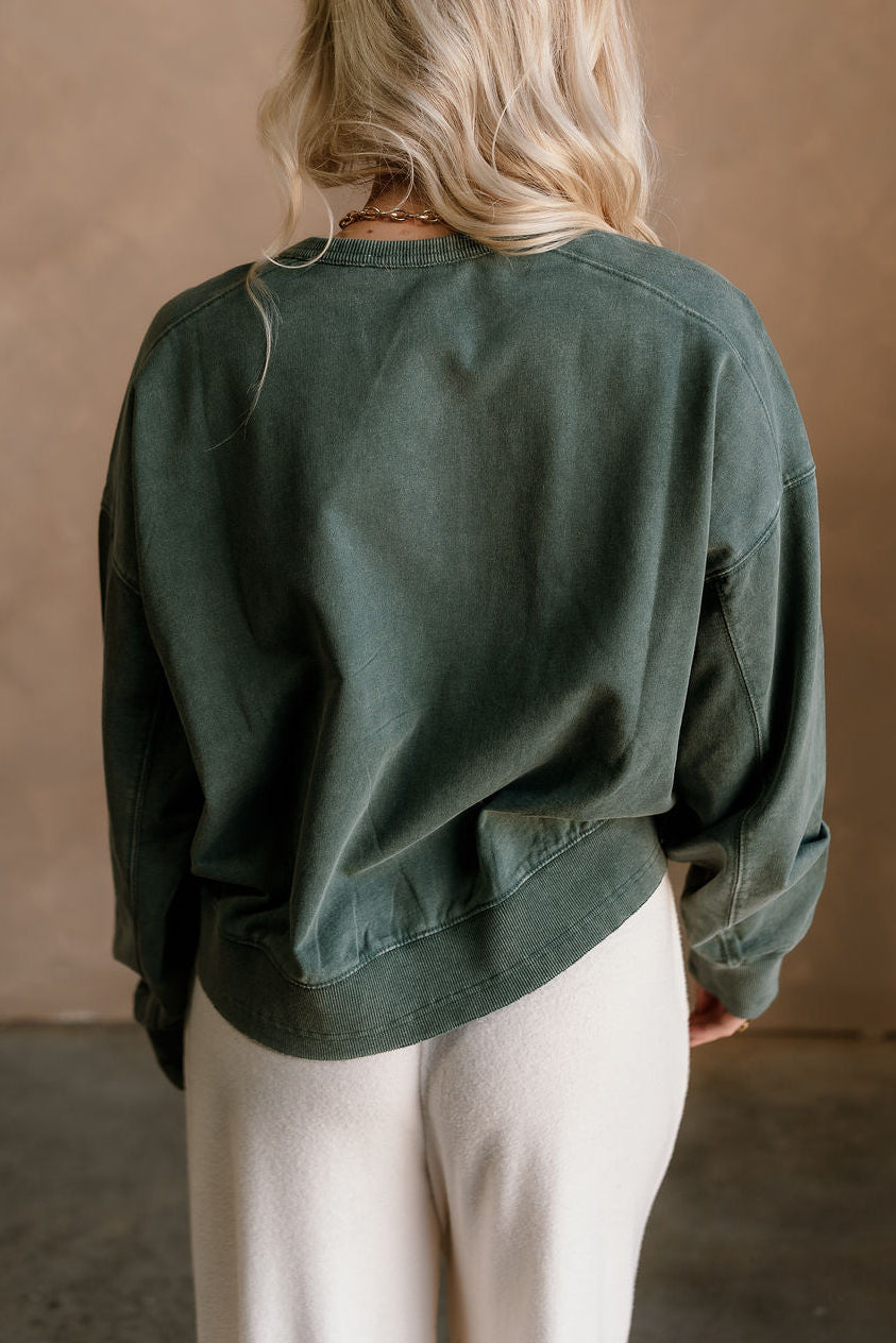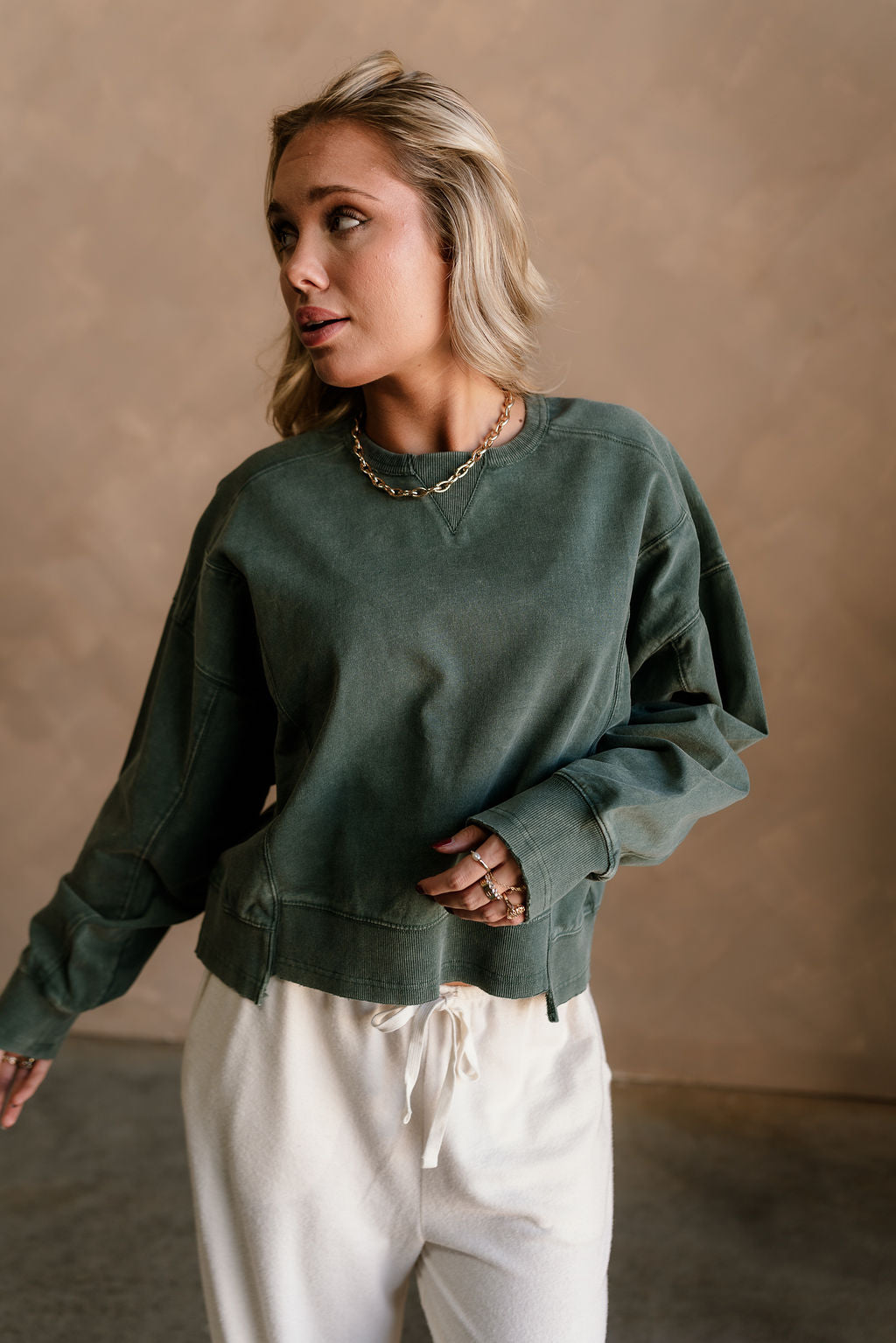 The Harper Washed Green Long Sleeve Sweatshirt is a soft, everyday staple made from washed green cotton fabric that delivers that perfectly lived-in look and feel. Its relaxed silhouette is shaped by dropped shoulders and long sleeves, giving it an easygoing drape that's ideal for casual styling. The round neckline keeps the design clean and classic, making it effortless to pair with your favorite layers.