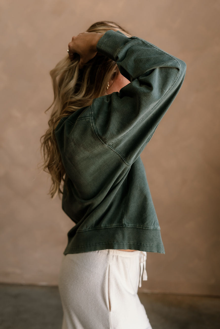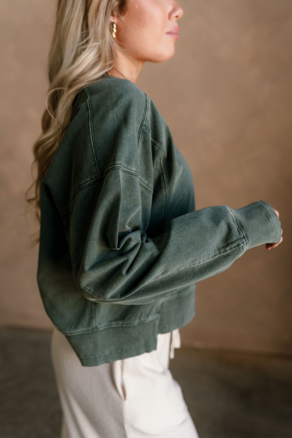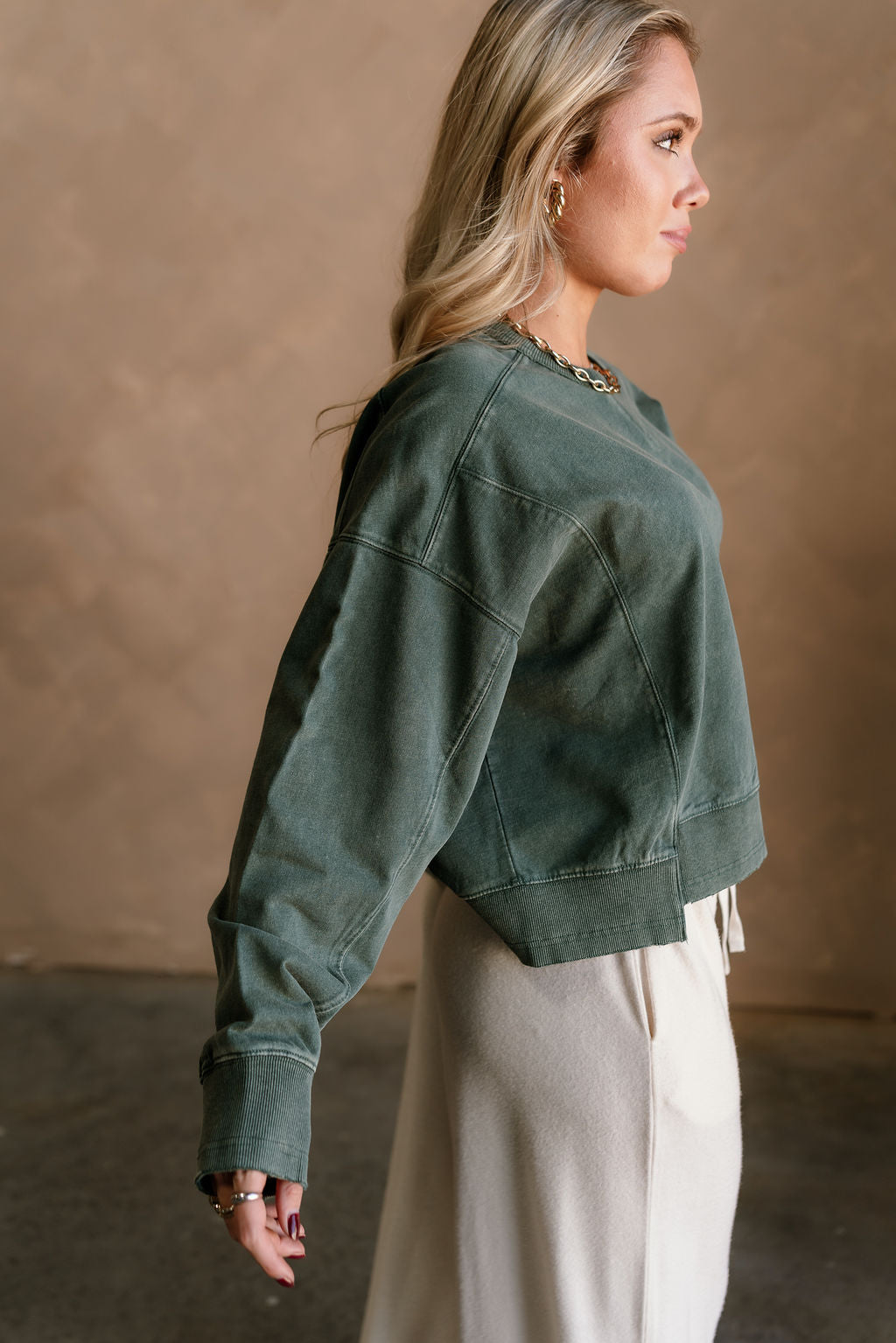 The Harper Washed Green Long Sleeve Sweatshirt is a soft, everyday staple made from washed green cotton fabric that delivers that perfectly lived-in look and feel. Its relaxed silhouette is shaped by dropped shoulders and long sleeves, giving it an easygoing drape that's ideal for casual styling. The round neckline keeps the design clean and classic, making it effortless to pair with your favorite layers.