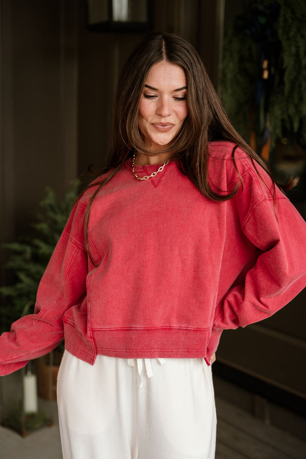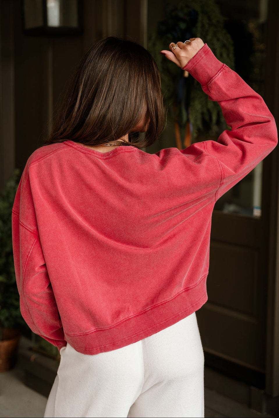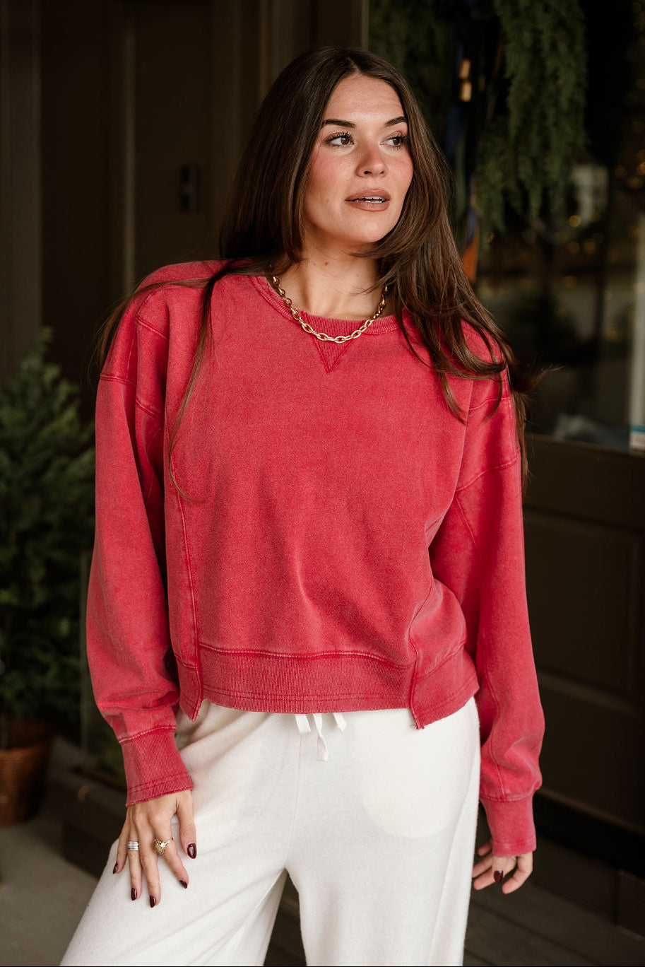 Add a pop of effortless color to your everyday rotation with the Harper Washed Red Long Sleeve Sweatshirt. Crafted from soft, washed cotton fabric, this sweatshirt delivers that perfectly lived-in feel from the first wear. The vintage red tone offers a hint of warmth and character — a refreshing standout among neutrals, yet still easy to style.