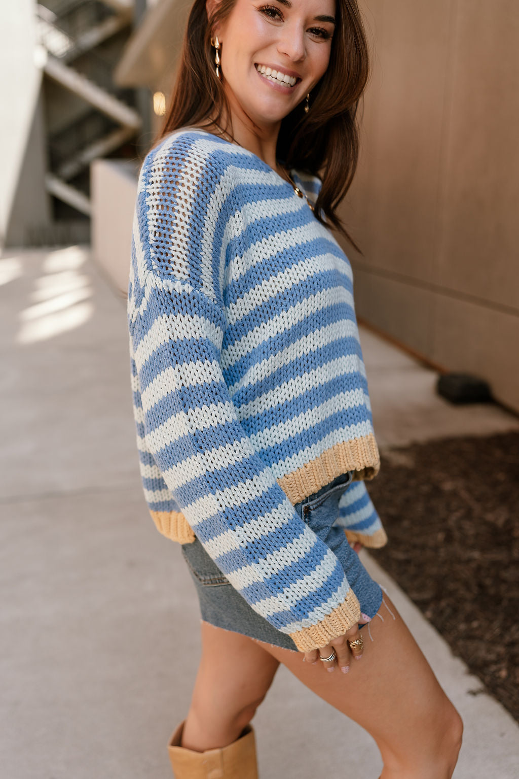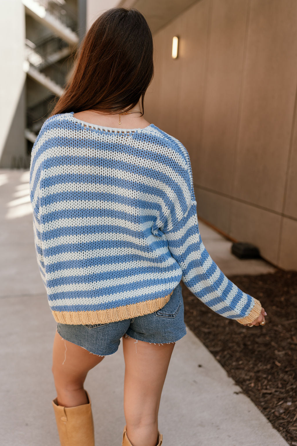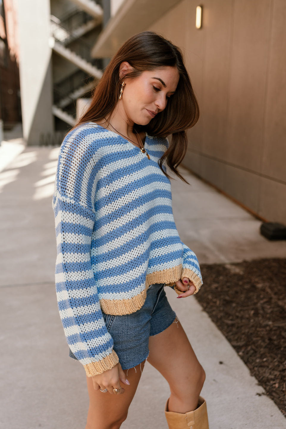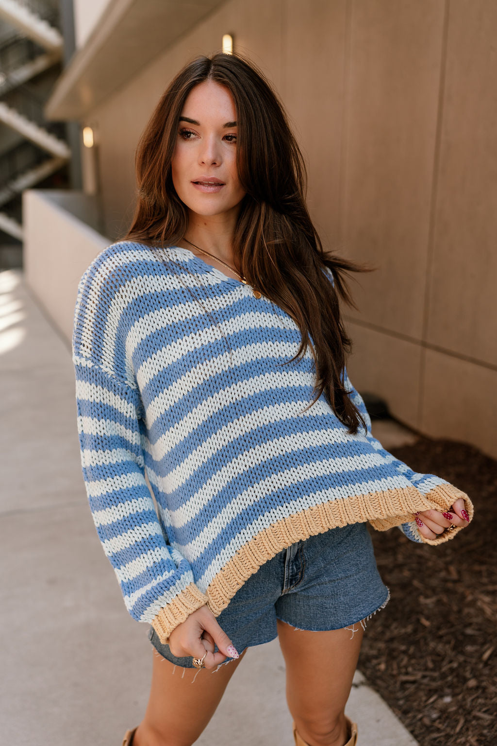 Playful yet refined, the Hayden Blue & Mustard Stripe Sweater adds a pop of color to your everyday style. Crafted from soft blue and light blue knit fabric, it features bold stripe detailing accented with mustard trim for a fresh, modern contrast. The relaxed v-neckline and long balloon sleeves create an effortlessly chic silhouette, perfect for pairing with denim, skirts, or tailored trousers. Cozy and stylish, this sweater is a versatile piece for any season.