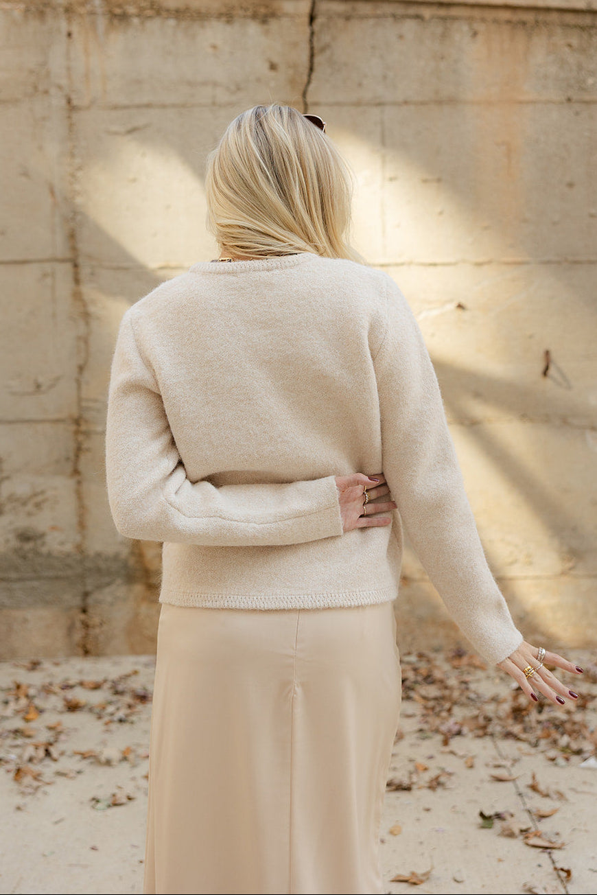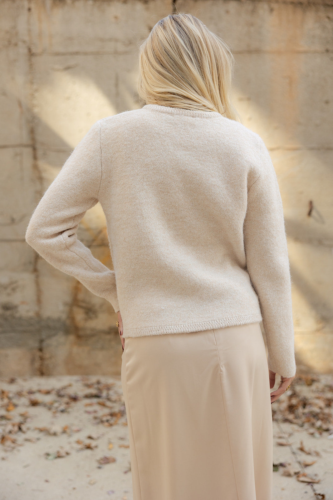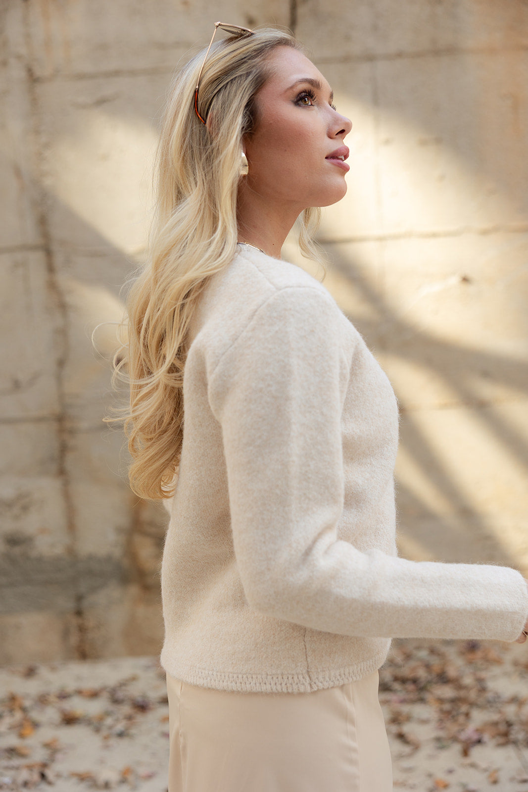 Elevate your essentials with the Helena Cream & Gold Button-Up Cardigan. Crafted from soft taupe knit fabric, this sophisticated layer features a classic round neckline, long sleeves, and standout gold buttons for a touch of refined elegance. Perfect for pairing with jeans, skirts, or layered over dresses, it’s a versatile piece that blends timeless style with subtle glamour.