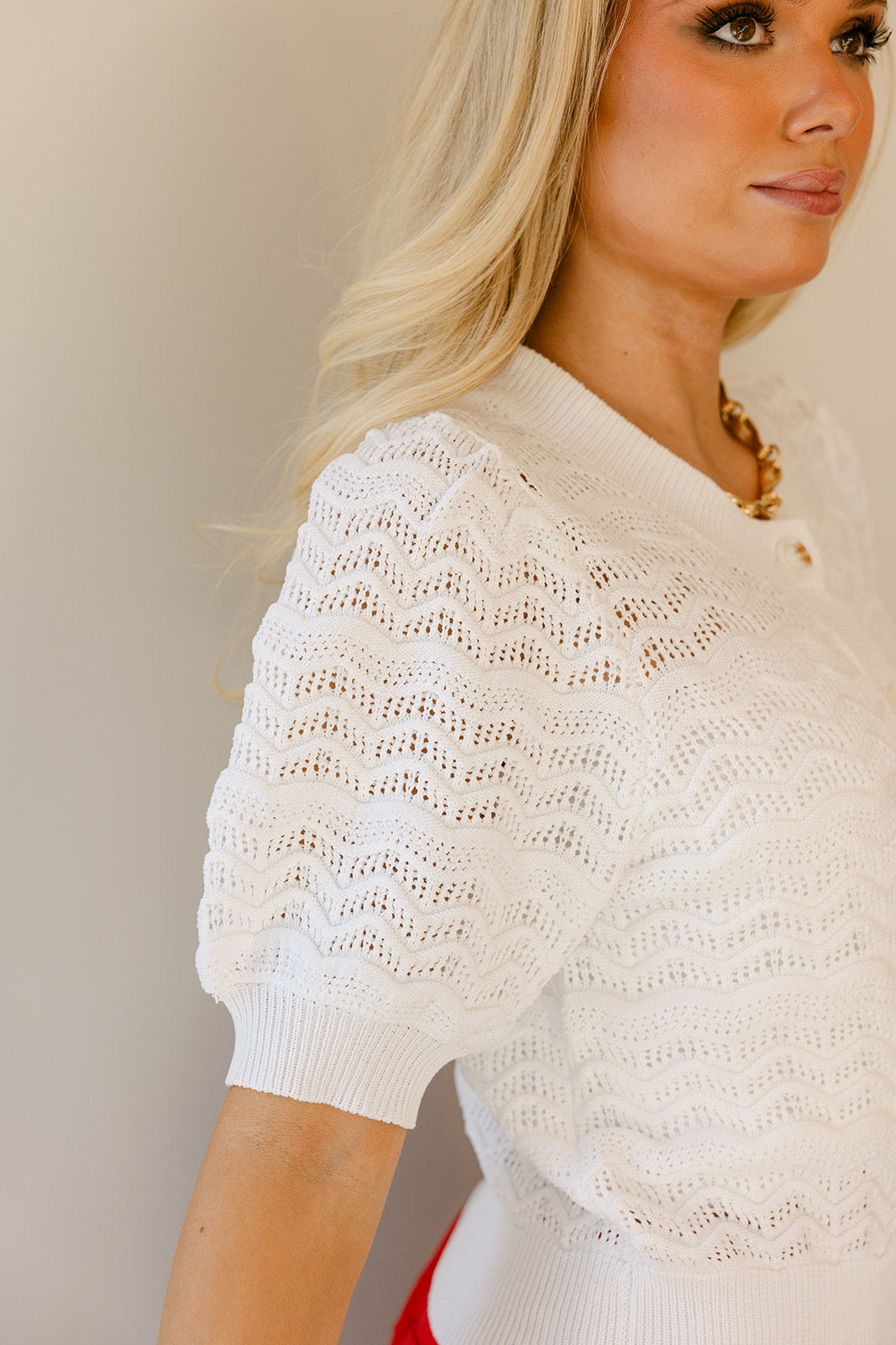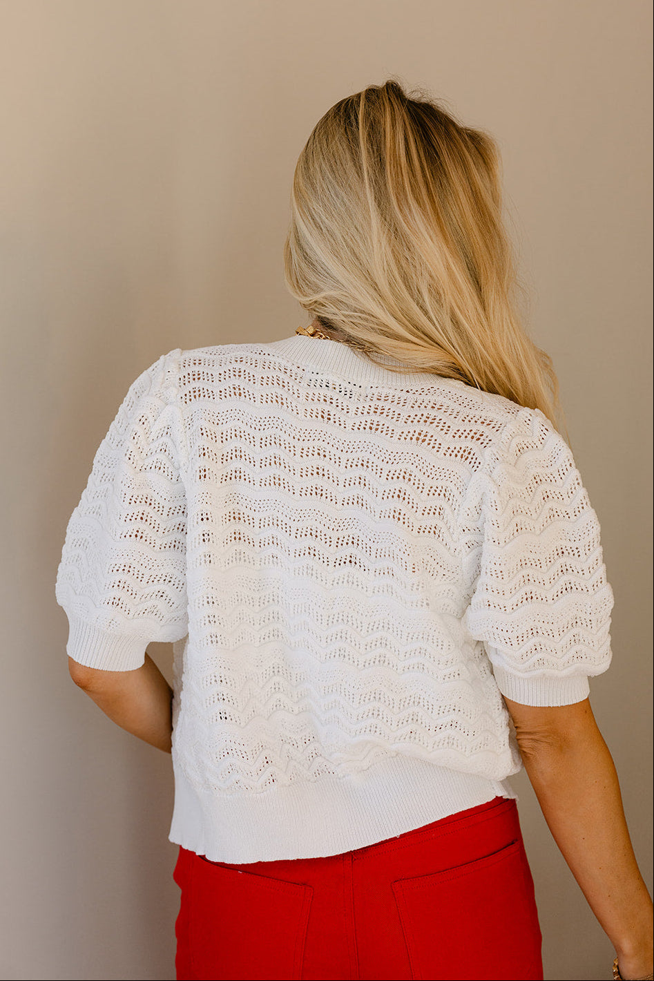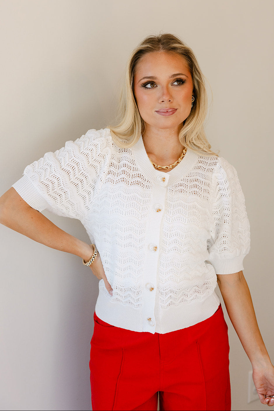 The classic round neckline and front tortoise button up closure create a clean, endless body. While short puff sleeves bring a touch of romantic unique. A ribbed hem provides structure and a flattering fit, balancing the relaxed, breathable knit. Perfect for transitional weather or layering over tops and dresses.