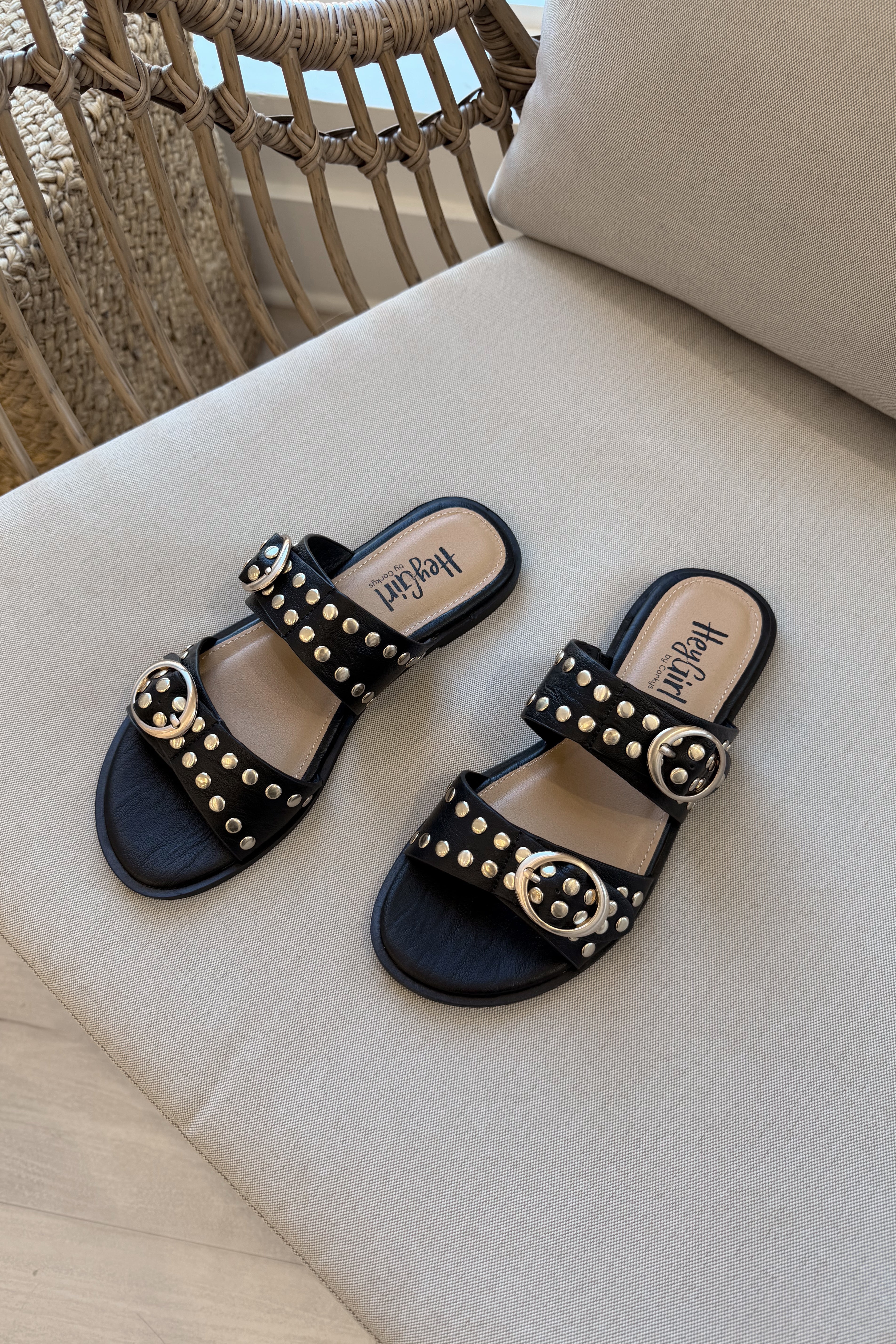Straps accented with gold grommets and buckle details add the perfect touch of hardware-inspired edge, giving the sandal a fashion-forward feel. The easy slide-on design makes it both stylish and convenient for everyday wear.