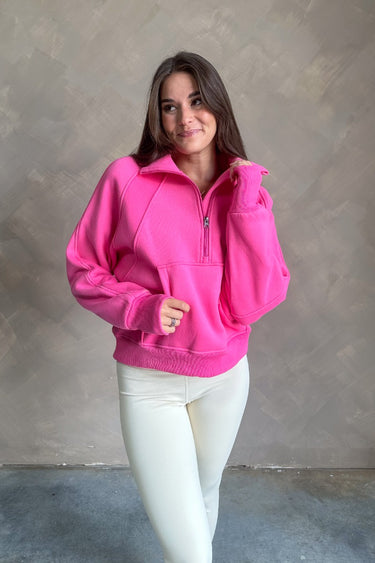 Add the Hot Pink Quarter-Zip Sweatshirt to your collection today, and enjoy cozy style with a bright twist.
