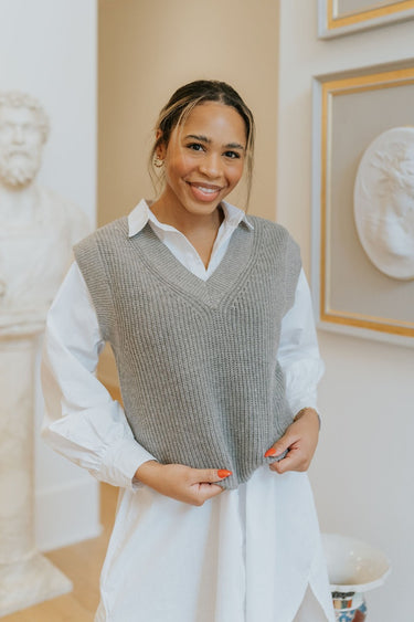 The Impress Me Sweater Vest in Grey is a chic essential that effortlessly enhances any outfit. Perfect for classic and contemporary looks alike.