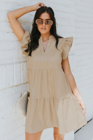 Sand Faux-Leather Dress brings modern edge with timeless charm, making it a versatile choice for many occasions. This chic mini dress is crafted from smooth faux-leather in a soft sand tone, giving a fresh twist to a classic design. The flattering V neckline shapes your look, while short ruffled sleeves add a feminine touch. Because of its tiered design, the dress flows naturally, offering style and ease.