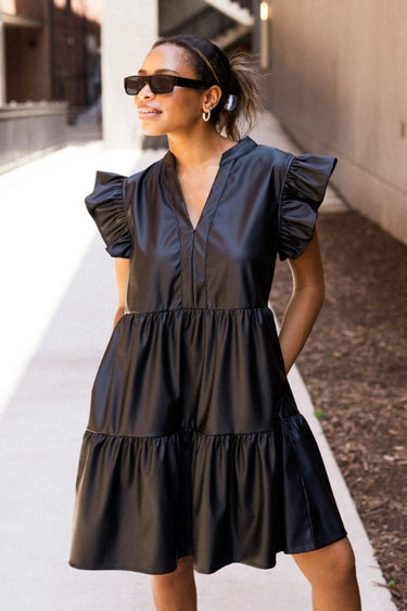 Black Faux Leather Dress is a bold piece designed for women who love chic and edgy style. This mini dress features a soft faux-leather fabric that offers a modern look while staying lightweight. The V neckline flatters your shape, and the short ruffle sleeves add a fun feminine detail. Because of its tiered design, the dress flows easily, giving both comfort and style for many occasions.