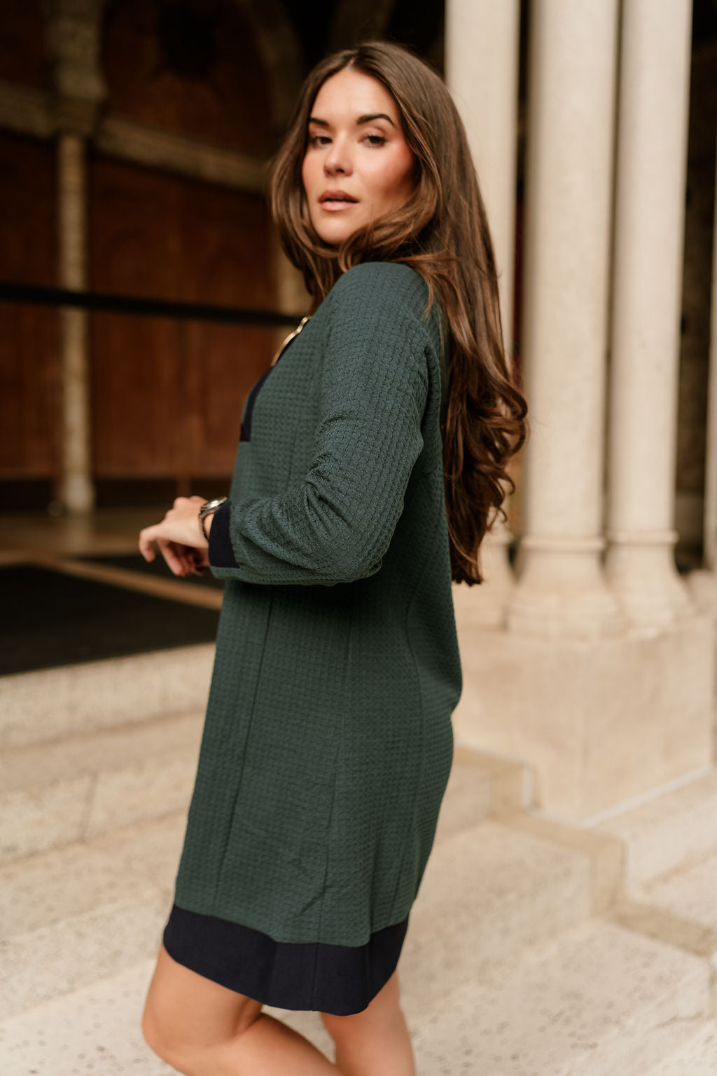 The Ingrid Green Quarter-Zip Mini Dress blends sporty sophistication with a fresh, vibrant aesthetic. Its rich green tone brings a lively pop of color, while the sleek quarter-zip neckline adds a modern, adjustable touch to your look. Designed with a flattering, body-skimming fit, this mini dress offers both style and comfort, making it an easy choice for casual outings, brunch dates, or laid-back evenings.