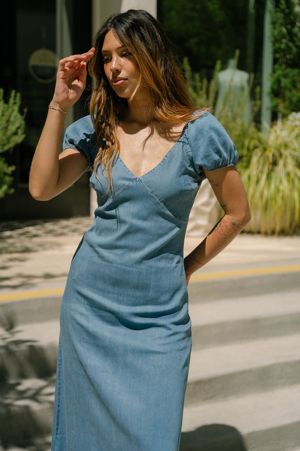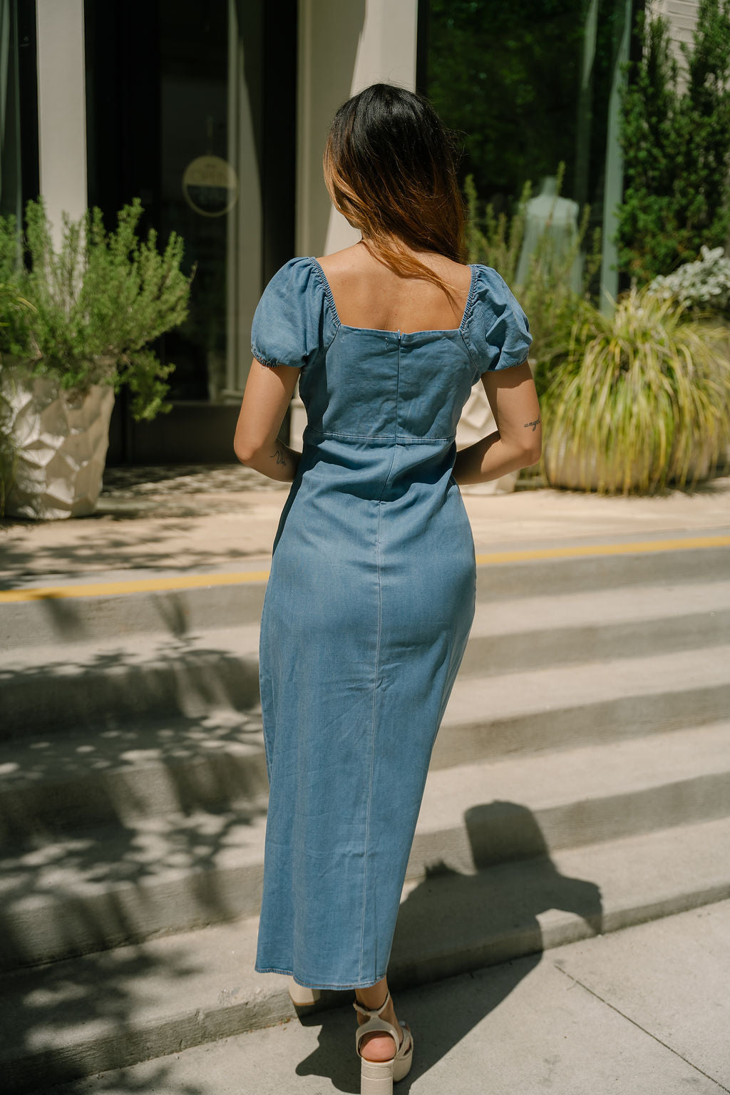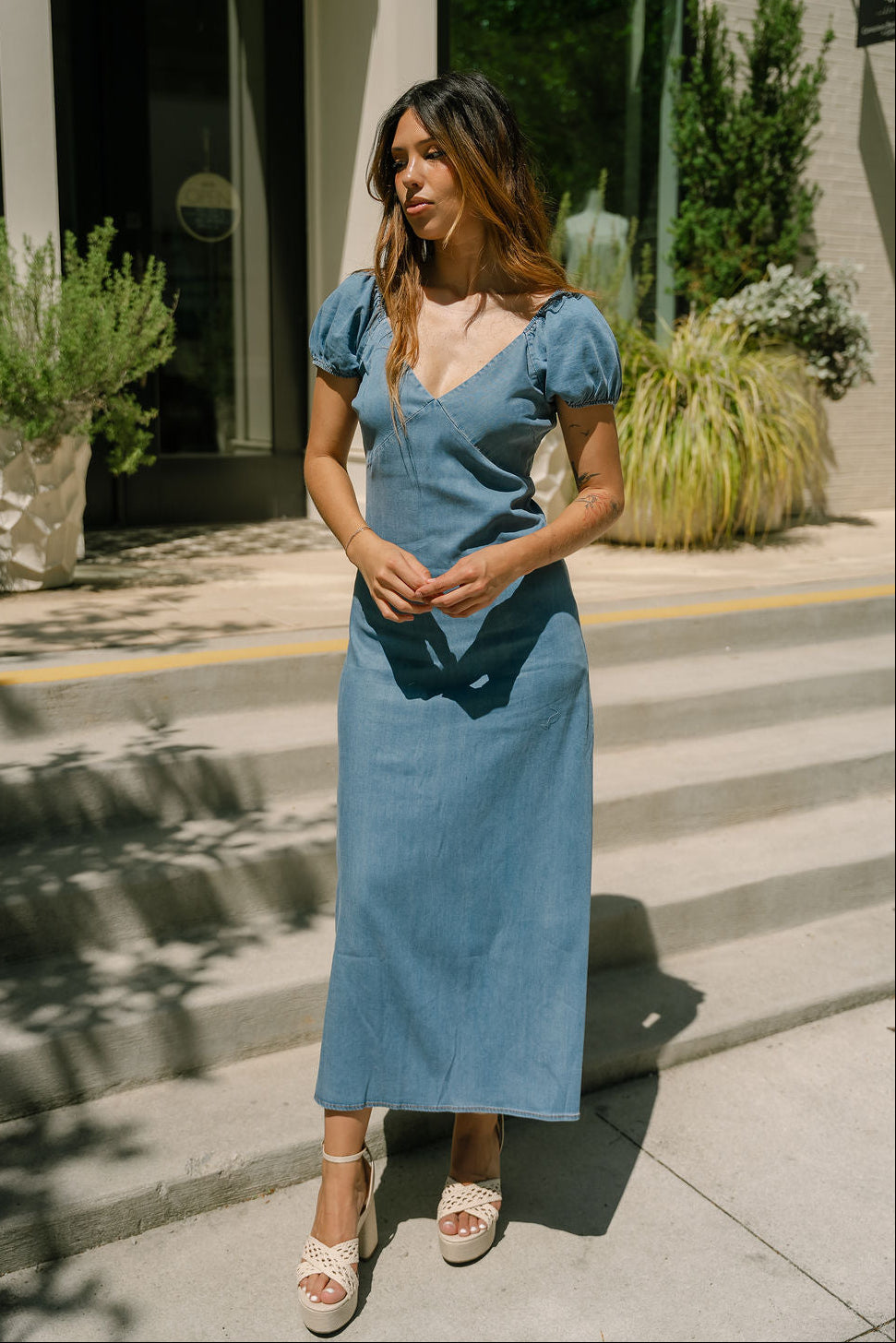 The Jessie Denim Puff Sleeve Maxi Dress is a timeless piece with a soft, feminine feel. Made from medium denim lightweight fabric, it offers a breathable fit with a relaxed, easy drape. The maxi length creates an elongated silhouette that feels both effortless and polished.