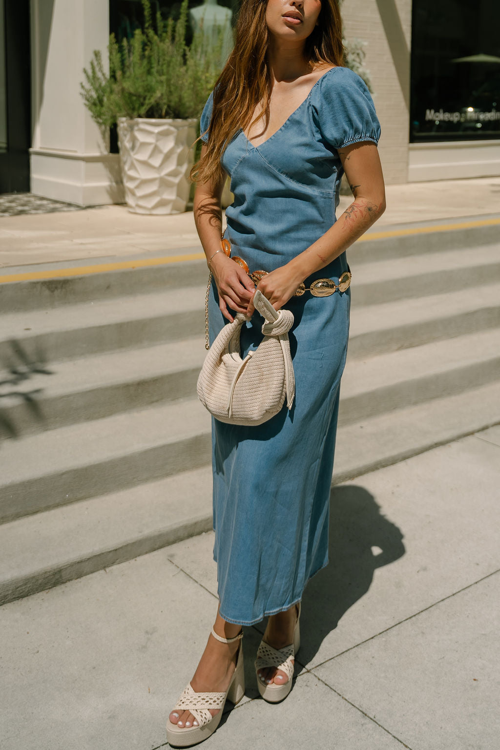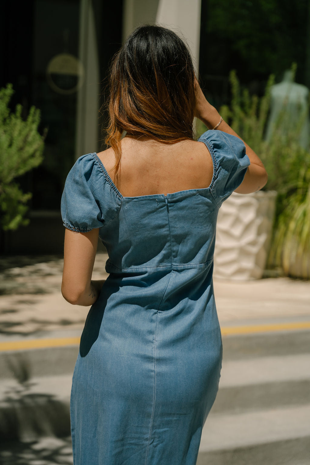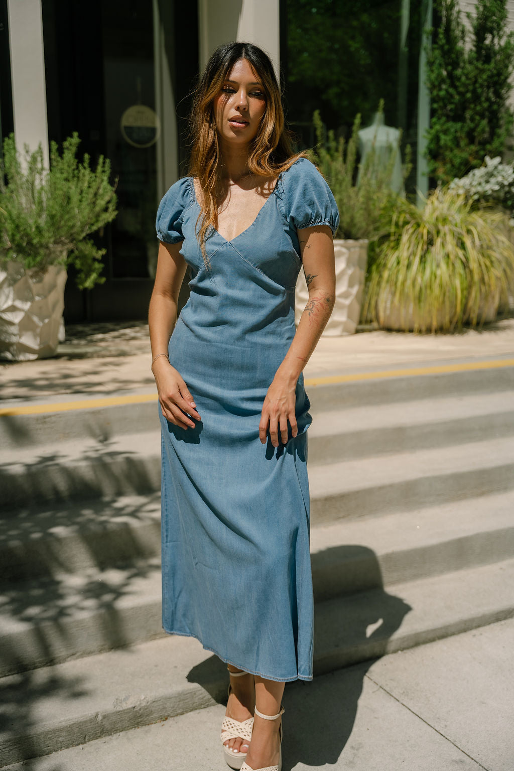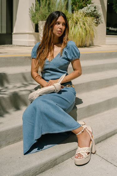 The Jessie Denim Puff Sleeve Maxi Dress is a timeless piece with a soft, feminine feel. Made from medium denim lightweight fabric, it offers a breathable fit with a relaxed, easy drape. The maxi length creates an elongated silhouette that feels both effortless and polished.
