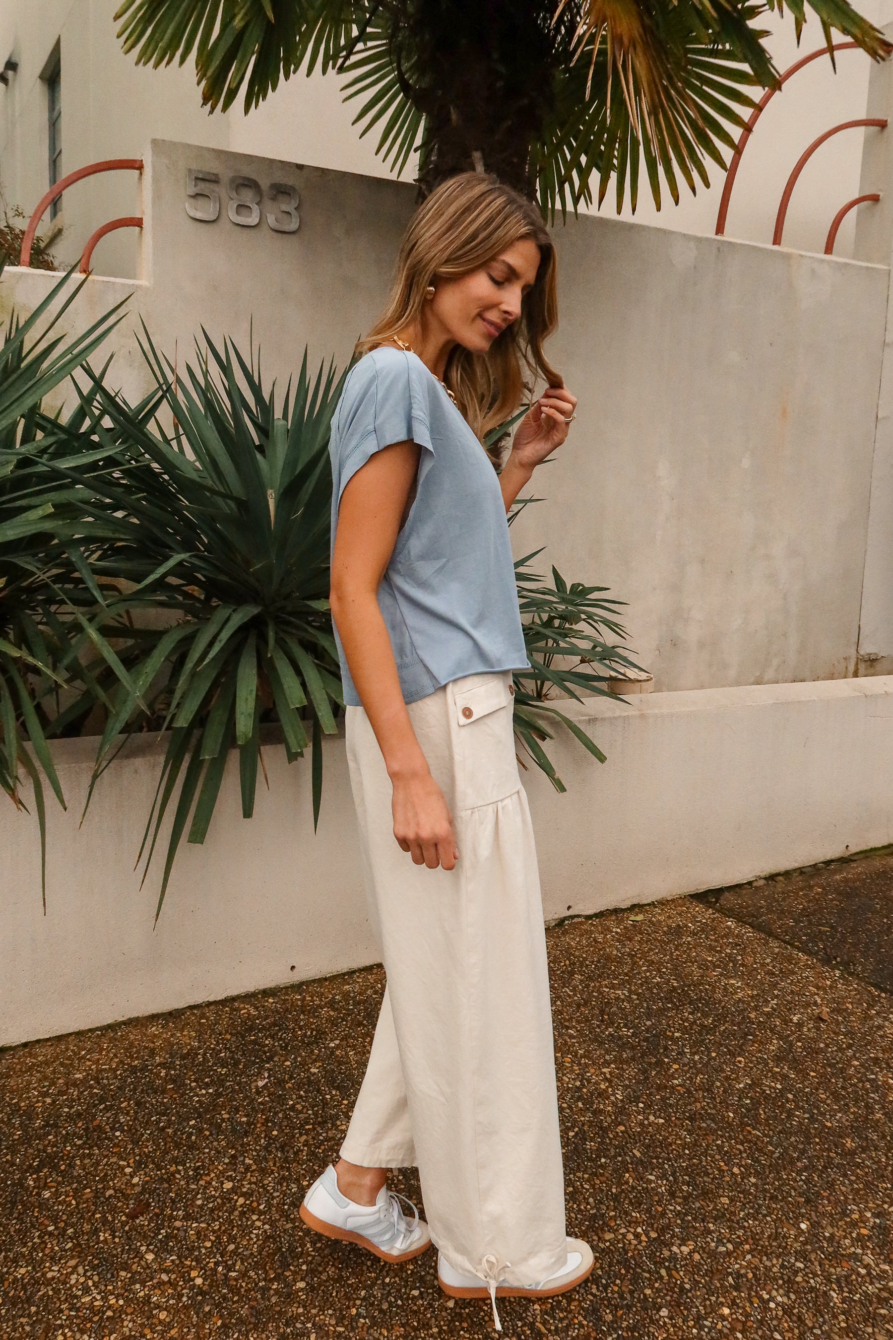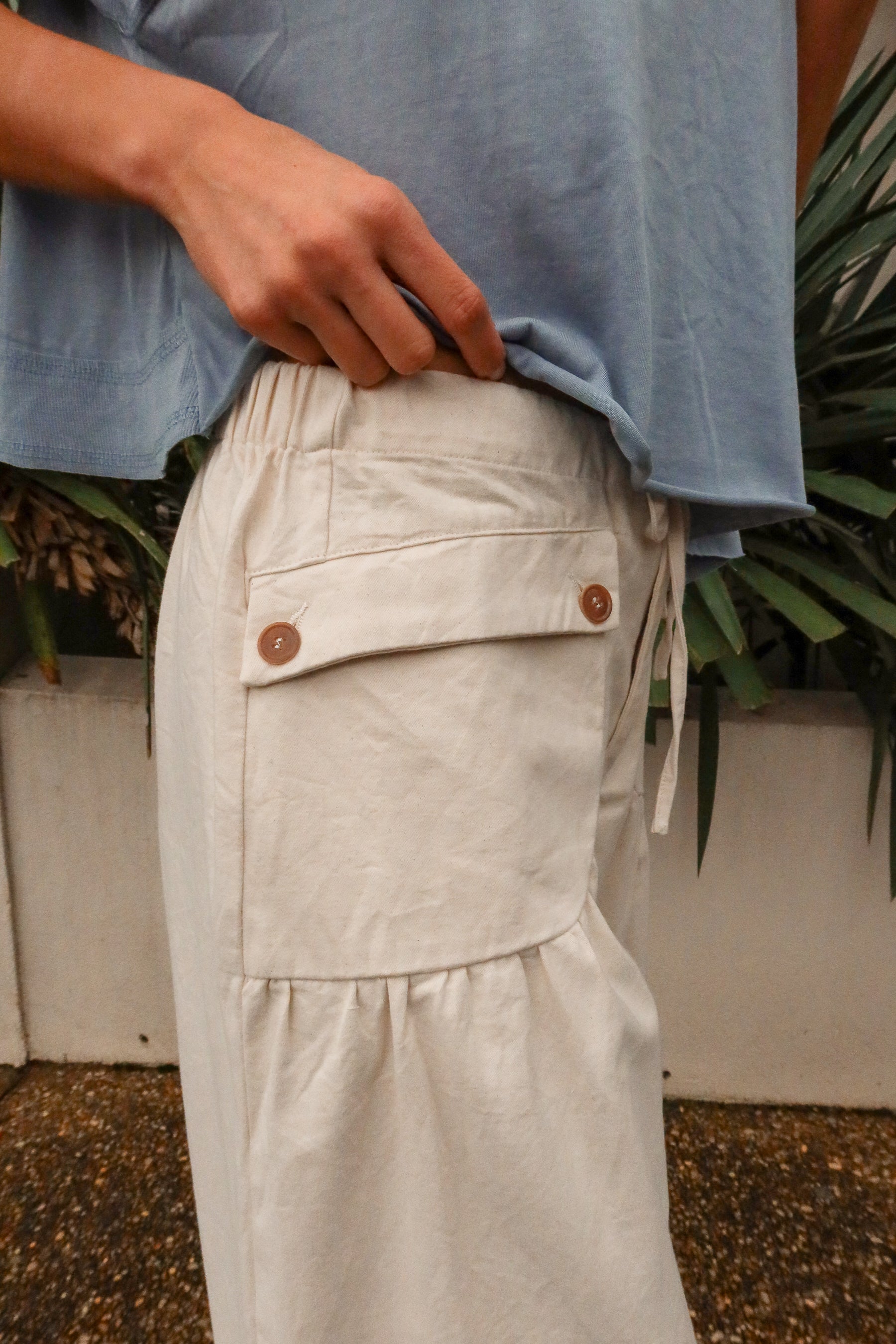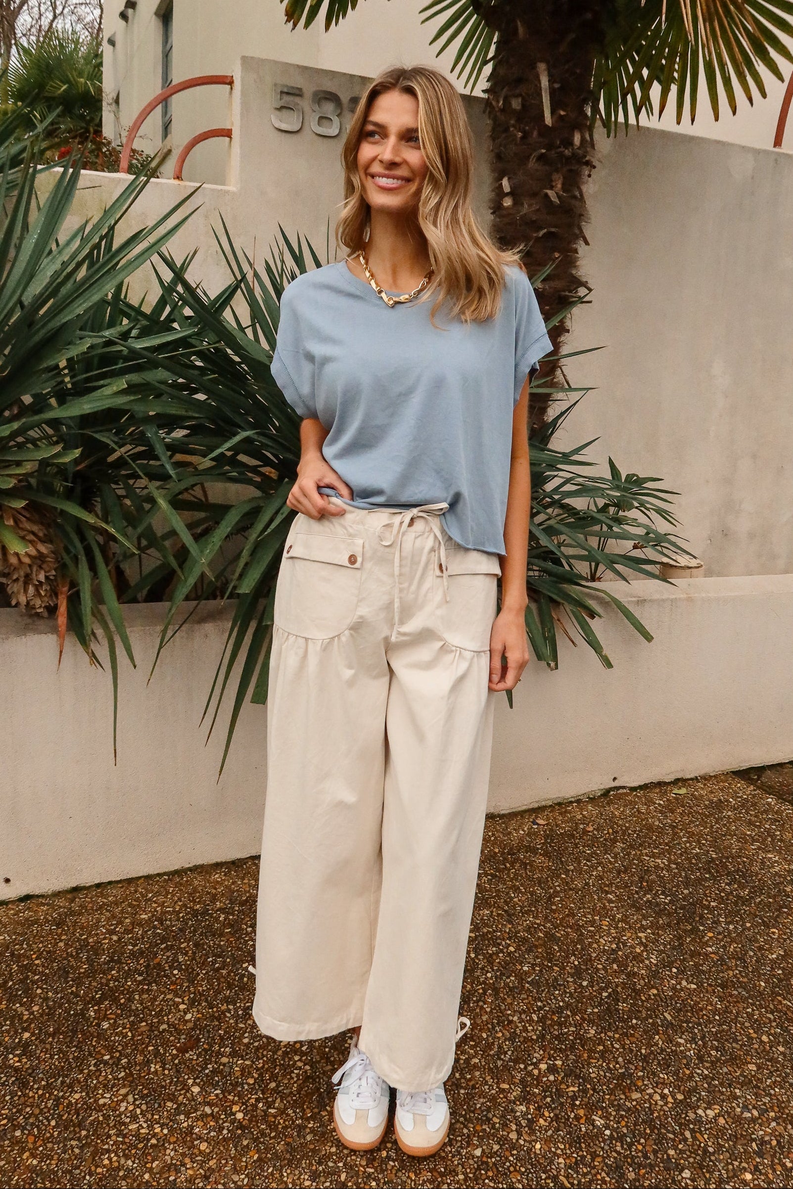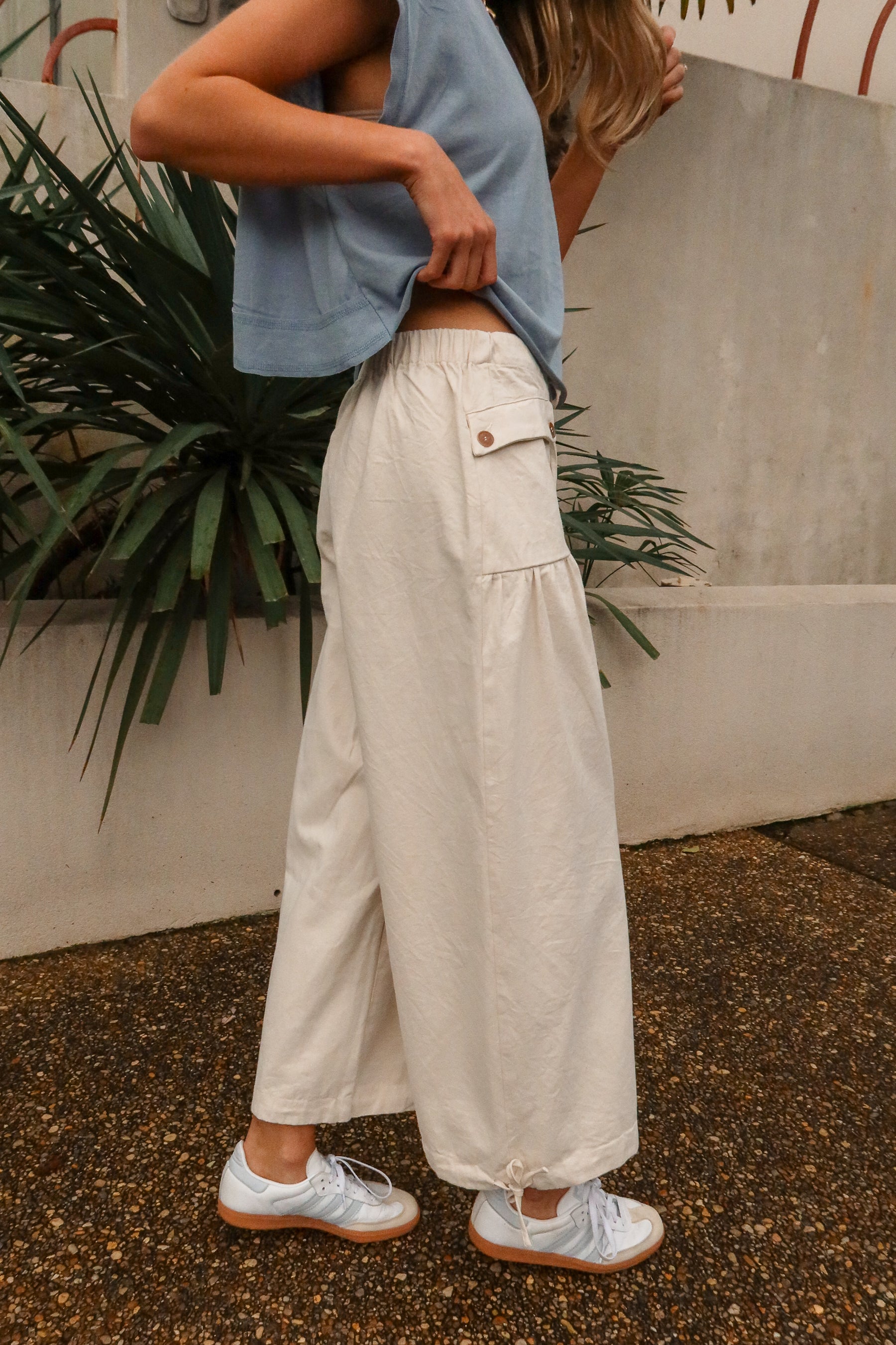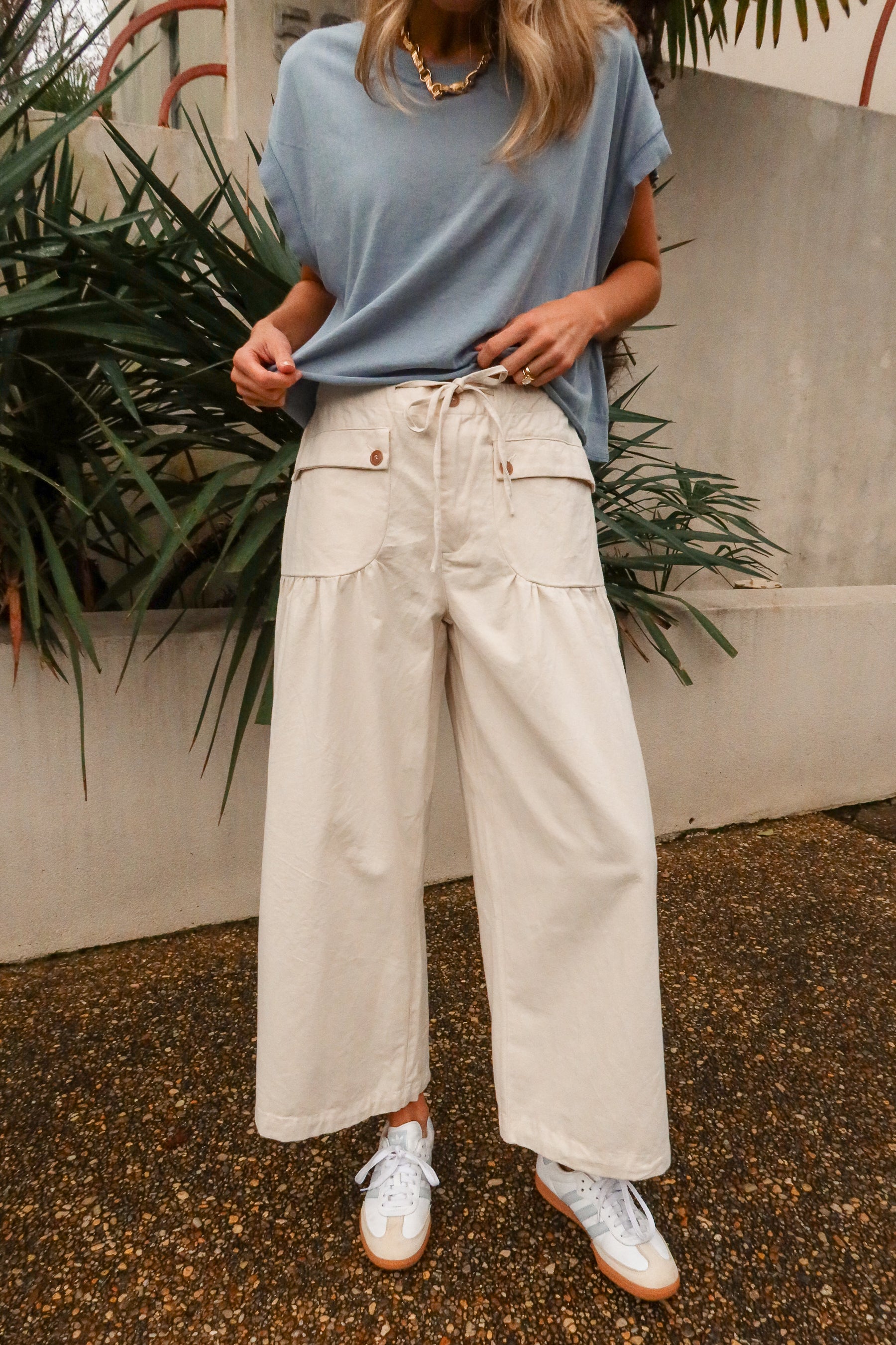 Effortlessly polished with a relaxed feel, the Jessie Ivory Wide Leg Drawstring Pants are a versatile staple for warm-weather styling. Crafted from ivory natural lightweight fabric, these pants feature a breezy wide leg silhouette that offers movement and comfort. The soft neutral tone makes them easy to pair with everything from fitted tanks to structured blouses.