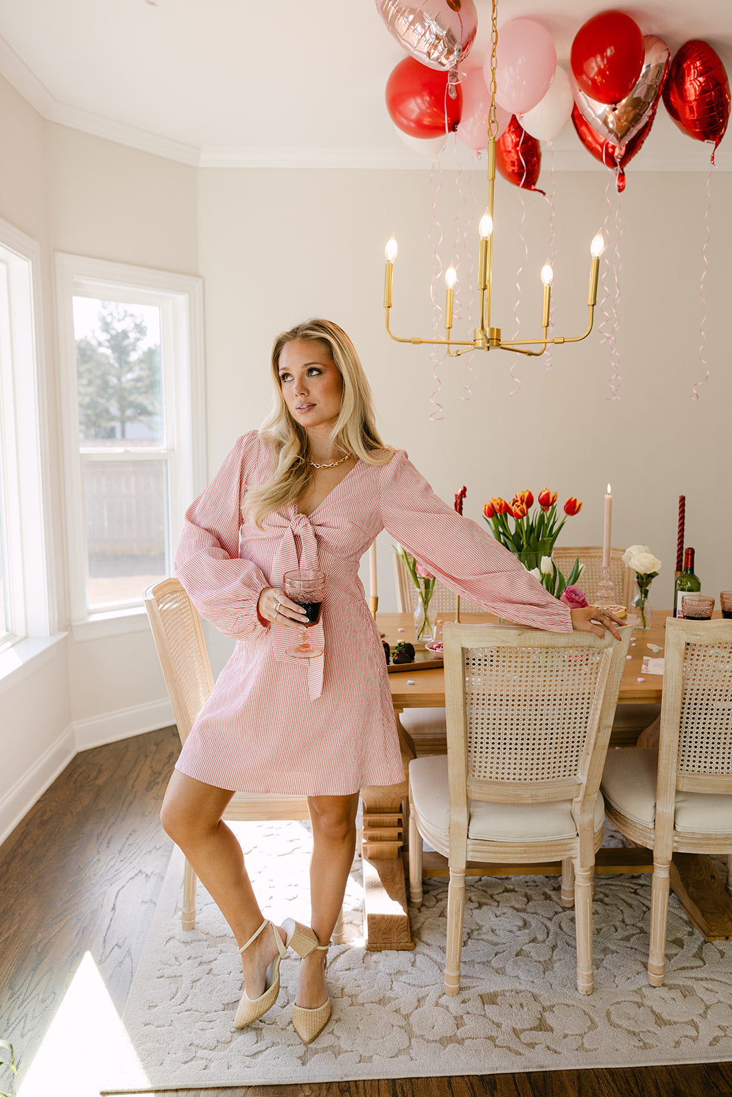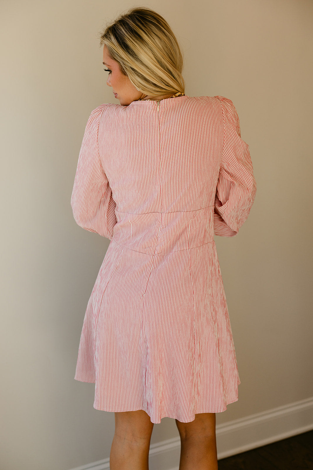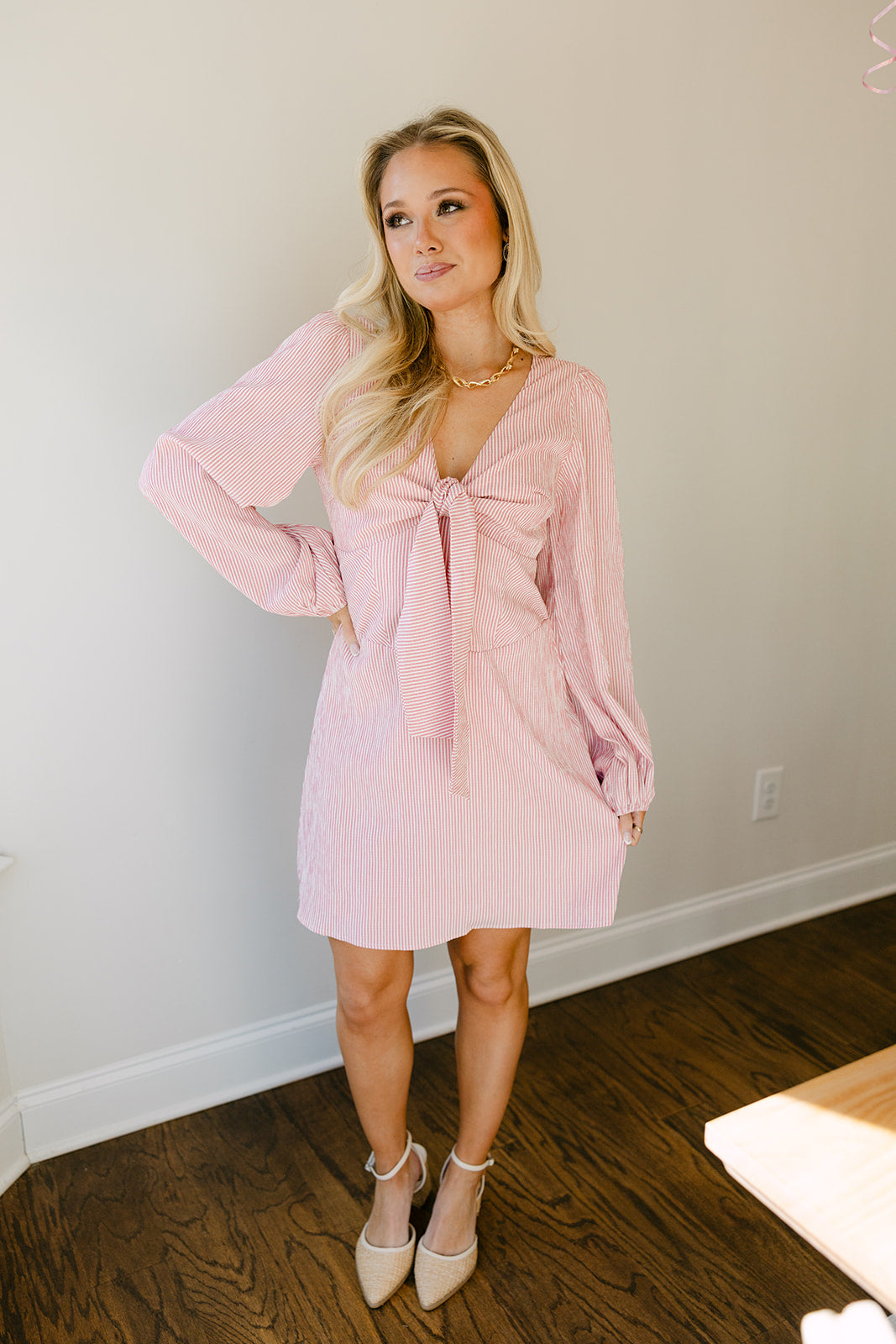 Designed with a V-neckline and front tie detail, the Joanie Dress creates a flattering shape through the bodice while adding a touch of softness to the silhouette. Long sleeves balance the mini length beautifully, making this dress perfect for transitional seasons. Finished with a back zipper for easy wear, this style pairs effortlessly with boots, heels, or flats for brunch dates, game days, or casual events.