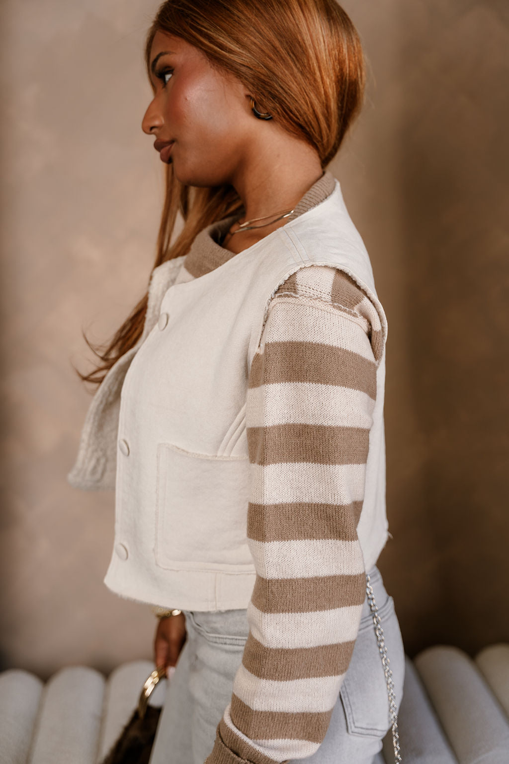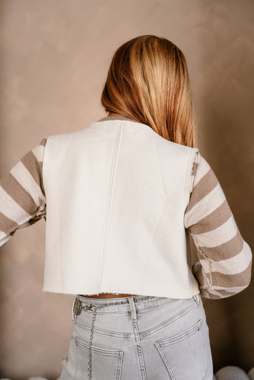 Elevate your layering game with the Jocelyn Beige Suede & Shearling Vest. Crafted from soft beige suede, this sleeveless vest features a cropped waist, round neckline, and front pockets for both style and function. The front covered button-up closure and cozy ivory shearling lining add warmth and sophistication, making it the perfect statement piece for transitional seasons.