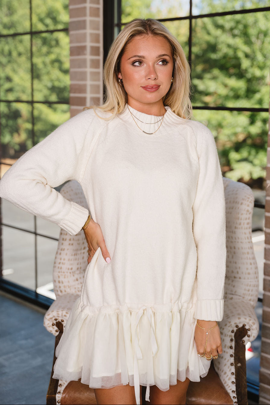The Jodi Cream Drop Waist Mini Dress is a charming blend of cozy knit and whimsical tulle, perfect for adding a playful touch to your wardrobe. The soft cream sweater upper features a ribbed mock neckline and long raglan sleeves with ribbed wrists. The drawstring dropped waist lets you adjust the fit for a flattering, comfortable shape.