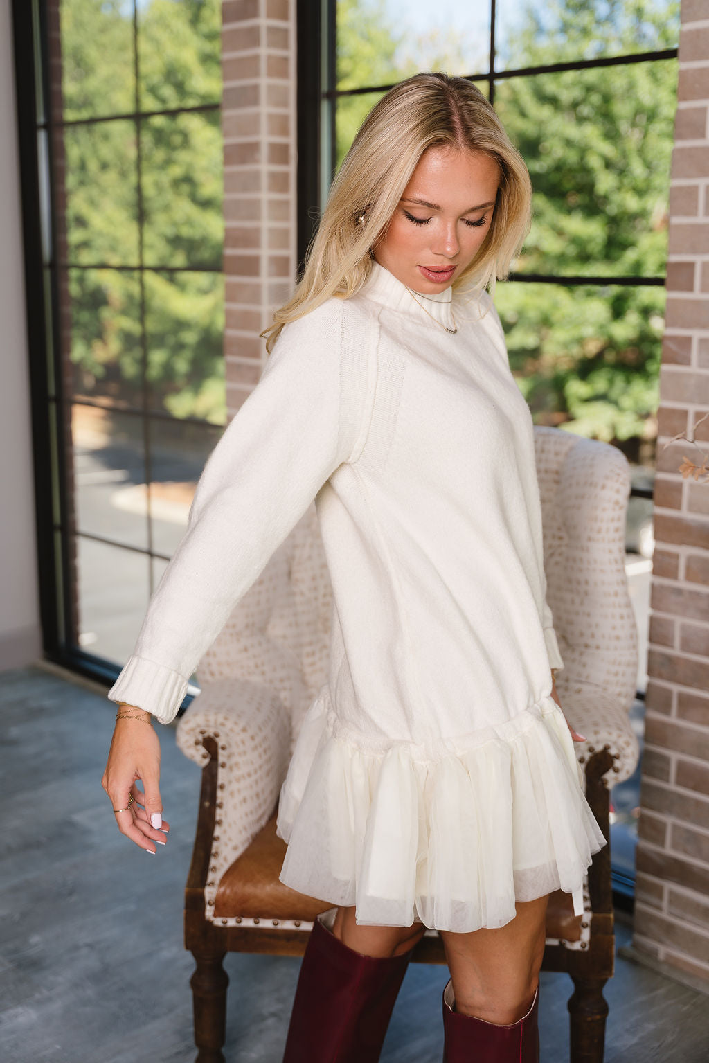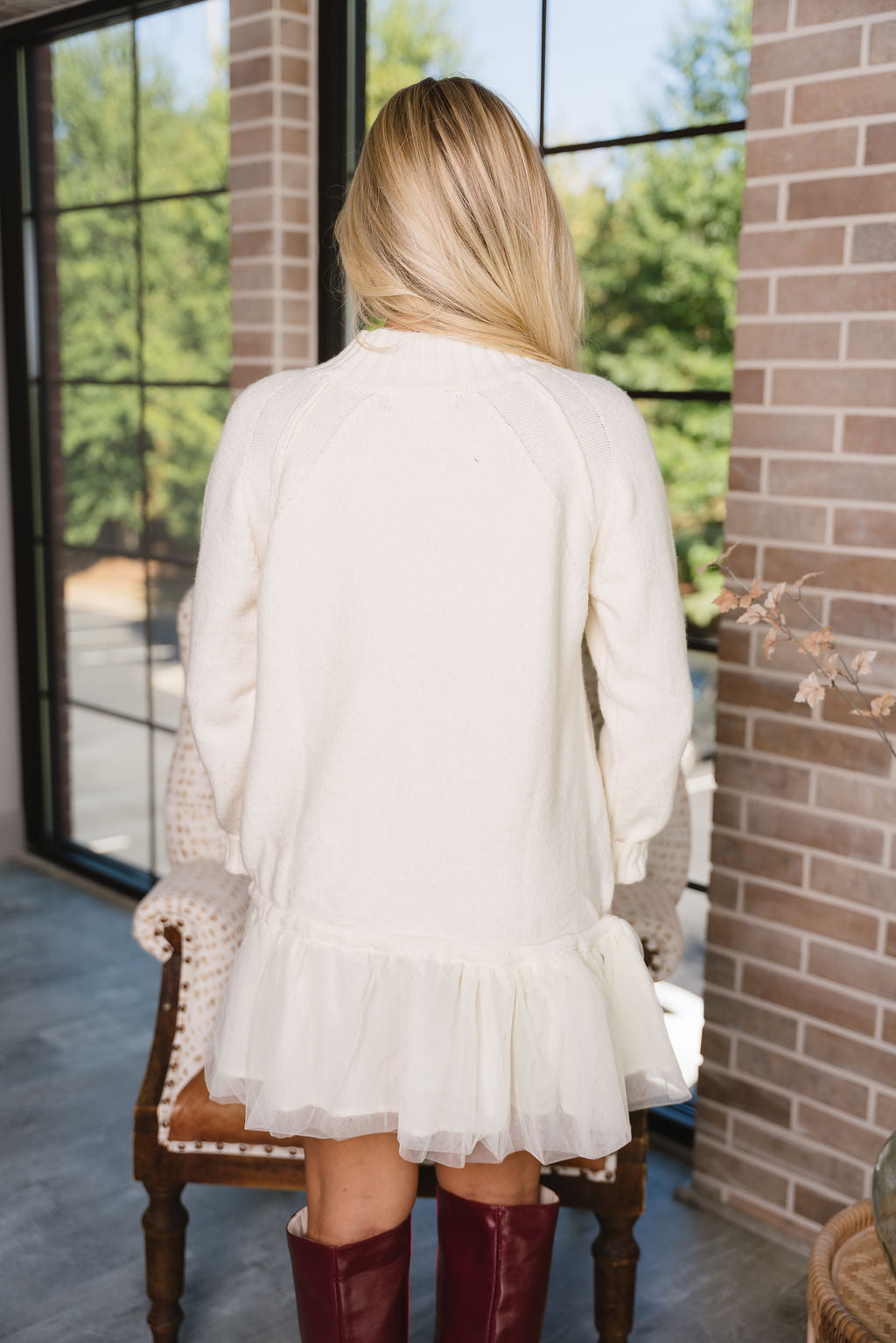 The layered tulle skirt with cream lining adds a delicate, flirty finish, making this mini dress ideal for brunches, parties, or special occasions. Pair it with ankle boots or heels to elevate the look. Keep it casual with flats for a daytime-ready outfit. With its mix of textures and adjustable fit, the Jodi Cream Drop Waist Mini Dress brings both style and comfort in one versatile piece.