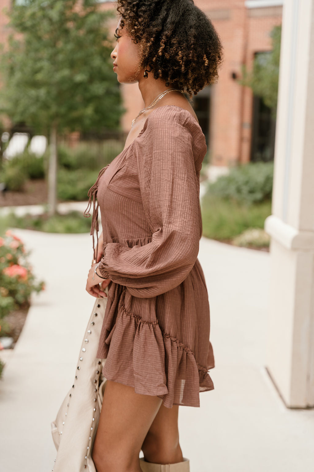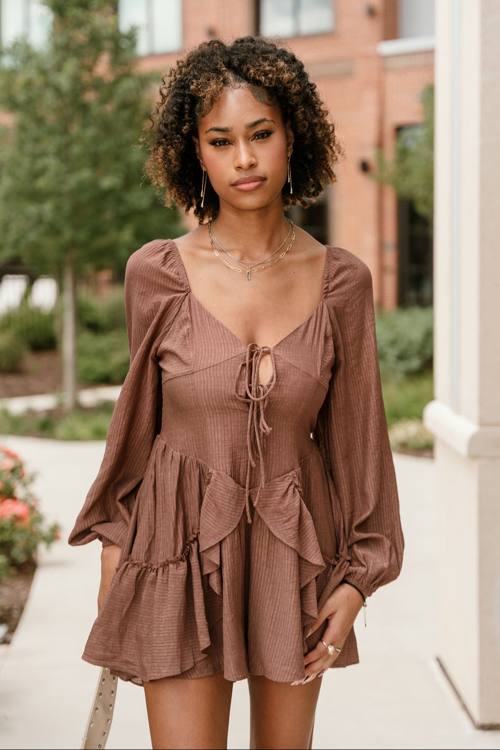 Secondly, a feminine V-neckline is complemented by playful front ties. It adds subtle detail and a touch of whimsy to the look. Tiered flare design creates a flowy body that enhances movement while maintaining a flattering shape. Long puff sleeves bring romantic, bohemian-inspired flair, balancing the airy feel of the Brown Long Sleeve Romper with a touch of structure and elegance.