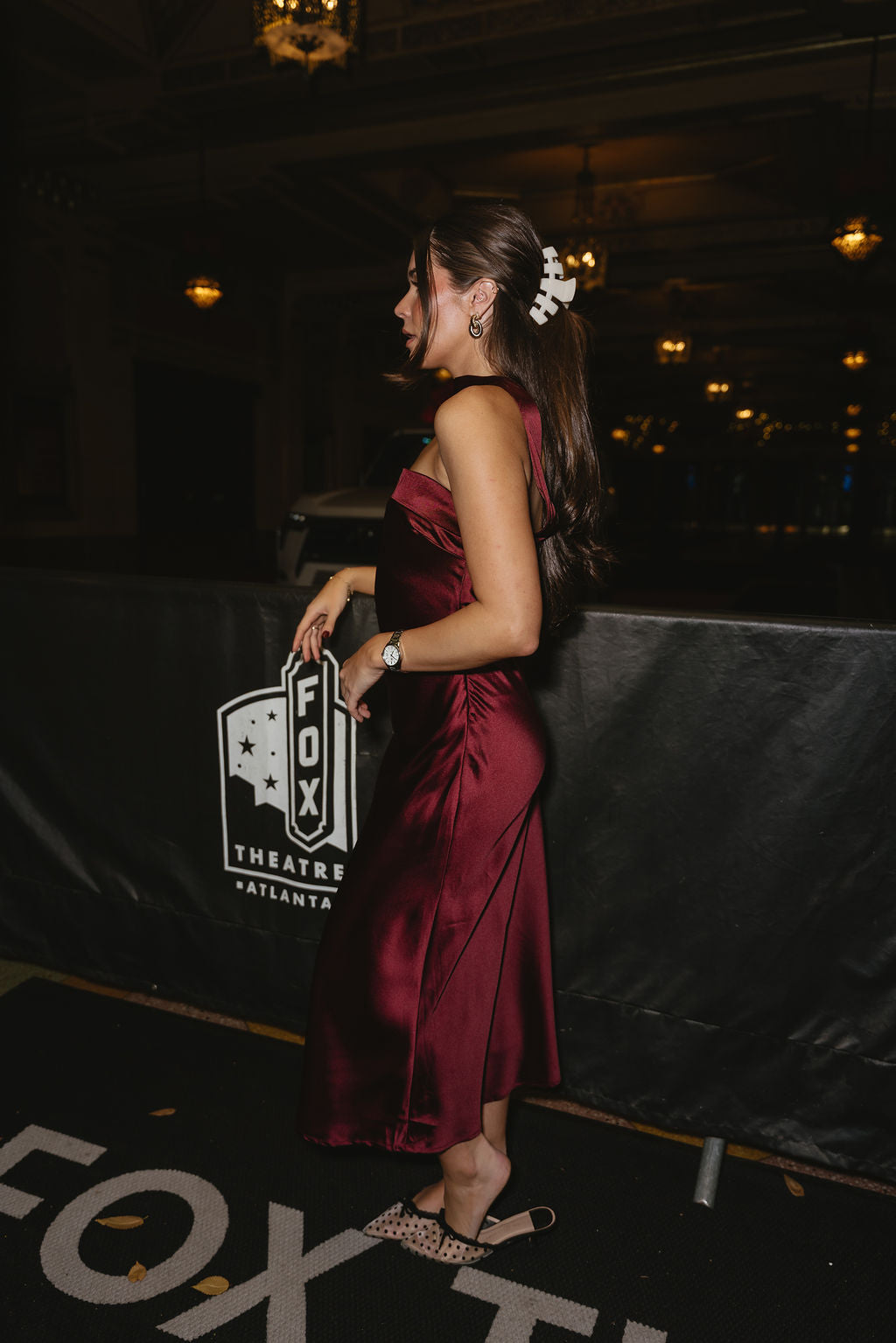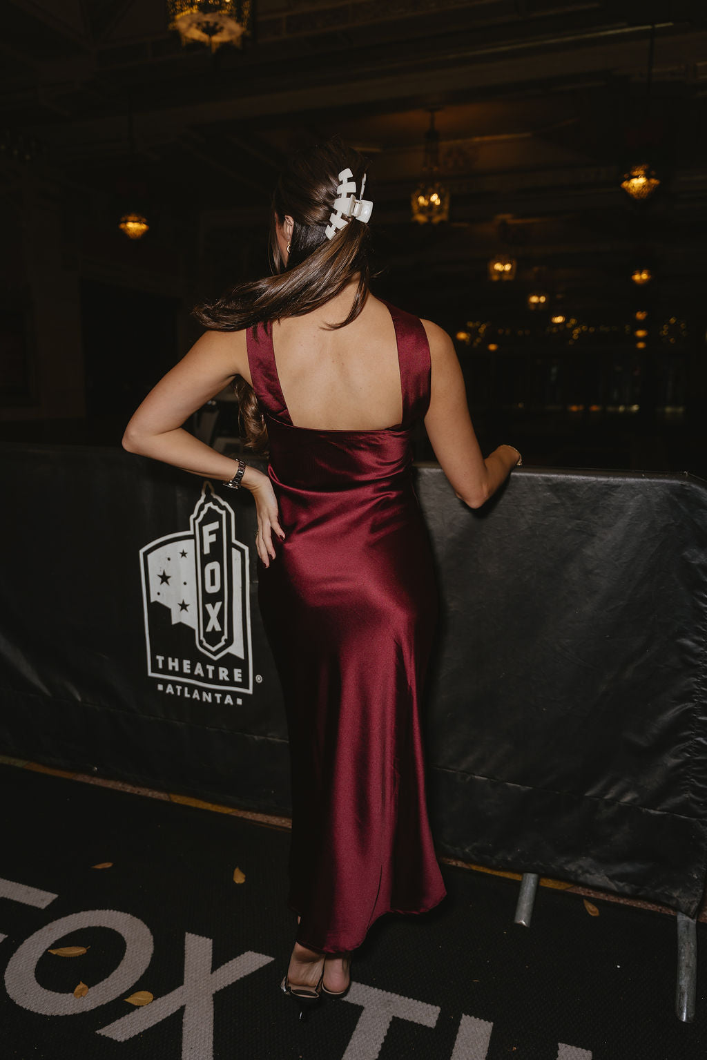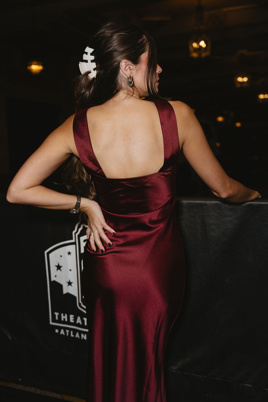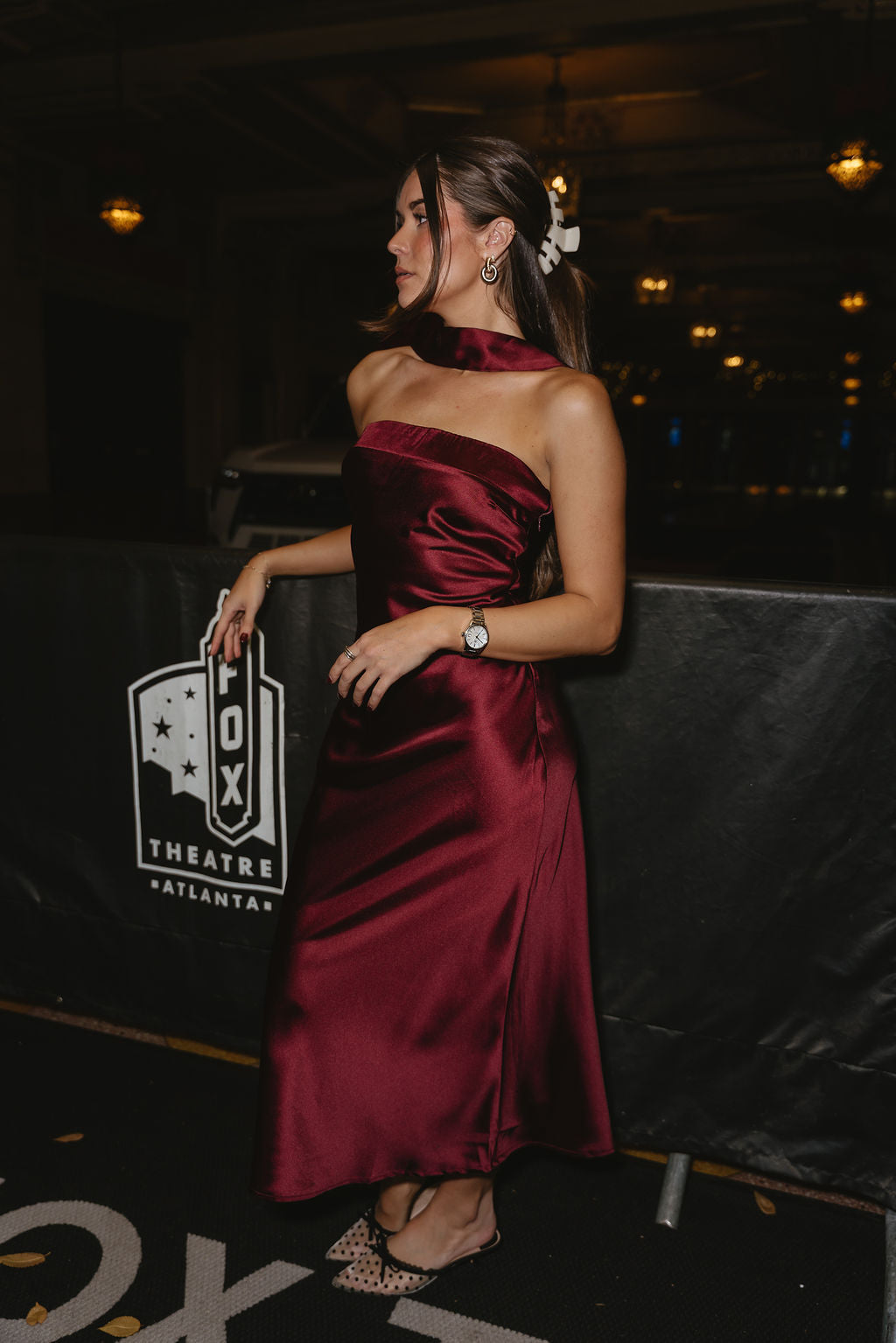 Meet the Julia Burgundy Satin Midi Dress—an exquisite statement piece designed to turn heads. Made from rich, glossy burgundy satin, this midi-length dress offers an elegant, fluid drape that flatters the figure from every angle. The strapless bodice is complemented by a distinctive scarf neckline that wraps softly and adds a refined, fashion-forward edge. Fully lined in coordinating burgundy fabric, the dress feels as luxurious on the inside as it looks on the outside. Finished with a smooth side zipper for easy wear and a flawless silhouette, the Julia dress is the perfect choice for formal occasions, holiday parties, or any evening you want to feel effortlessly captivating.