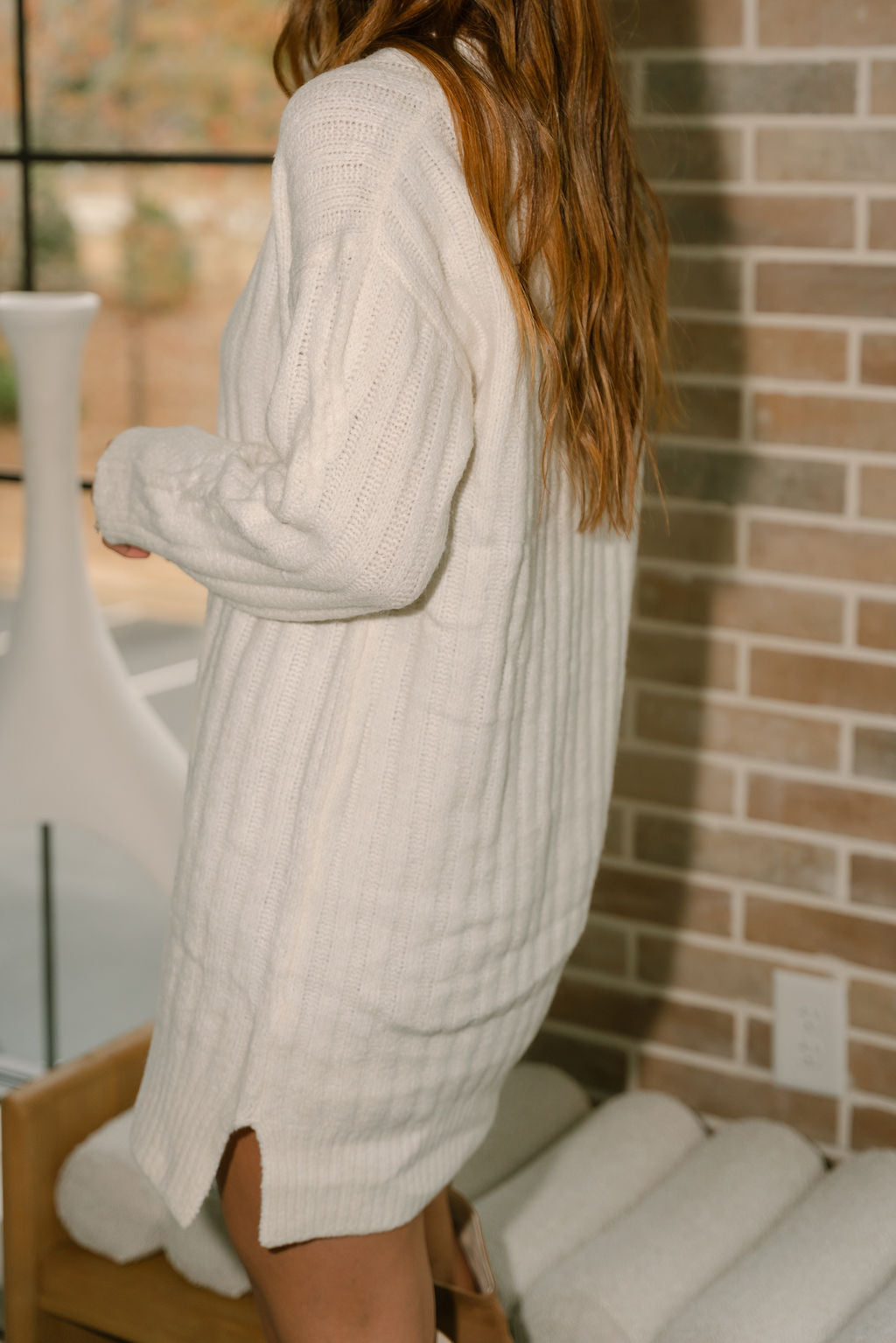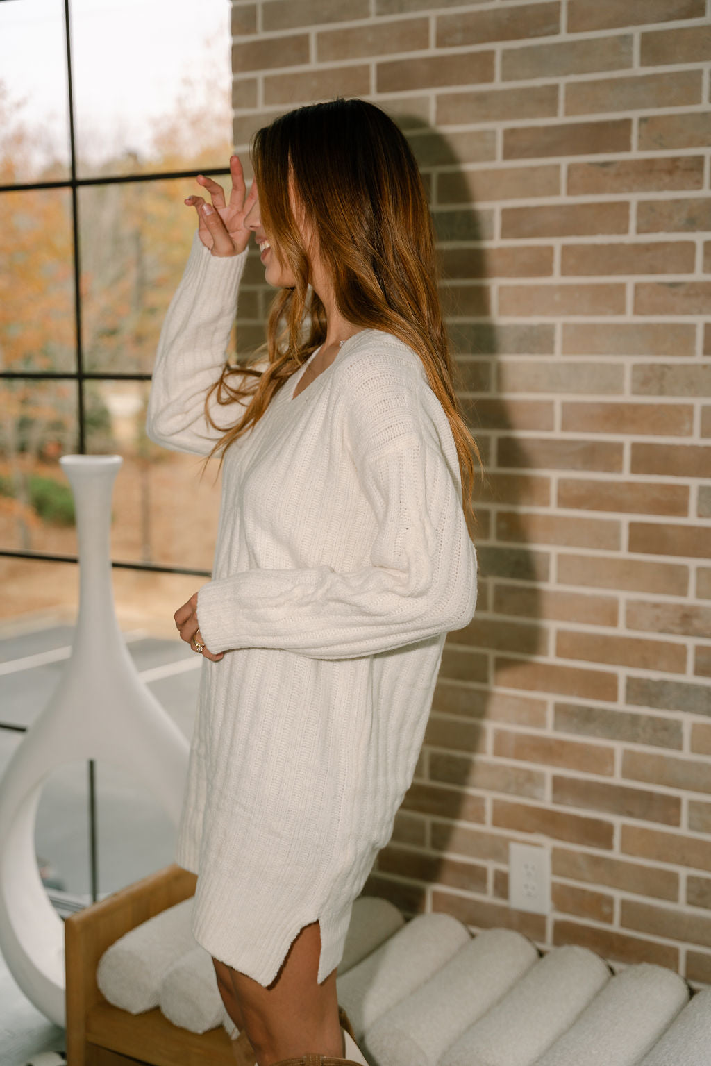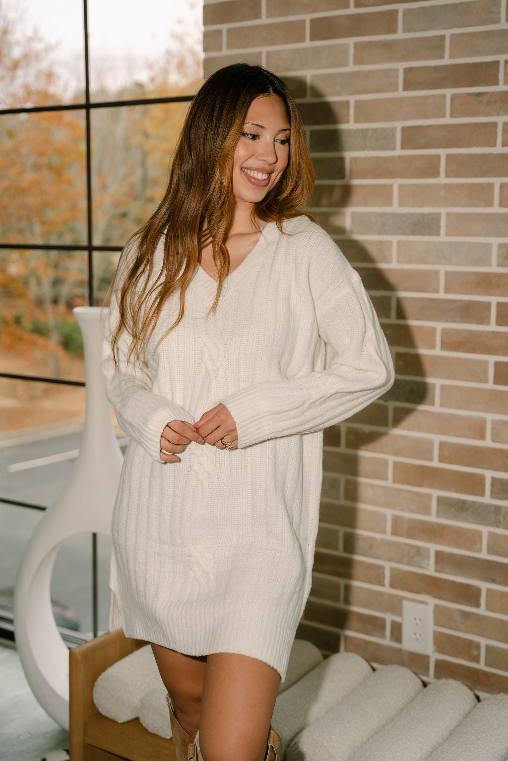 Cozy, chic, and effortlessly versatile, the Kamila Ivory Cable Knit Sweater Dress is a wardrobe must-have. Crafted from soft ivory cable knit fabric, this dress features a flattering V neckline, long sleeves, and small side slits for ease of movement. Ribbed trim adds polished detail to the relaxed silhouette.