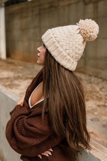 Add a cozy touch to your winter wardrobe with the Kellen Ivory Pom Pom Beanie. Made from soft ivory cable knit fabric, this beanie features a beautiful cross-stitch pattern that adds texture and style. The folded hem ensures a snug fit, while the monochrome fringe pom pom gives it a playful, trendy finish. Perfect for chilly days, this beanie is a must-have accessory to complete your cold-weather look.