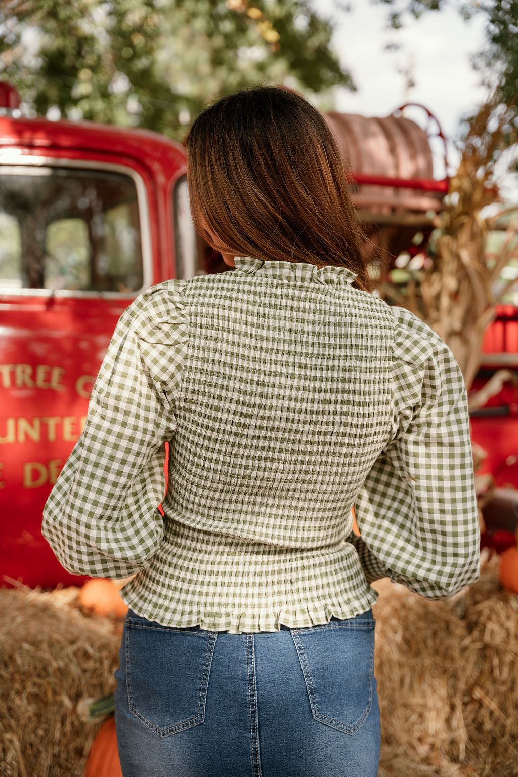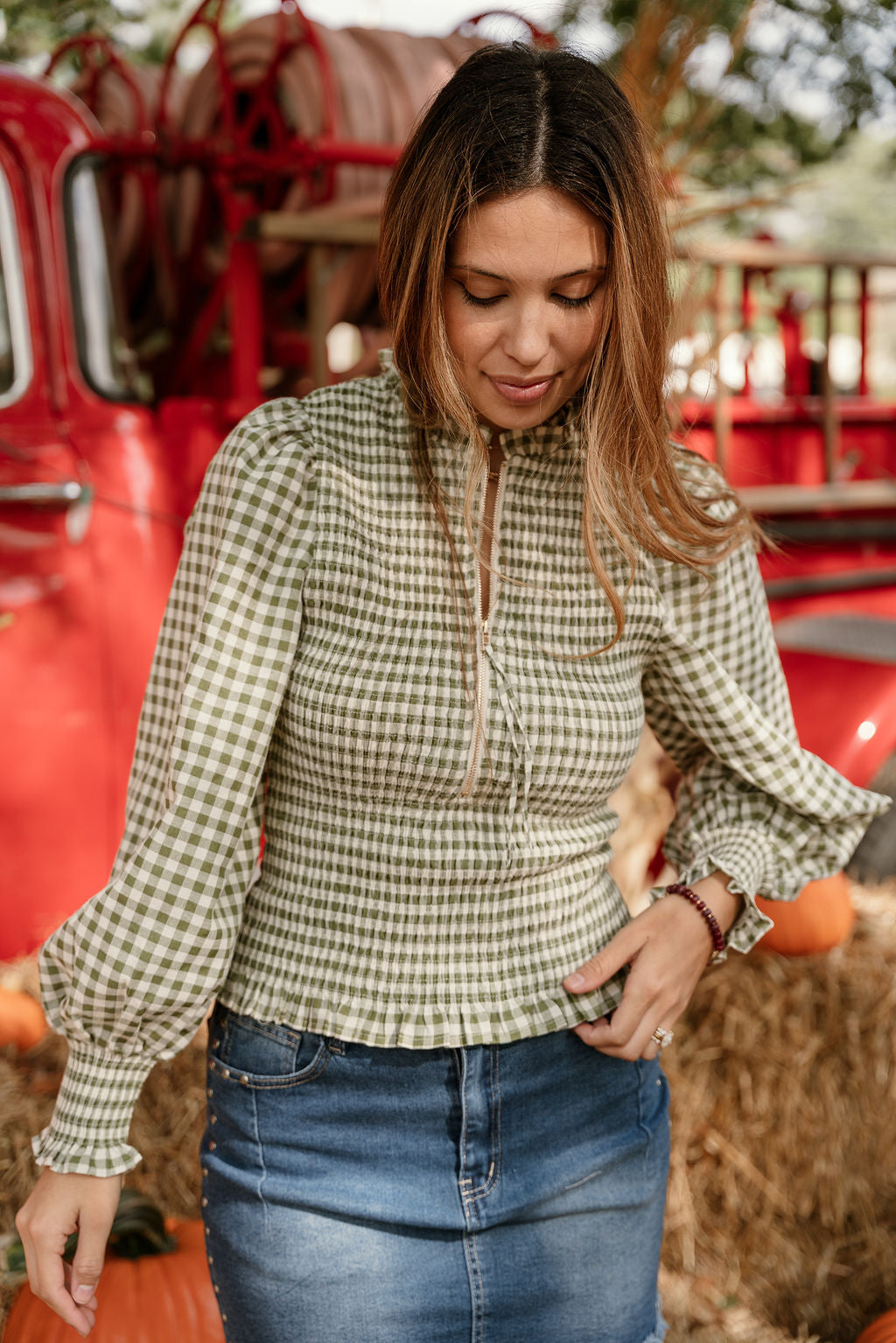 The Kennedy Olive Gingham Zip-Up Top brings playful charm and everyday ease to your wardrobe. Made from lightweight olive and white gingham fabric, this top features a smocked upper for a comfortable, flattering fit and a feminine ruffle hem that adds a soft, flowy touch.