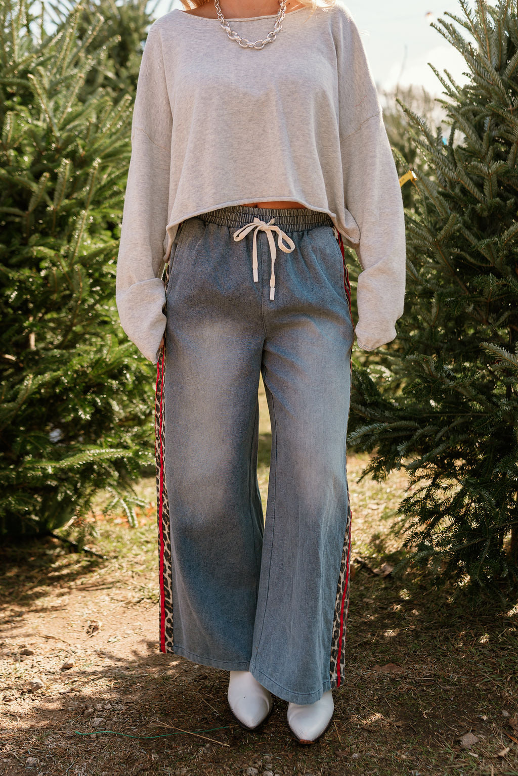 Bold, playful, and effortlessly stylish, the Khloe Cheetah & Red Denim Wide Leg Jeans bring statement-making charm to your casual wardrobe. Crafted from soft, light denim fabric, these jeans combine comfort and fashion-forward design with unique cheetah and red trim details that add a touch of edge and personality to every look.