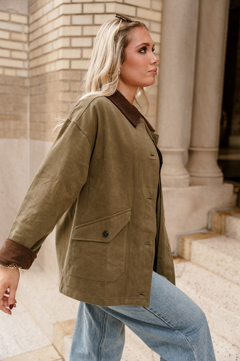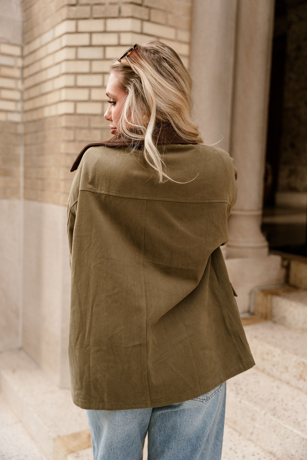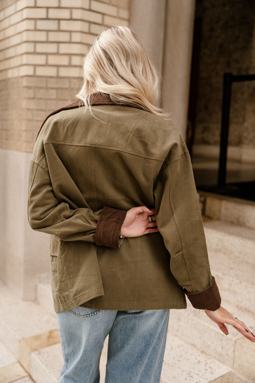Refresh your layering lineup with the effortless cool of the Kiara Olive & Brown Corduroy Collar Jacket. Crafted from soft olive-toned denim fabric, this jacket blends everyday comfort with elevated utility-inspired style. Its standout feature—a rich brown corduroy collar—adds warm contrast and timeless texture, giving this classic silhouette a modern, earthy edge.