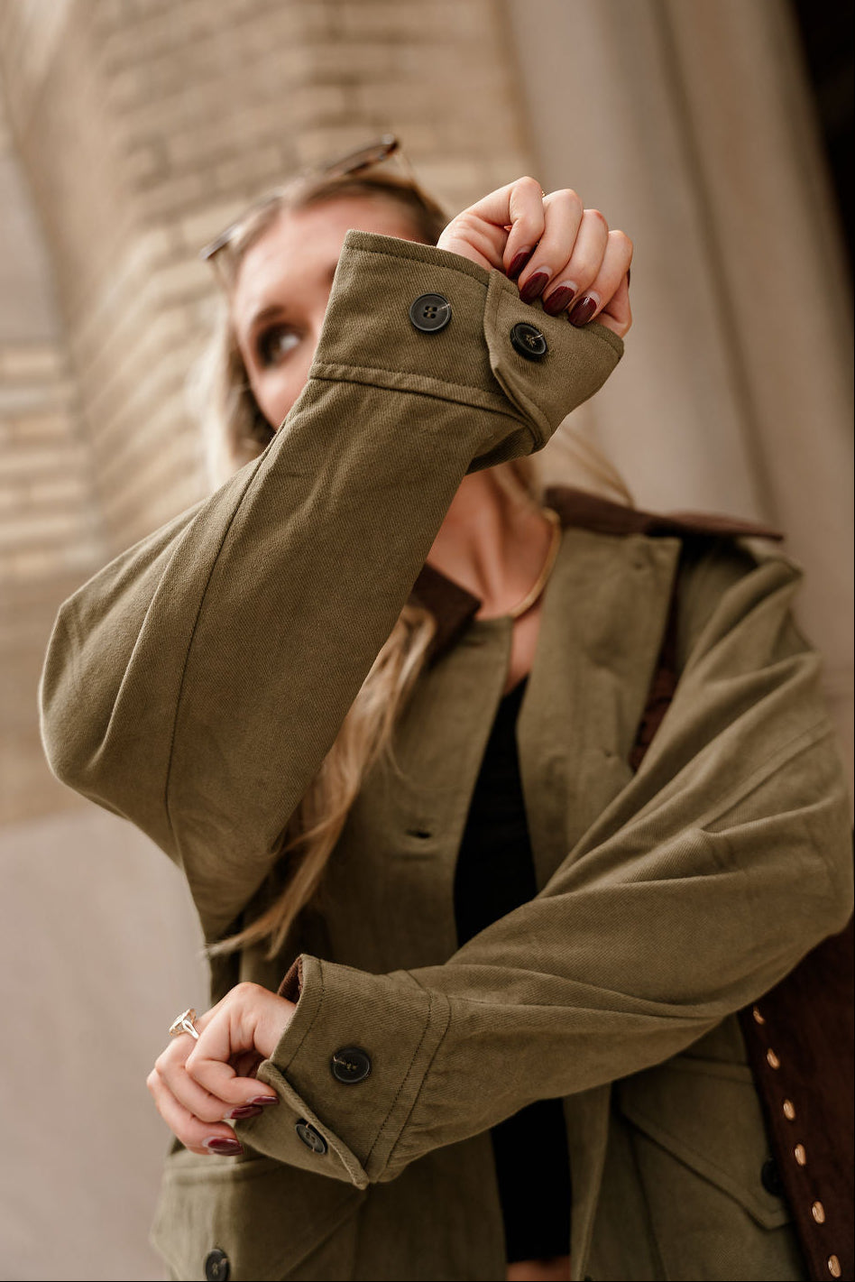 Designed with practicality in mind, the Kiara features a front button-up closure and buttoned front pockets that are both functional and stylish. Long sleeves with buttoned cuffs offer an adjustable fit, making it easy to roll, cuff, or wear structured depending on your look.