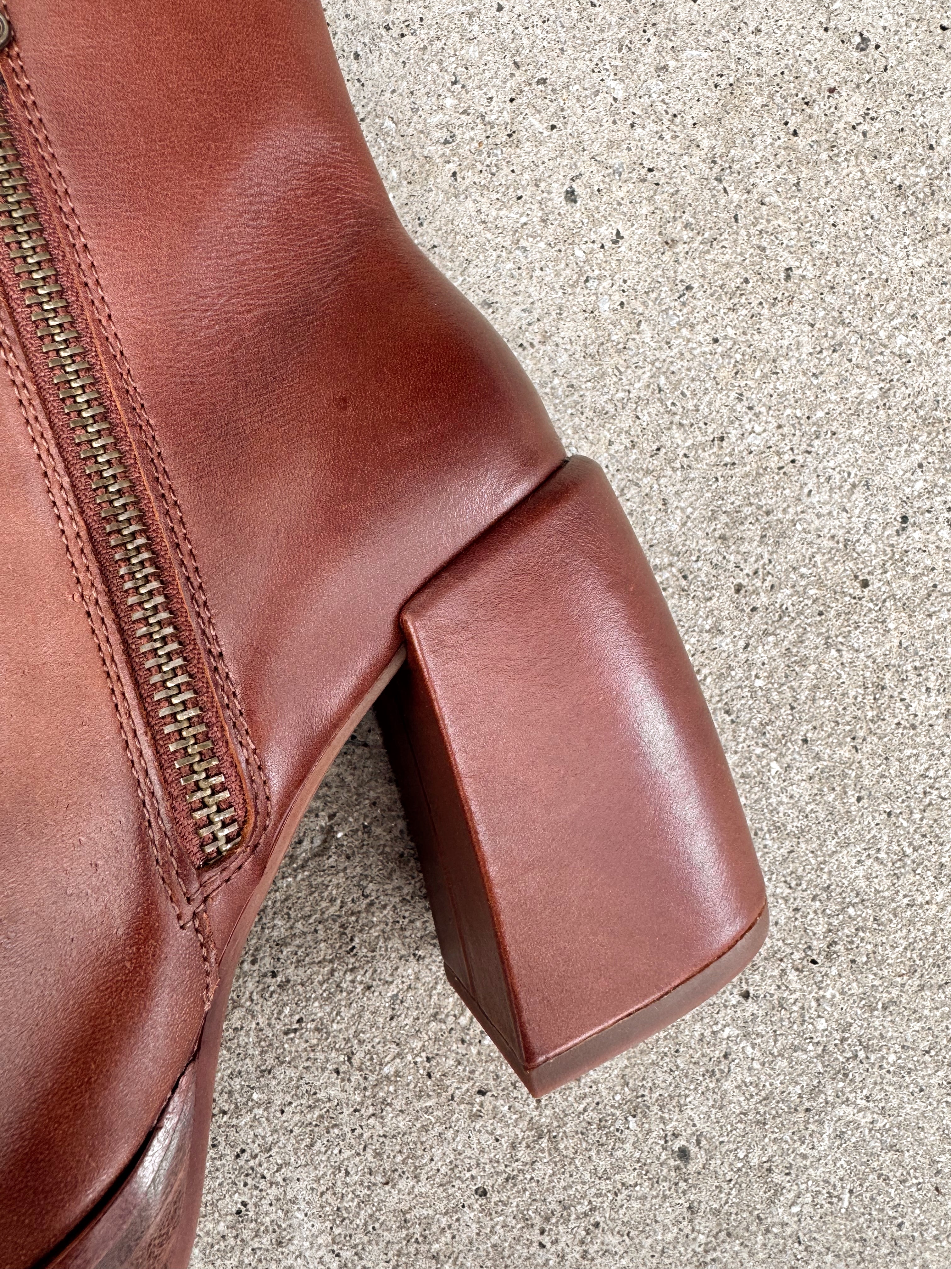Step up your style with the Kork-Ease Aime Rust Platform Boot. Crafted from rich brown leather, this boot features a breathable micro-suede lining for all-day comfort. Designed with a 3 ⅔-inch covered block heel, ¾-inch platform, and 4 ¾-inch shaft height, it combines height and stability effortlessly. Perfect for elevating both casual and dressy looks with ease.