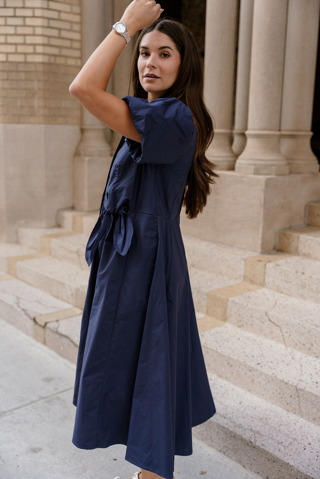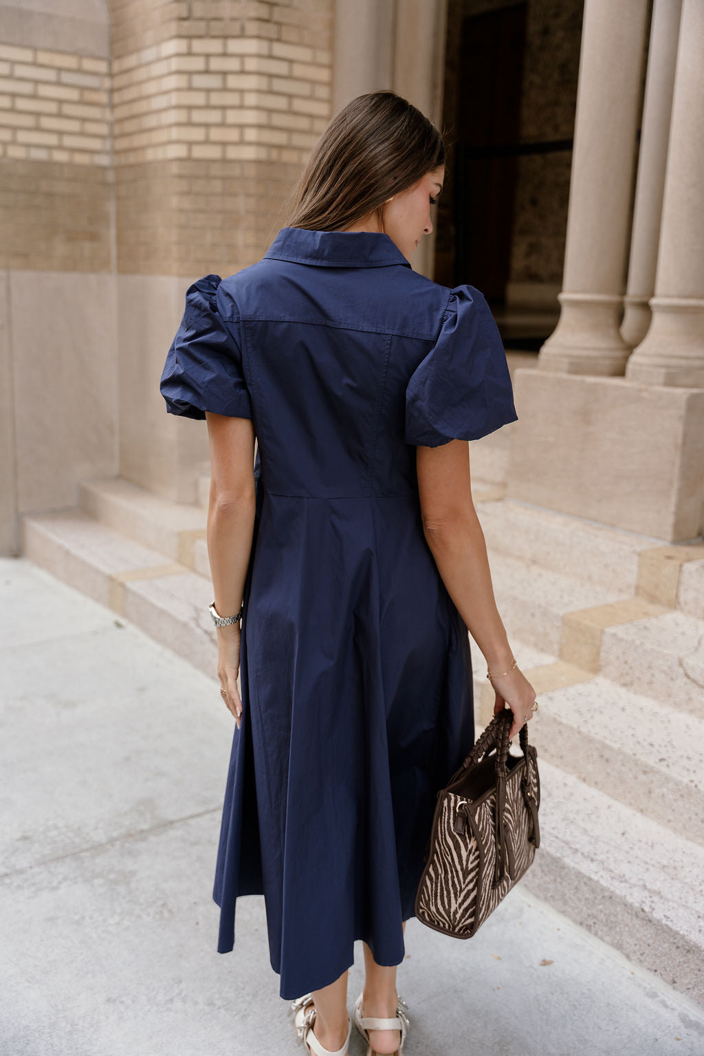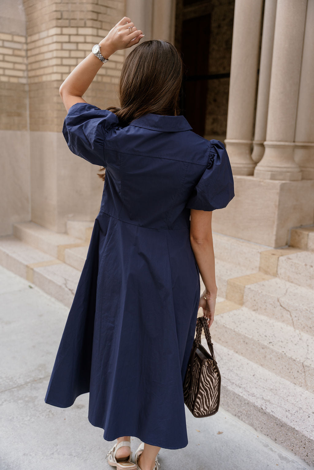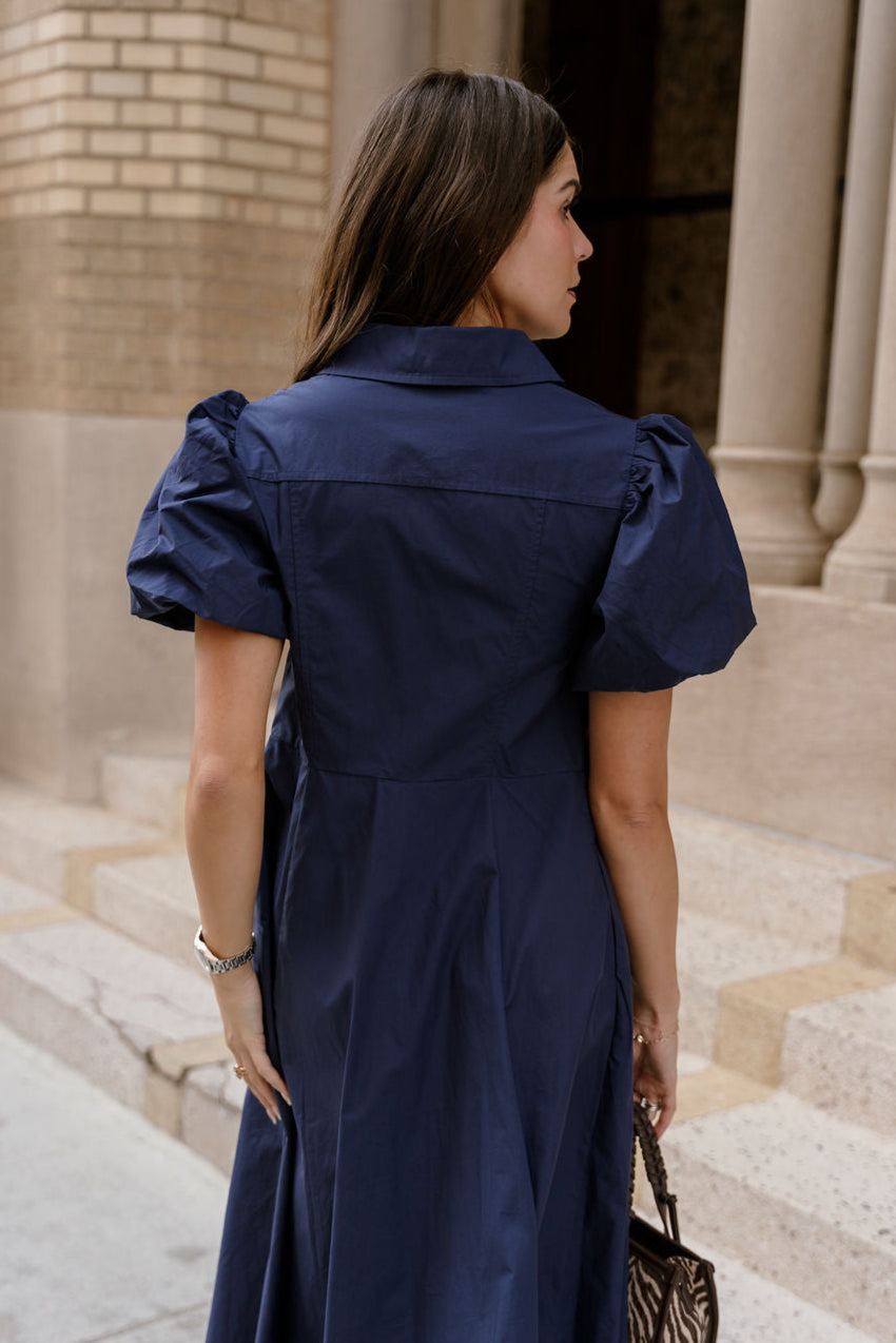 Perfect for workdays, brunch dates, or casual evenings out, the Lara Navy Short Sleeve Midi Dress combines comfort with sophistication. The side pockets bring practicality, and the short puff sleeves give it a soft, romantic finish. Pair it with loafers or block heels to complete the look.