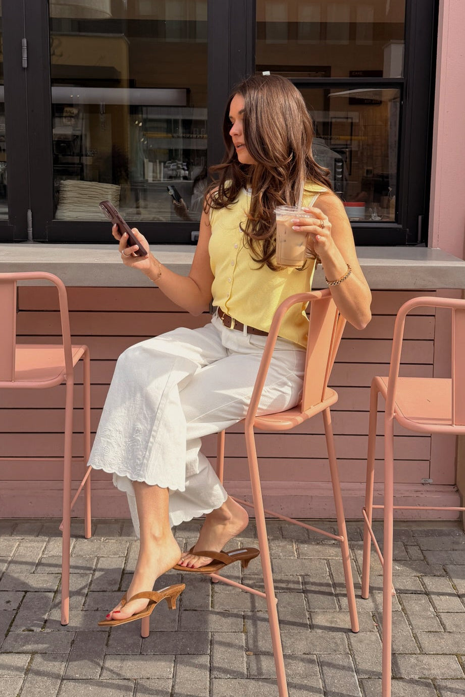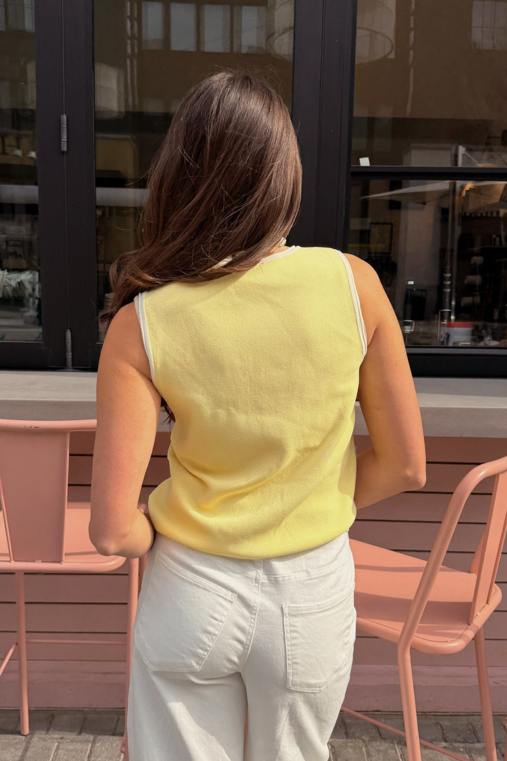 Bright, cheerful, and effortlessly stylish, the Laurel Yellow Button-Up Tank Top is a wardrobe staple for sunny days and casual layering. Crafted from soft, light yellow ribbed fabric, this sleeveless tank offers a flattering, comfortable fit that moves with you. The front button-up design adds a polished touch, while white trim details provide subtle contrast and elevated style. A classic round neckline completes the clean, versatile silhouette.