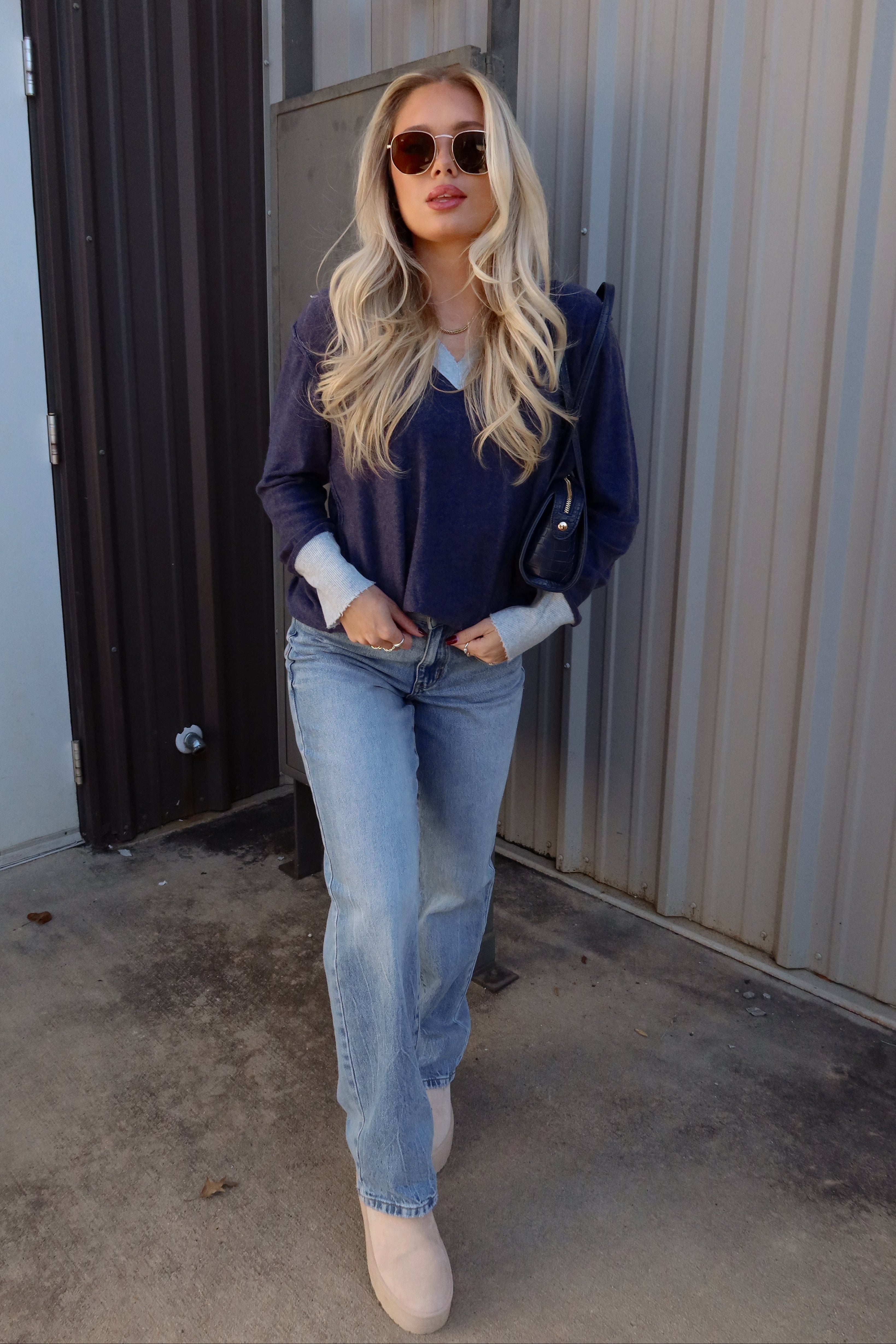 Soft, effortless, and beautifully detailed, the Layla Blue Knit Long Sleeve Sweater is the perfect everyday layer. Crafted from cozy denim blue knit fabric, this sweater offers a relaxed yet polished feel that transitions seamlessly from weekday errands to weekend lounging. Light blue trim details add a subtle contrast, elevating the look with a touch of refined charm. The flattering v-neckline creates an easy, feminine silhouette, while the long sleeves keep you warm and comfortable. Pair it with denim, leggings, or a flowy skirt for a laid-back style that still feels thoughtfully put together.