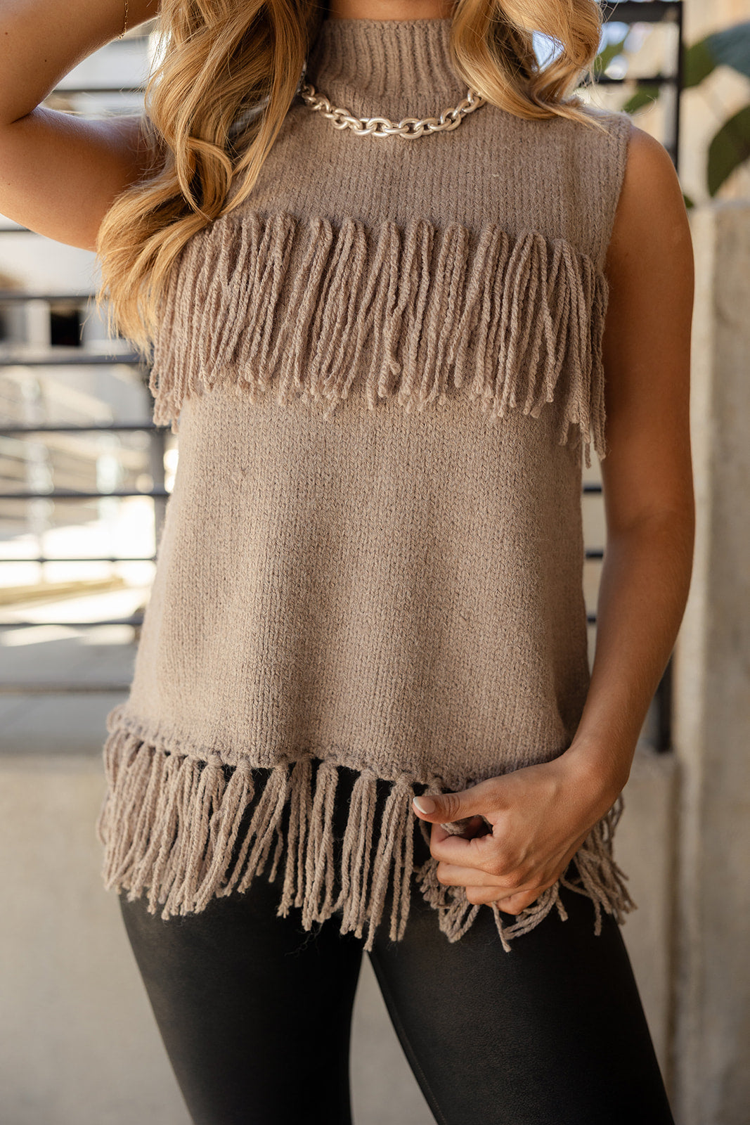 Playful texture meets everyday style. The Leah Taupe Fringe Knit Tank is crafted from soft taupe knit fabric with a flattering high neckline and sleeveless cut for a modern, effortless look. Fringe detailing adds movement and a fun, unique finish — perfect for layering or wearing as a standout piece on its own. A versatile top that brings a touch of personality to any outfit.