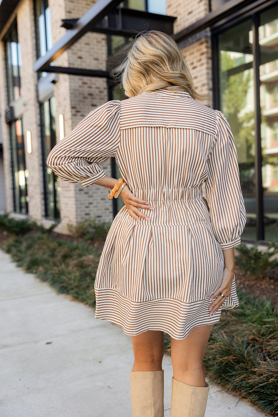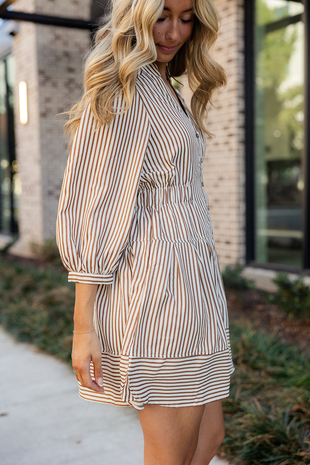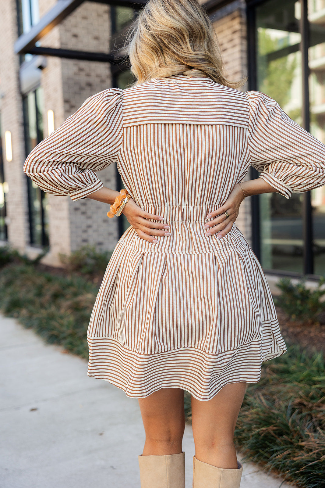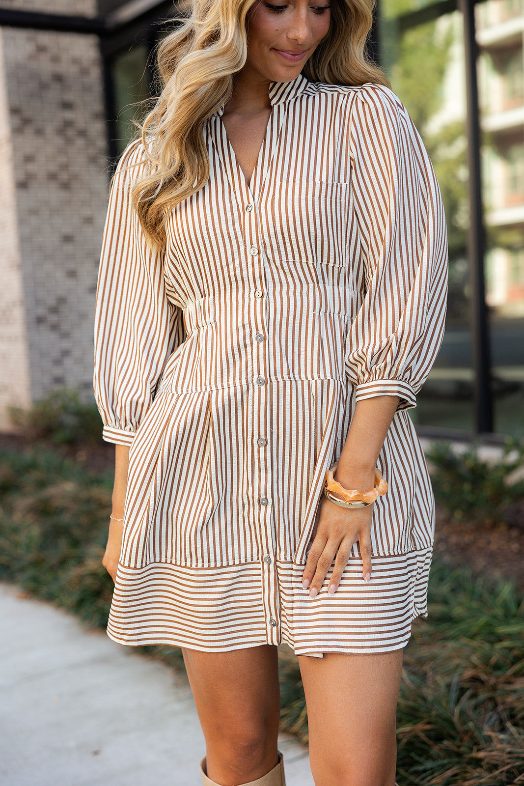 Casual charm meets everyday versatility in the Leia Brown & Cream Stripe Mini Dress. Crafted from lightweight brown and cream fabric with a classic stripe print and matching cream lining, this mini features a flattering v-neckline, long sleeves, and a full front button-up closure. Chest pockets and side pockets add functional detail, making it both stylish and practical. Perfect for transitional seasons, it’s an effortless choice for polished daytime looks.