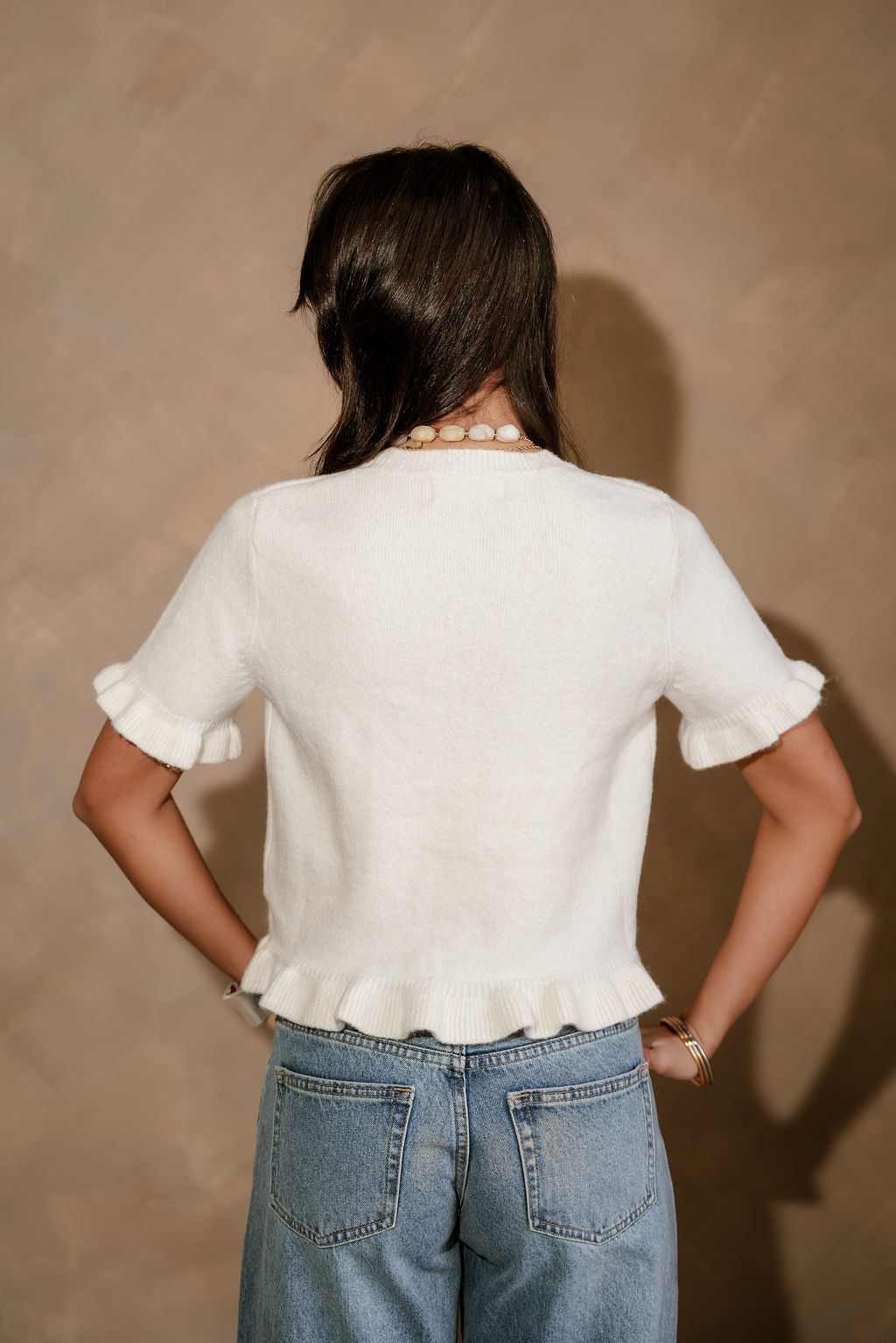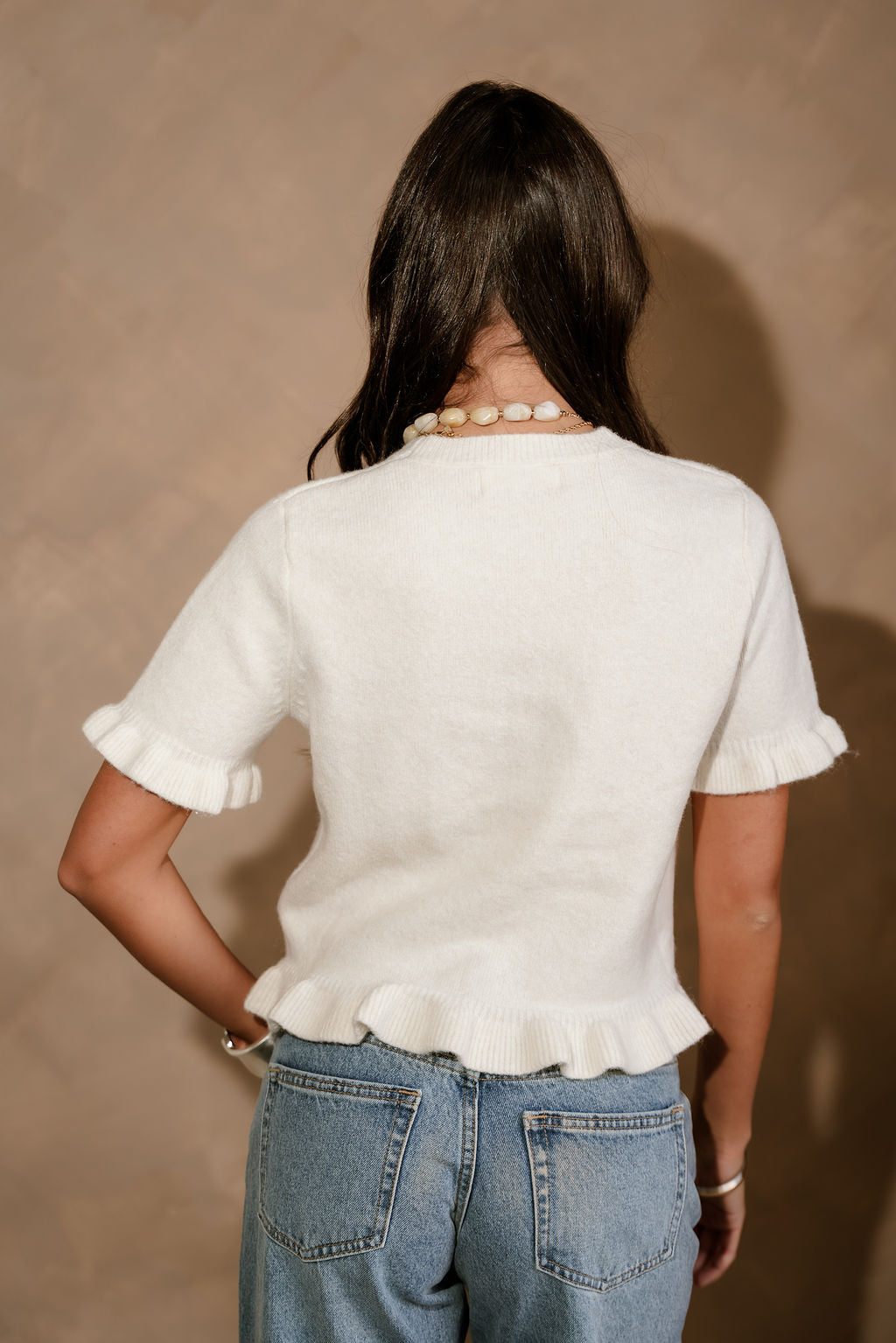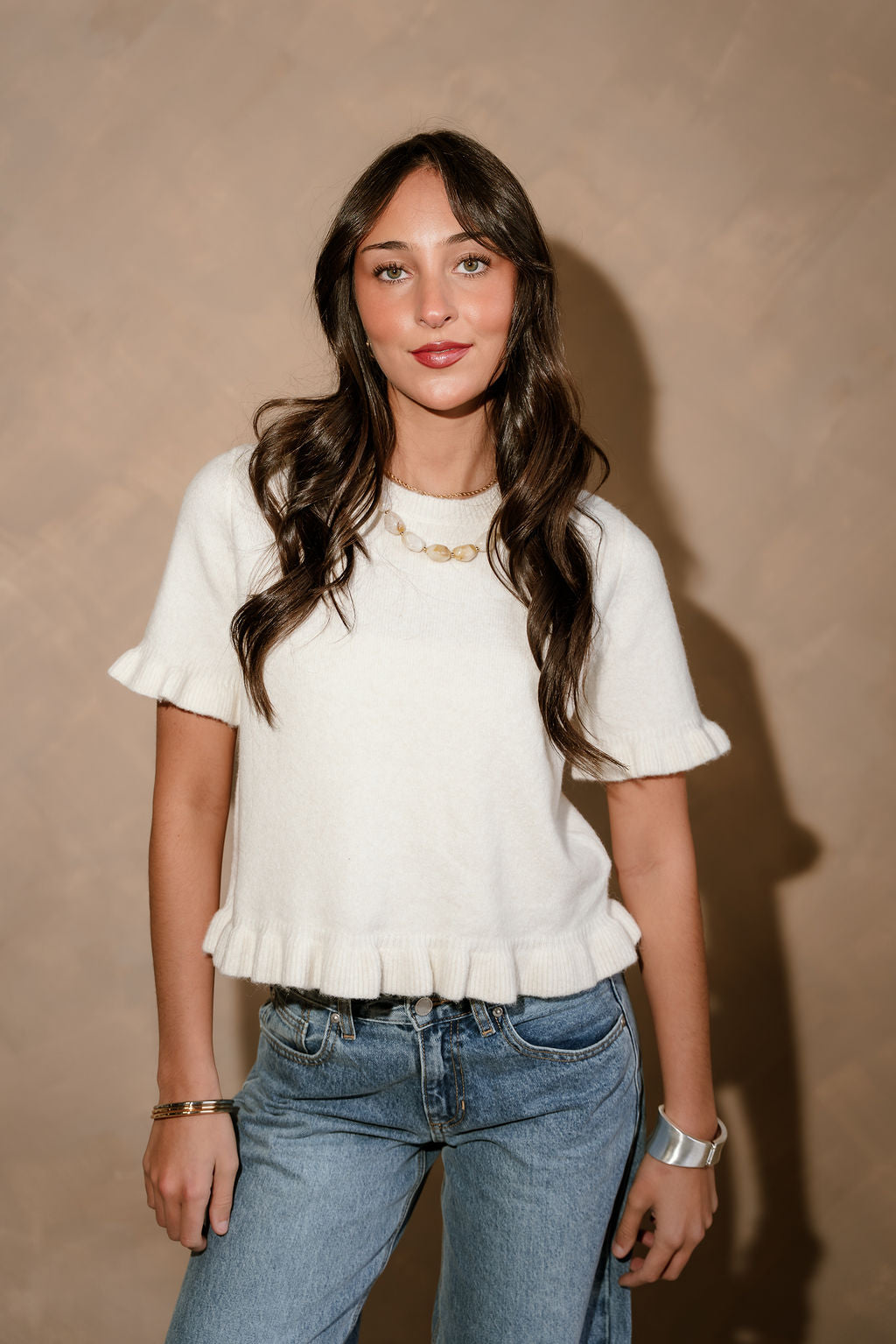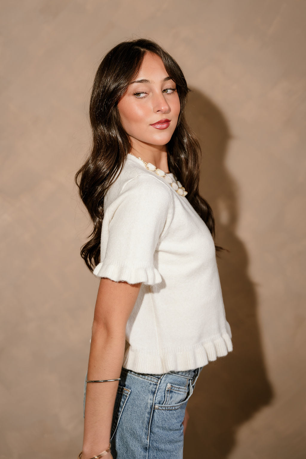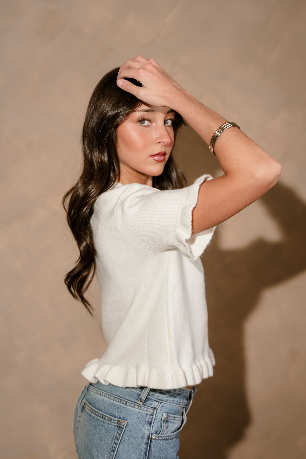 The Leigh Off White Ruffled Short Sleeve Sweater is a soft, feminine piece that adds an elevated touch to your everyday wardrobe. Made from off white knit fabric, this sweater features a classic round neckline and delicate ruffle hem details that bring subtle texture and charm to a timeless silhouette. The short sleeves keep the look light and versatile for transitional seasons.