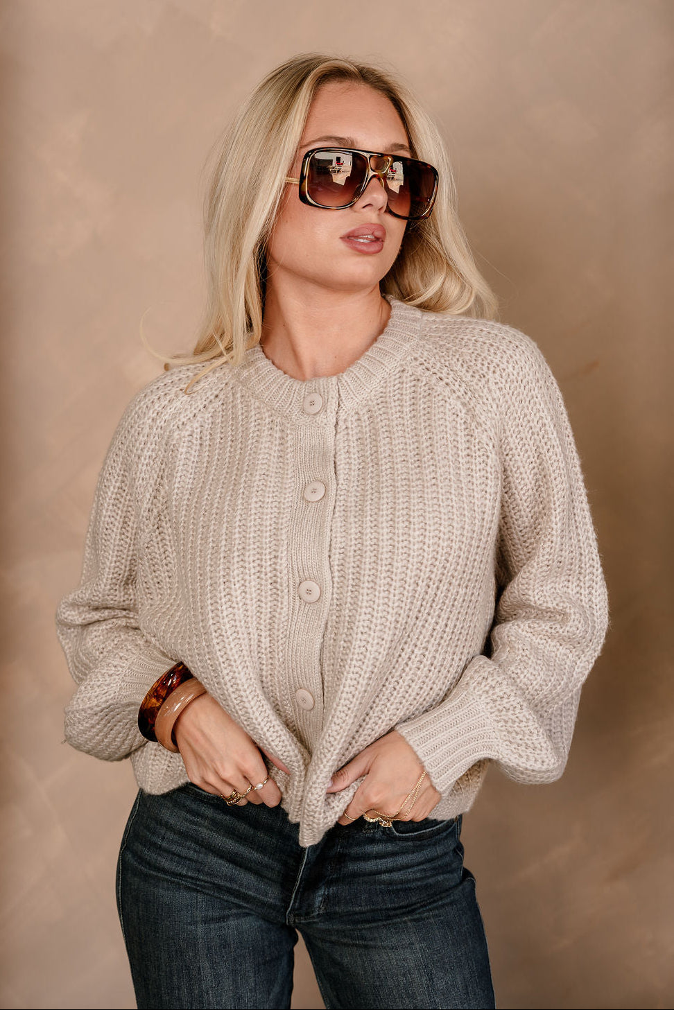 Charming and cozy, the Leighton Light Mocha Cable Knit Cardigan brings a touch of warmth and texture to your look. Made from soft light mocha cable knit fabric, it features a classic round neckline, front button-up closure, and long balloon sleeves for a feminine, relaxed silhouette. Perfect for layering over your favorite tops for an effortlessly chic finish.