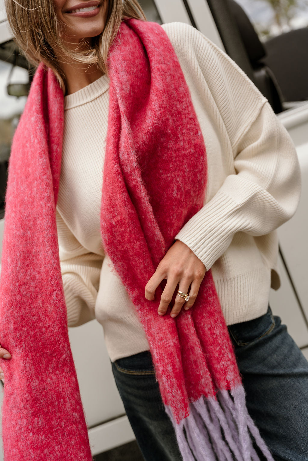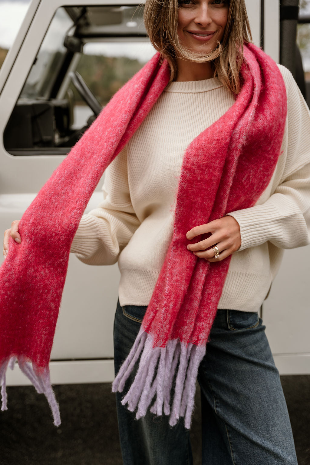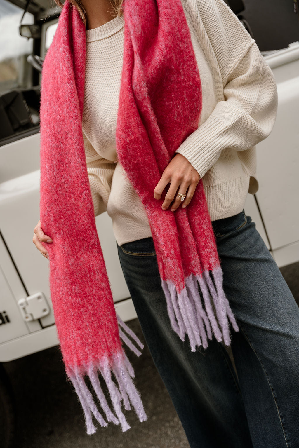The Leighton Red & Purple Fringe Scarf adds a vibrant pop of color and cozy softness to your winter wardrobe. Crafted from brushed knit fabric in a rich red hue, this oversized scarf is designed for ultimate comfort and warmth. Light lavender fringe details at the ends add a fun, feminine touch that contrasts beautifully with the bold red base.