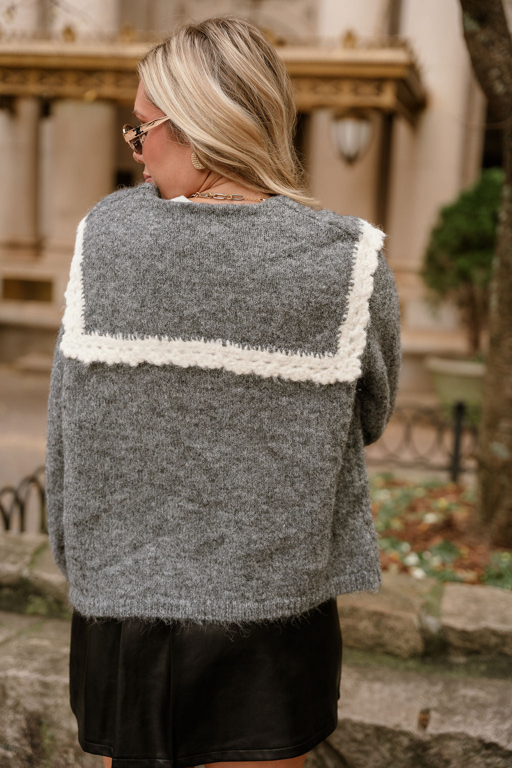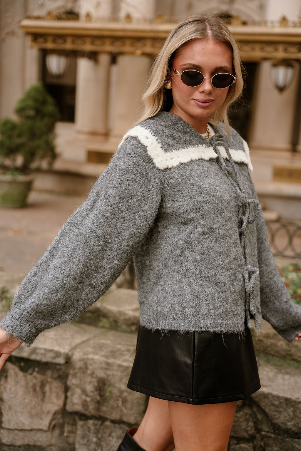 Chic meets cozy in the Leila Grey & Cream Collar Cardigan, a beautifully detailed knit that elevates everyday layering. Crafted from soft heather grey fabric, this cardigan delivers a warm, comfortable feel with a timeless look. Cream trim details add a striking contrast, highlighting the silhouette and giving the piece a refined, feminine finish.