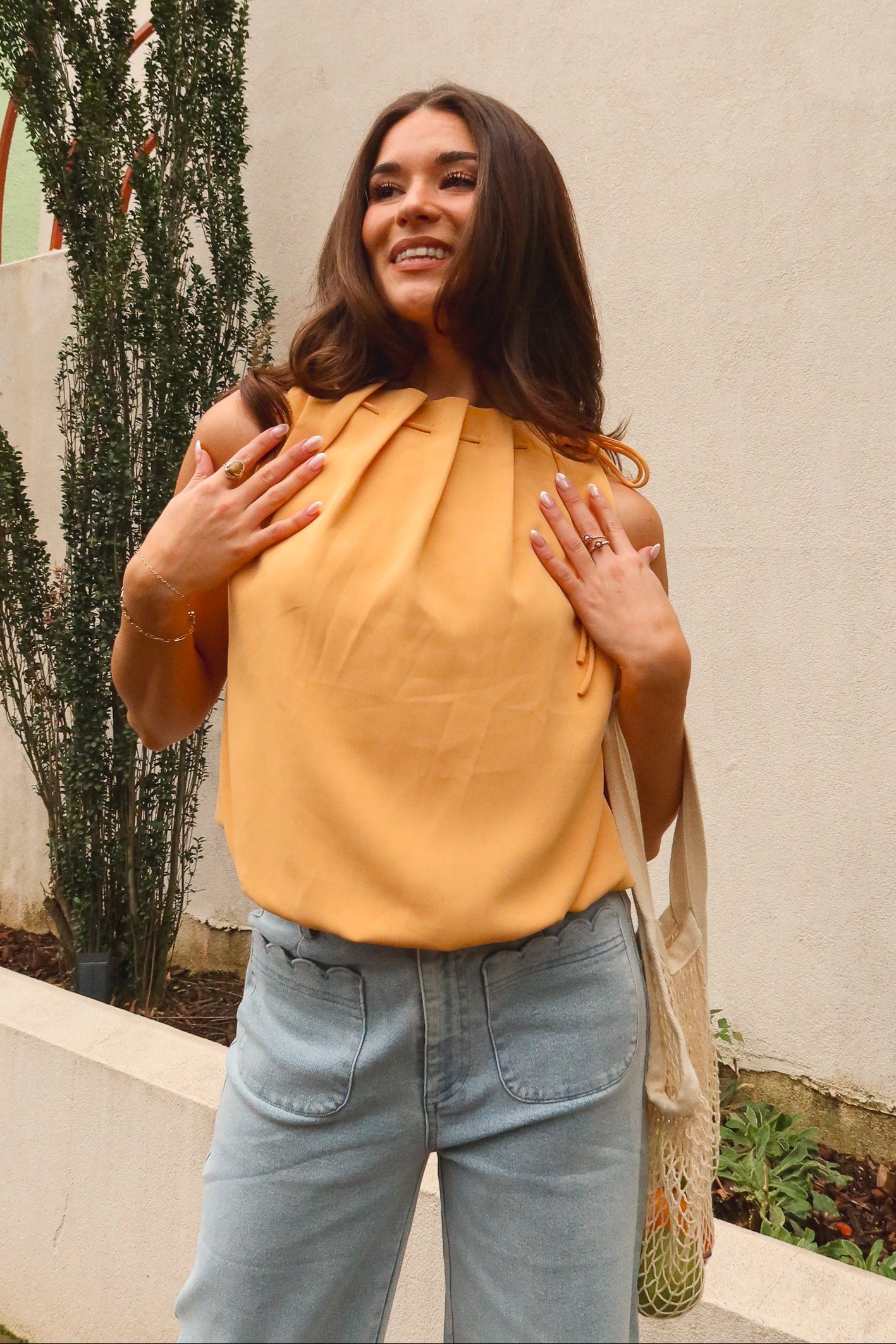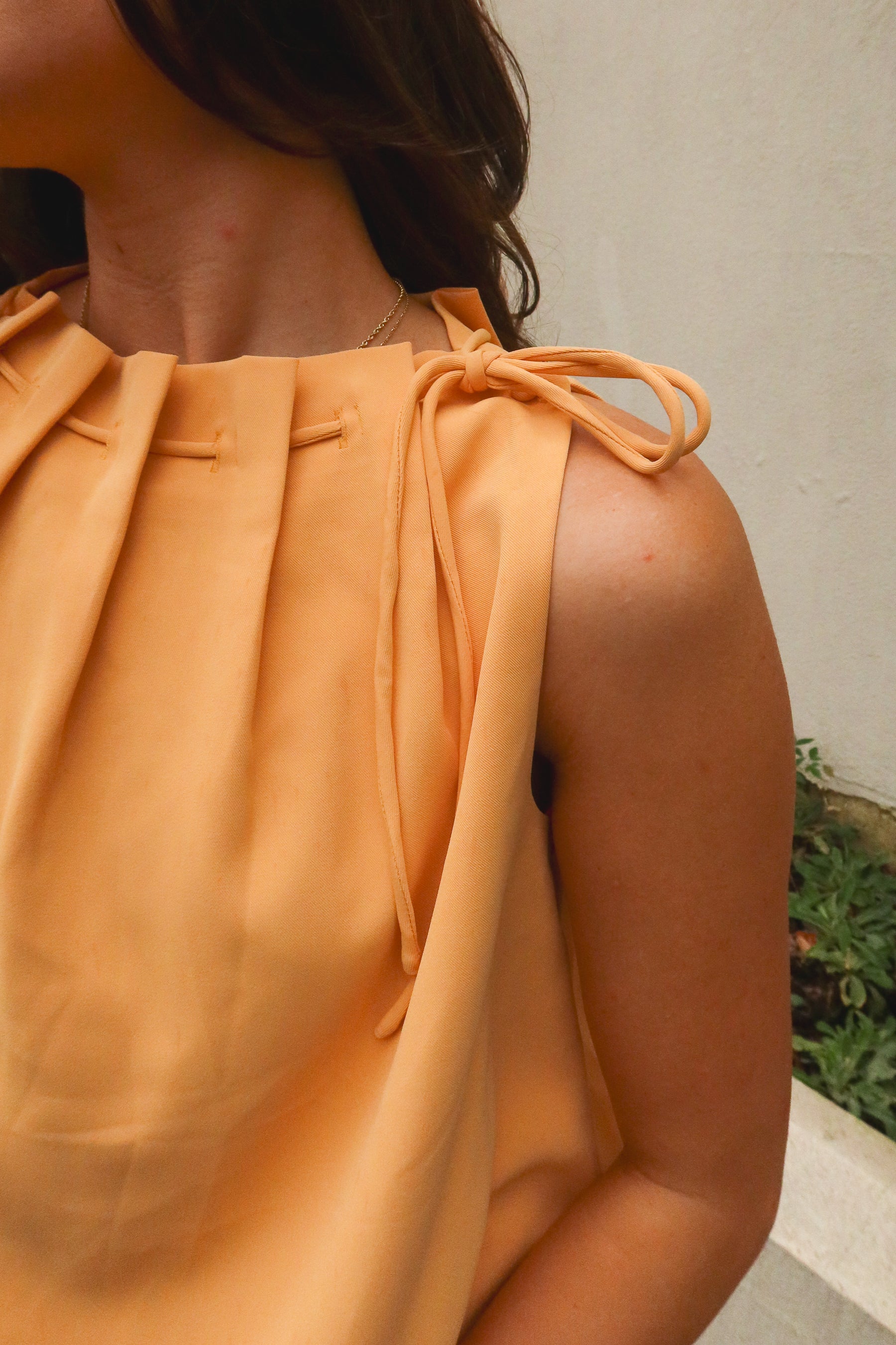 The high pleated neckline adds elegant texture and dimension, finished with a delicate tie detail for a sophisticated touch. A soft bubble hem creates subtle volume, giving the silhouette a flattering, modern shape. The sleeveless design keeps it cool and versatile for warm days or layered looks.