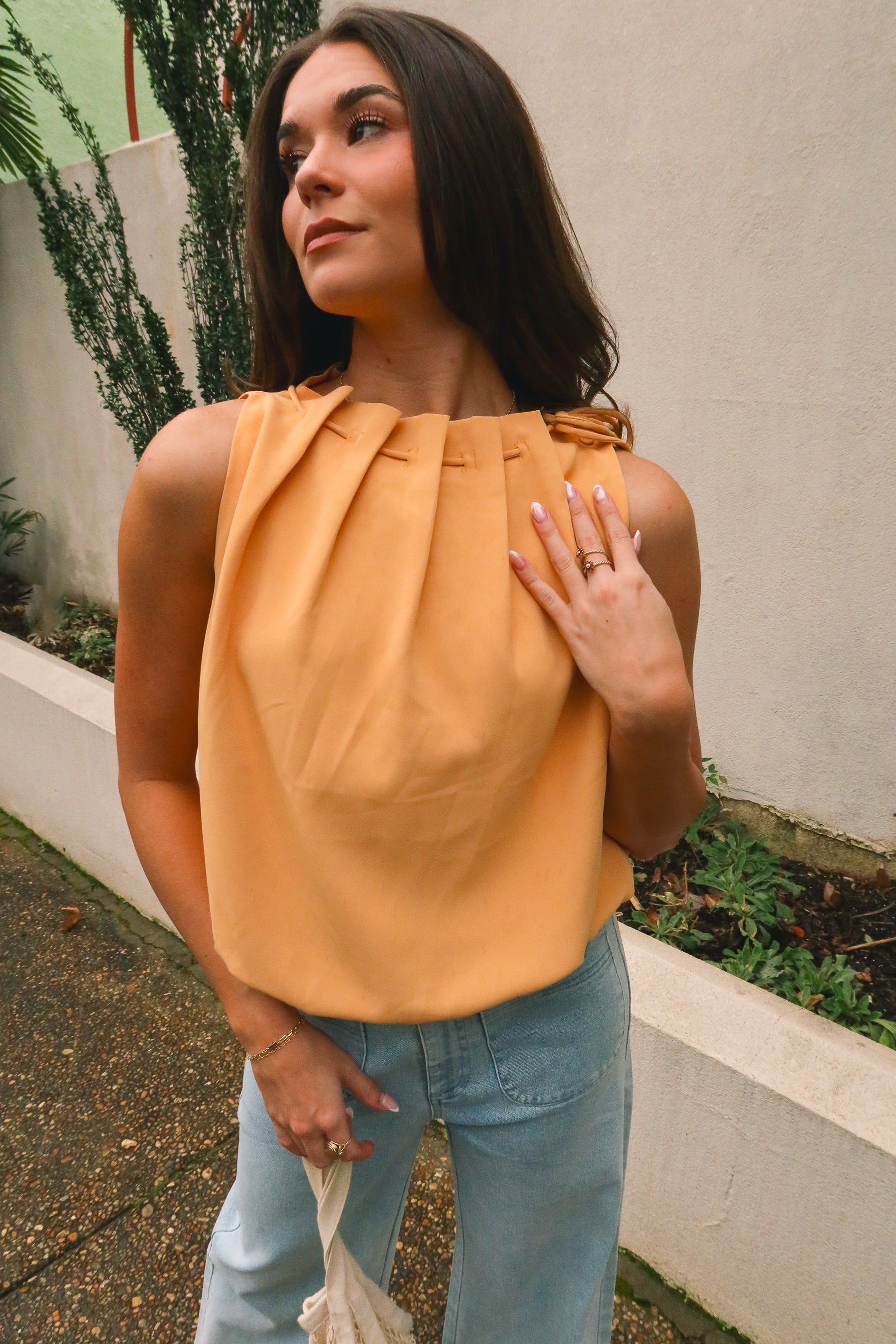 Vibrant yet refined, the Leila Orange Bubble High Neck Tank brings a fresh pop of color to your wardrobe. Crafted from muted orange lightweight fabric, this breezy style feels airy and polished all at once.