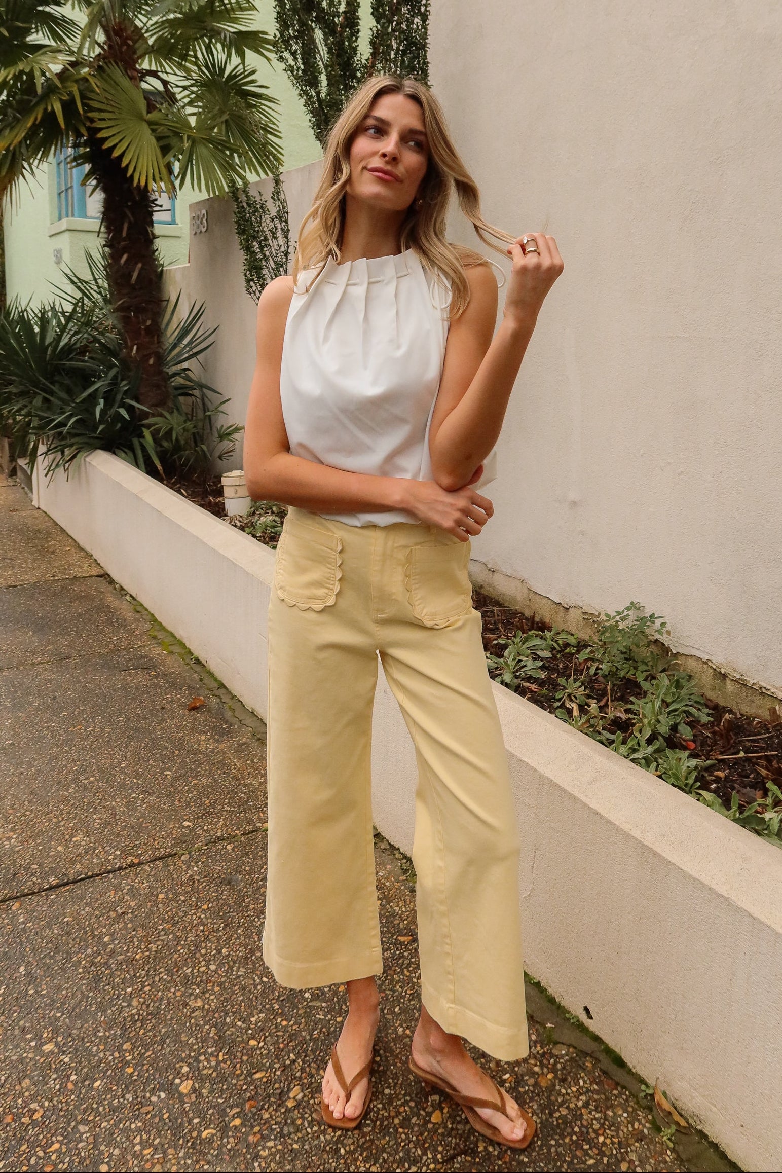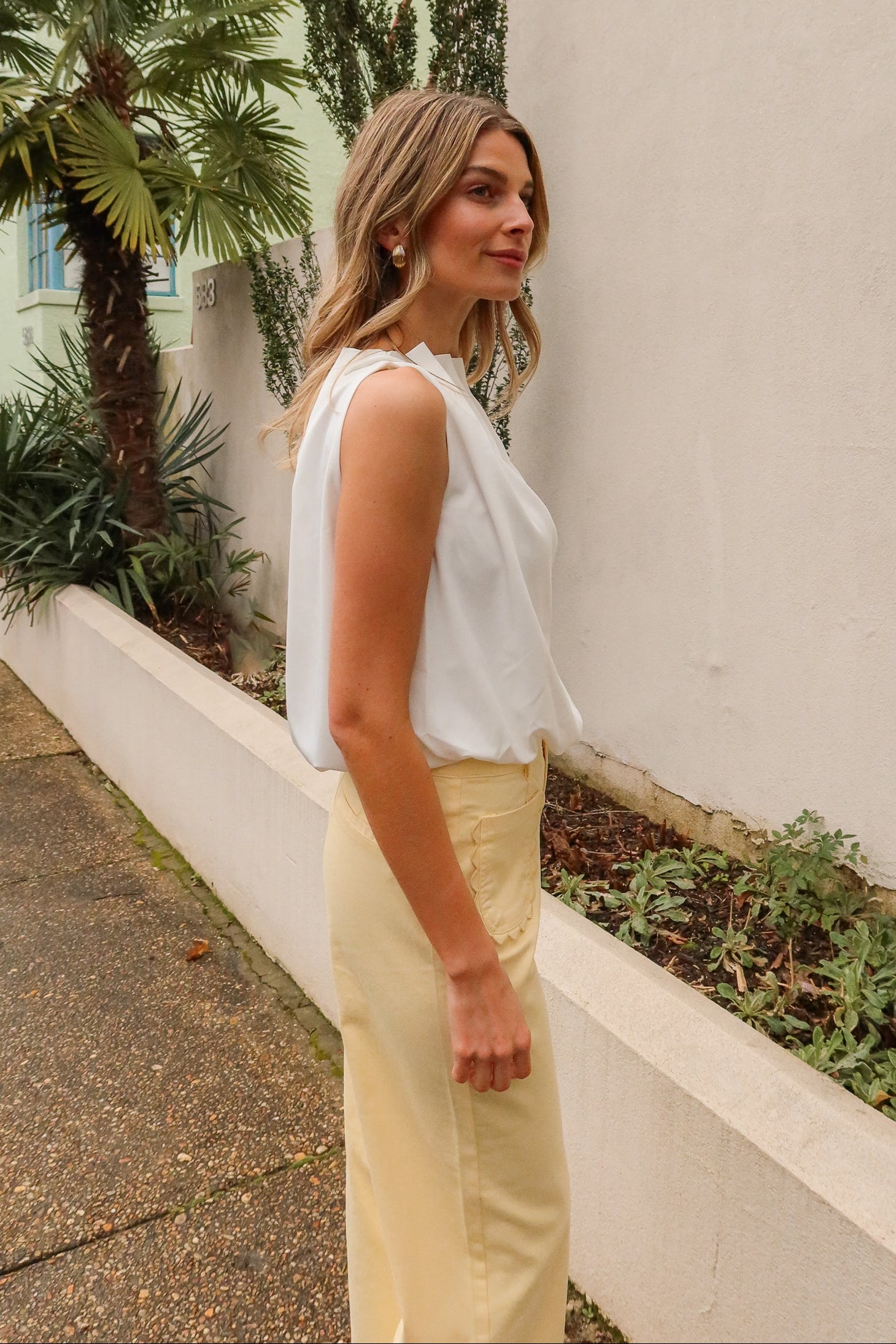 The high pleated neckline creates beautiful texture and dimension, finished with a delicate tie detail for an elevated touch. A subtle bubble hem adds soft volume and shape, giving the silhouette a flattering, contemporary feel. Sleeveless and easy to style, this tank transitions seamlessly from daytime chic to evening elegance.