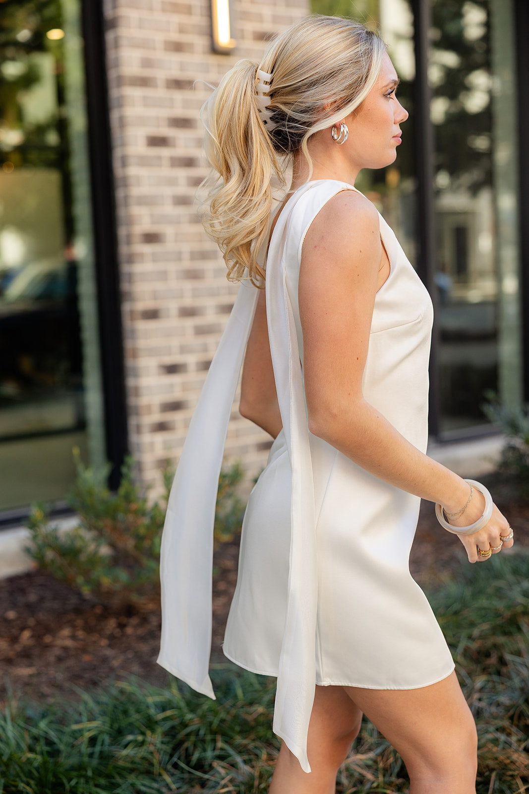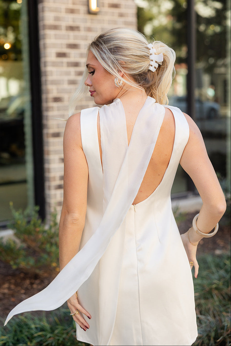 Delicate, chic, and effortlessly feminine, the Lena Ivory Satin Scarf Tie Mini Dress is perfect for making a statement. Crafted from smooth ivory satin with matching lining, this sleeveless mini features a high neck with an elegant bow tie, an open back, and a back zipper closure for a tailored fit. Flirty and versatile, it’s ideal for date nights, parties, or any occasion that calls for timeless sophistication.